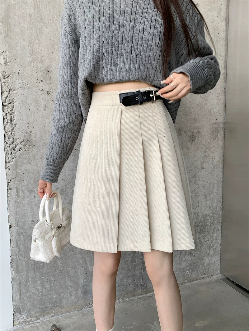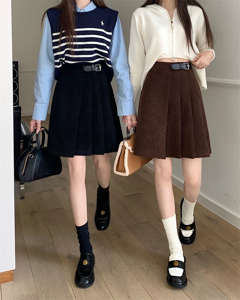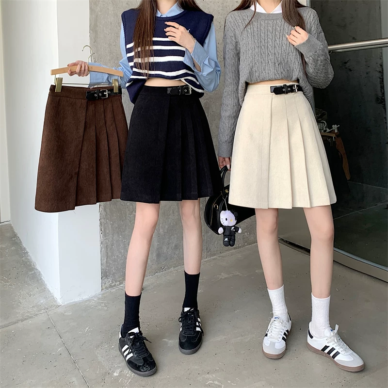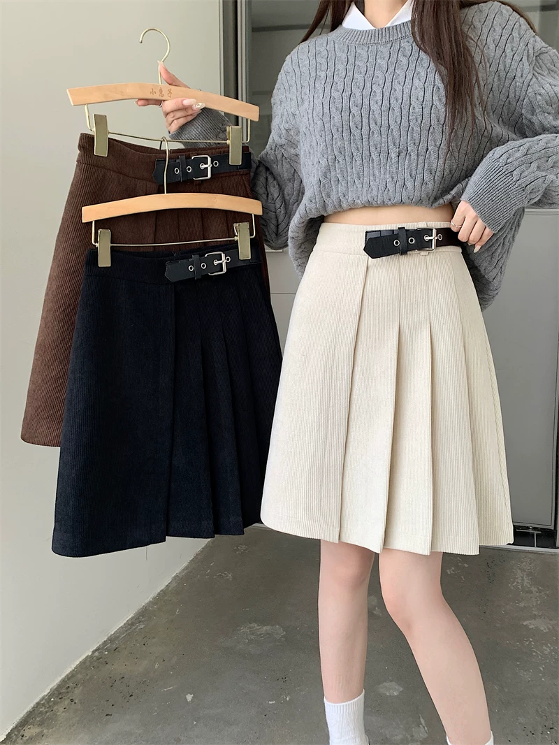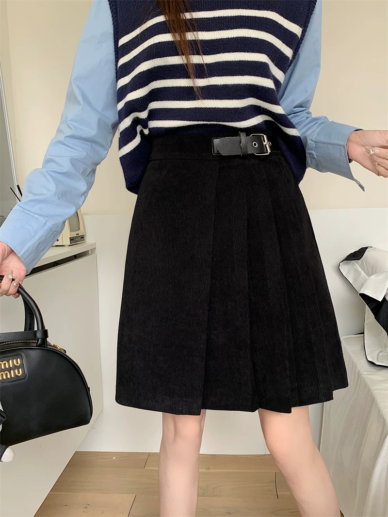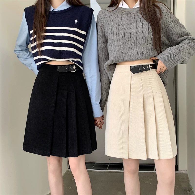 Váy nhung kẻ lưng cao dành cho nữ, mùa thu đông, cỡ lớn, váy ngắn chữ A thon gọn, màu cà phê, váy ôm sát, váy xếp ly không đều.
