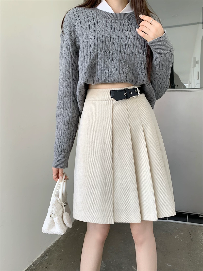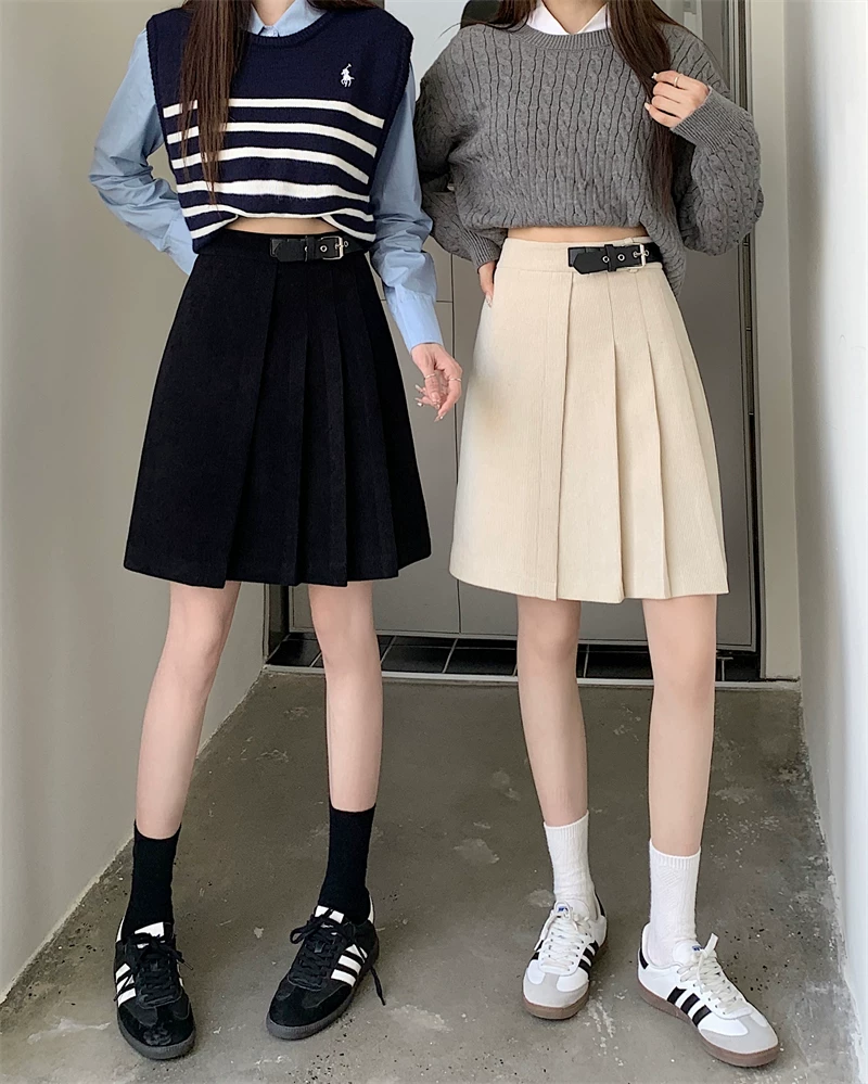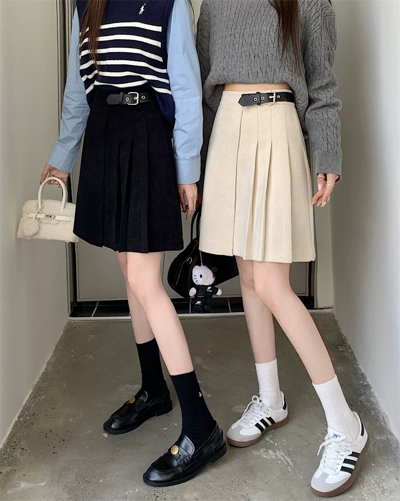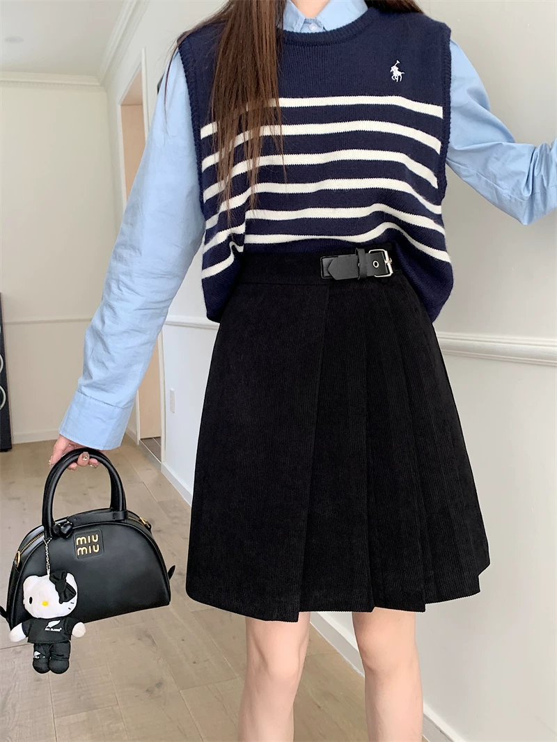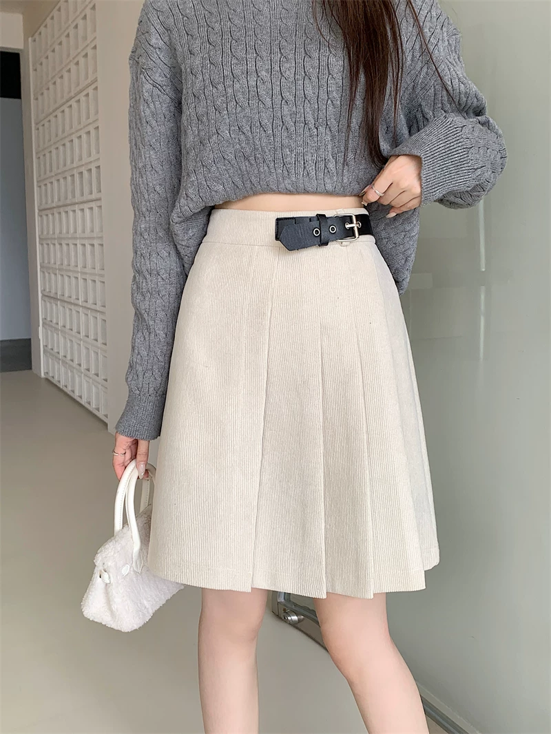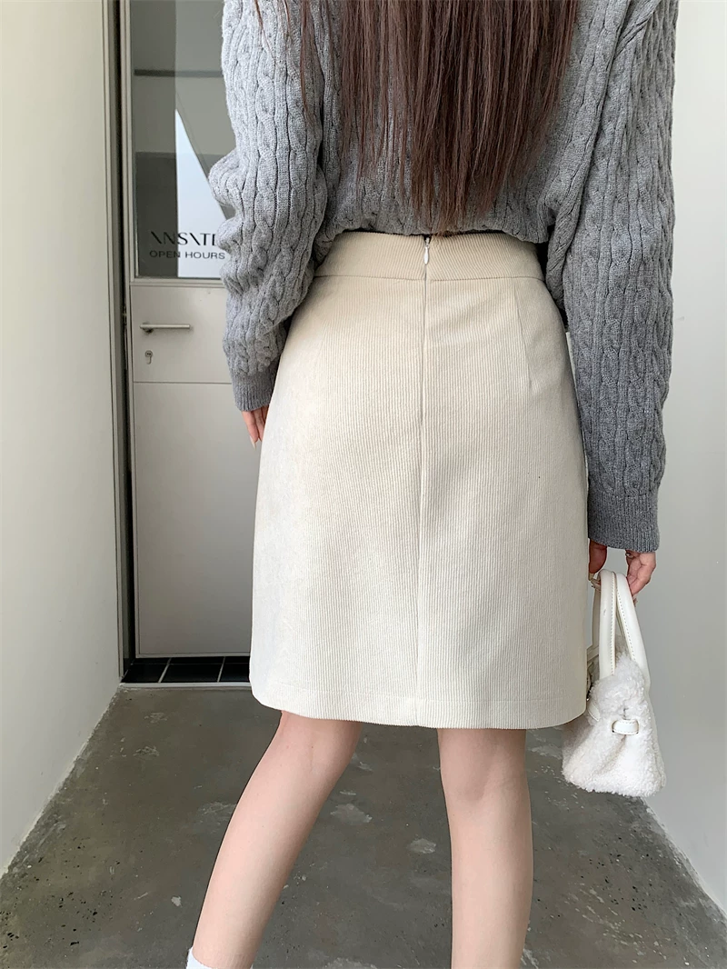 Váy nhung kẻ lưng cao dành cho nữ, mùa thu đông, cỡ lớn, váy ngắn chữ A thon gọn, màu cà phê, váy ôm sát, váy xếp ly không đều.