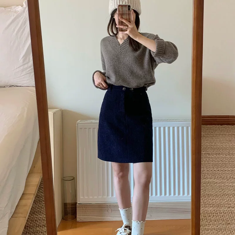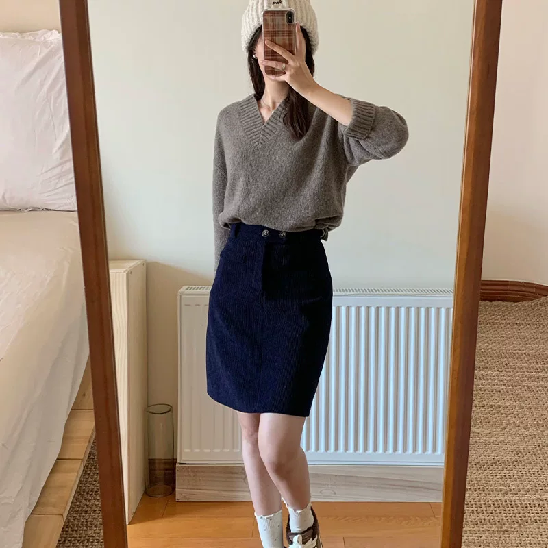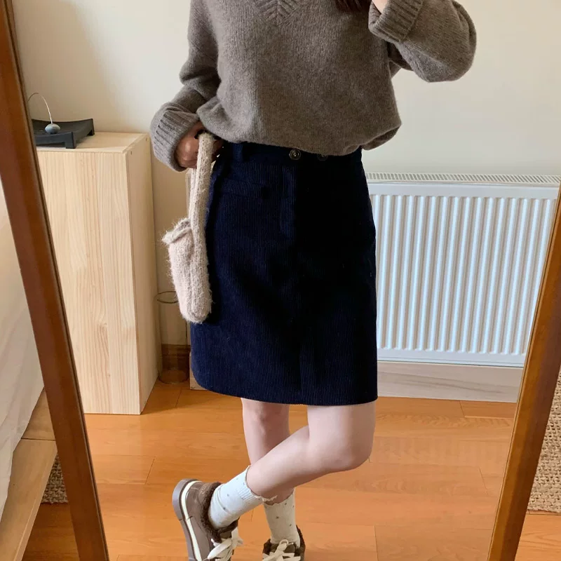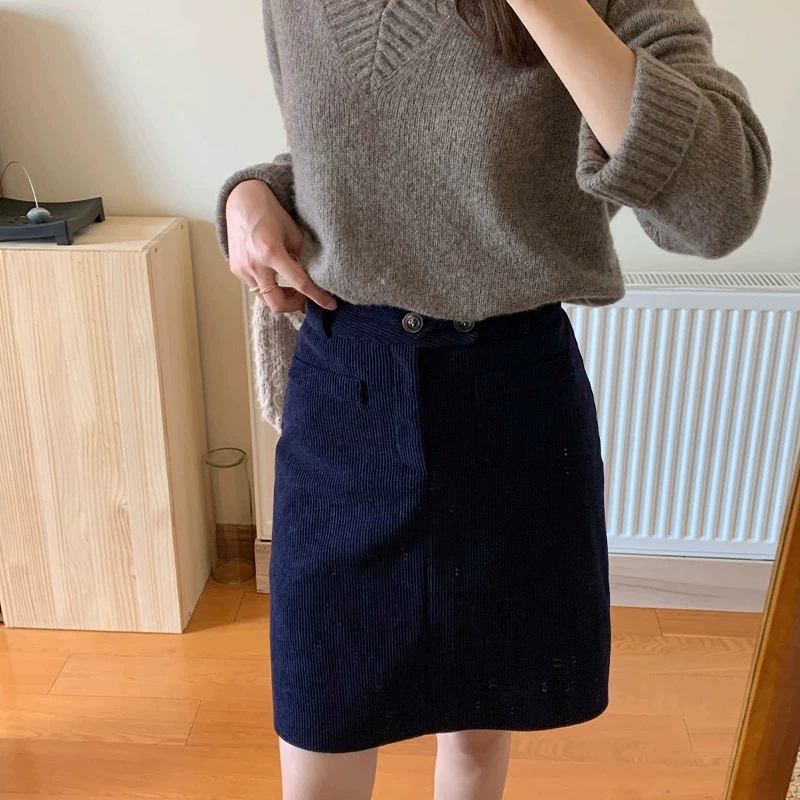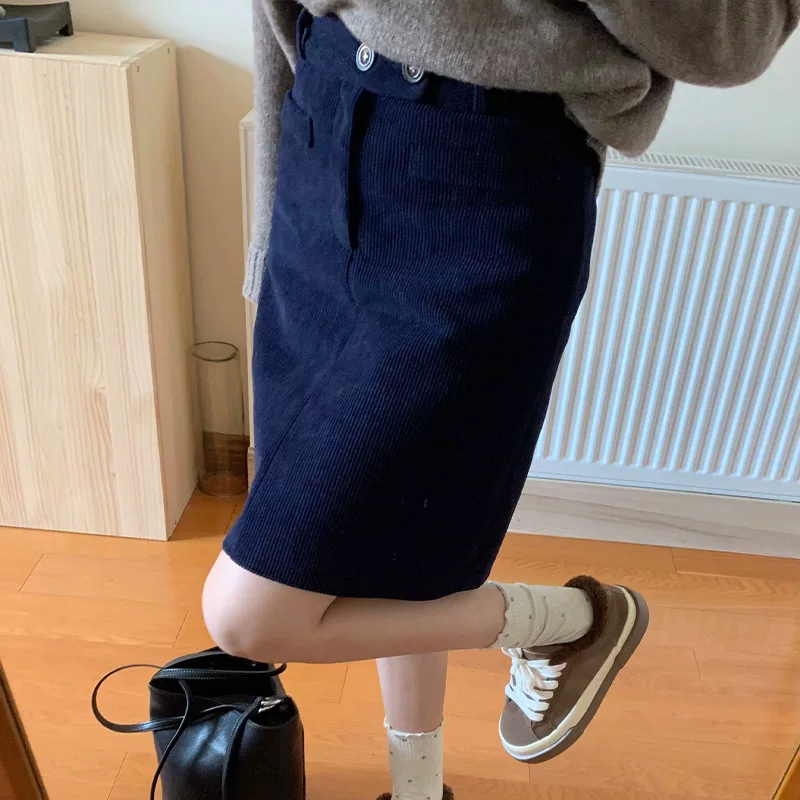 Váy nhung kẻ sọc xanh hải quân dành cho nữ, váy midi dáng chữ A mùa thu đông, cạp cao, cỡ lớn, tôn dáng, váy bút chì, váy ngắn.