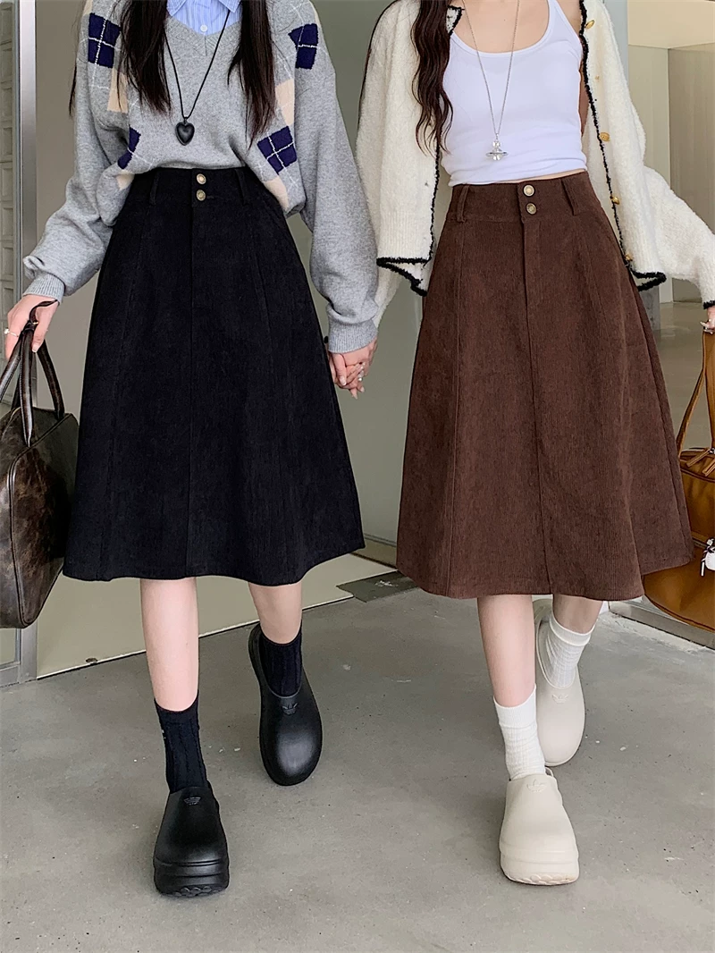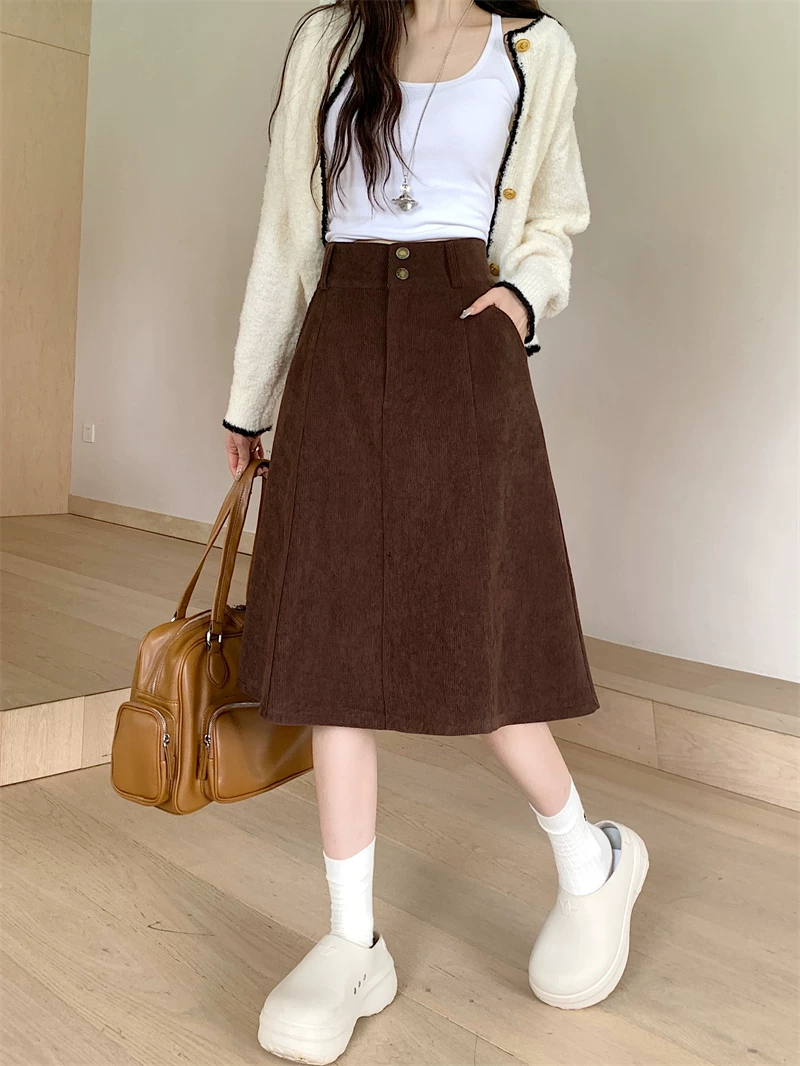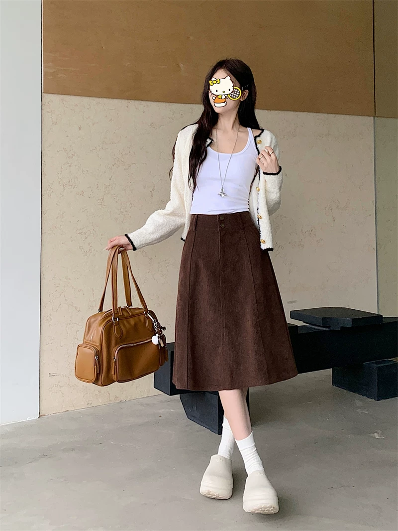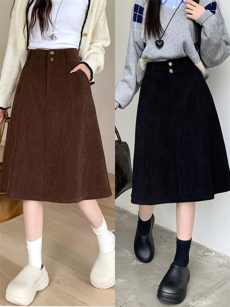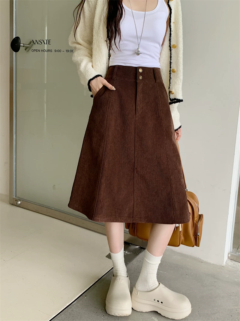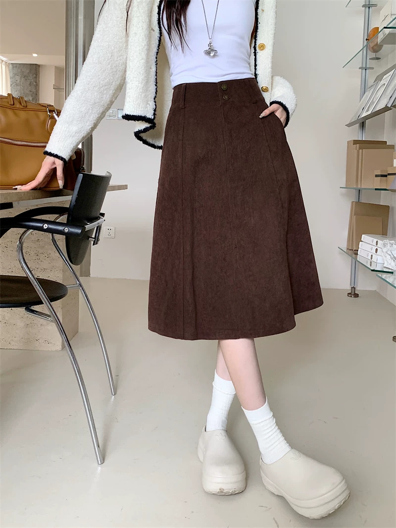 - Váy nhung nâu cỡ lớn dành cho nữ, váy midi cạp cao che hông mùa thu đông, váy xòe chữ A tôn dáng.
