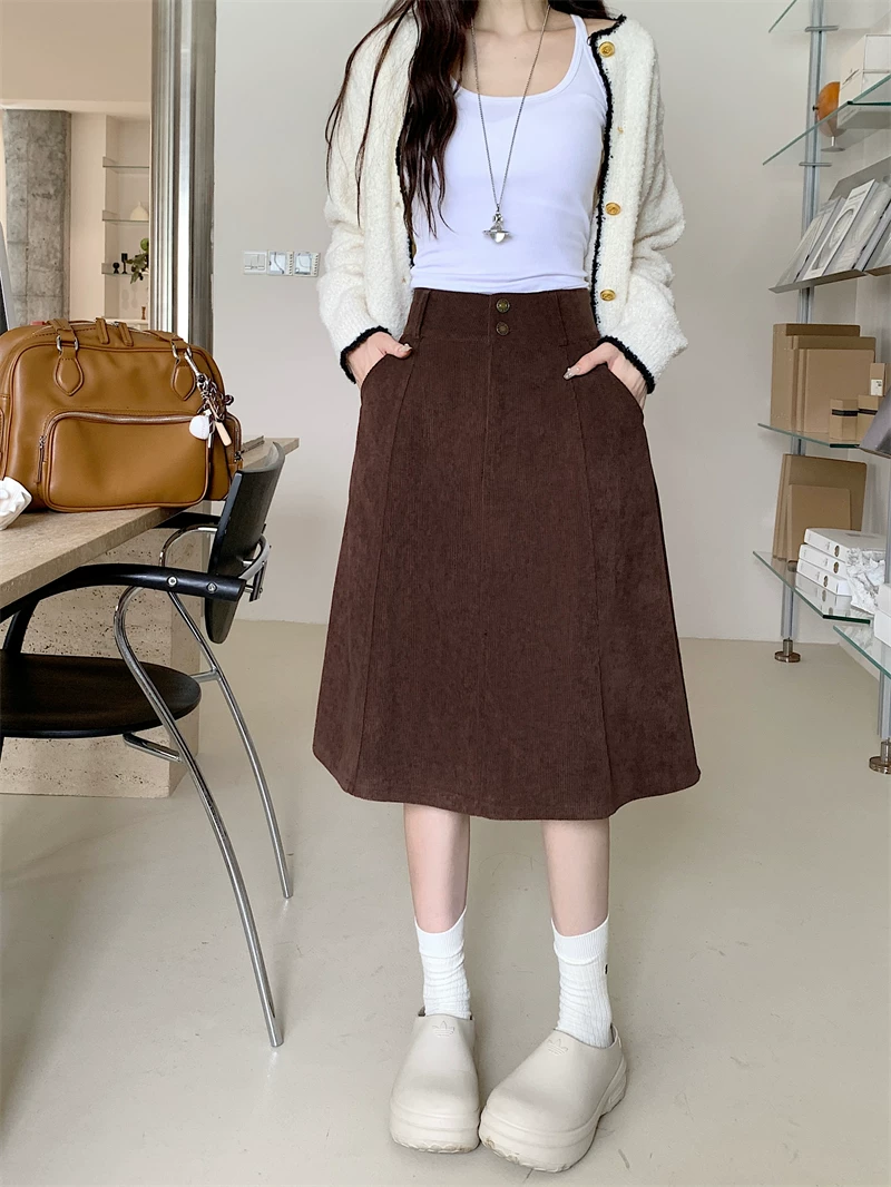 Váy nhung nâu cỡ lớn dành cho nữ, váy midi cạp cao che hông mùa thu đông, váy xòe chữ A tôn dáng.