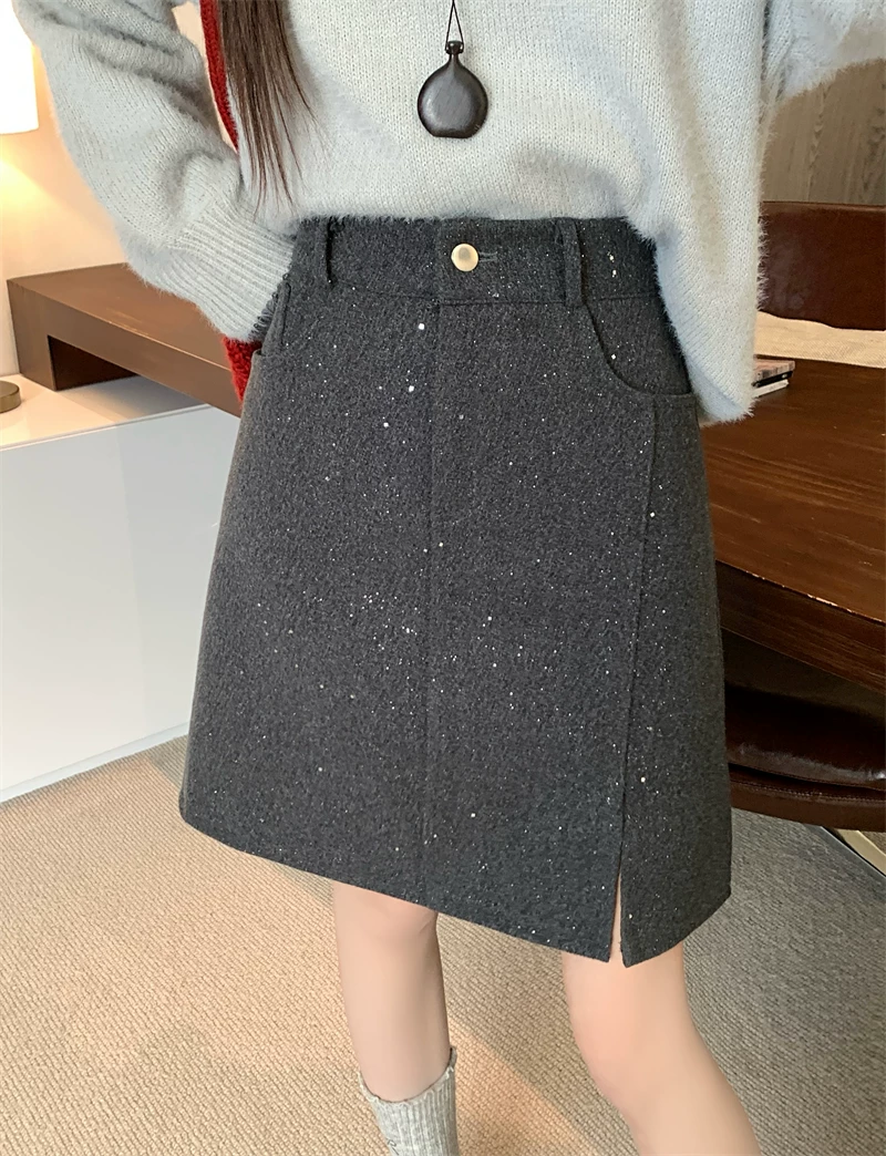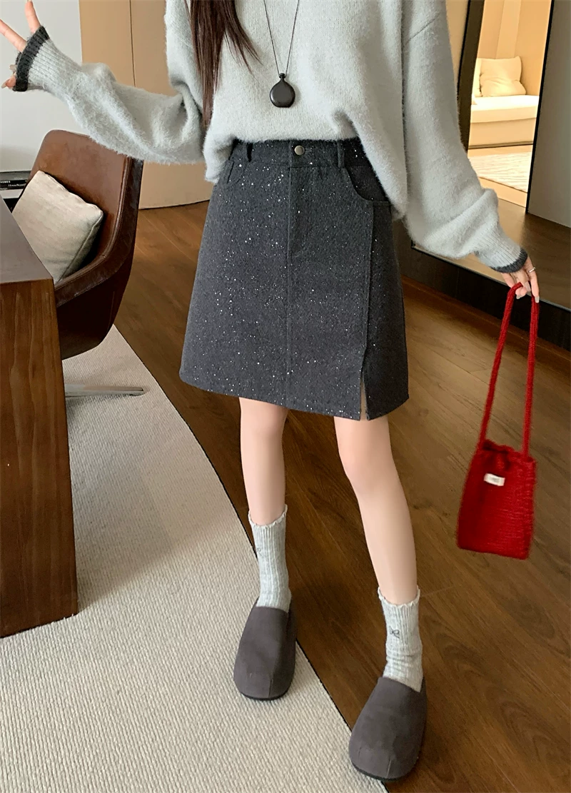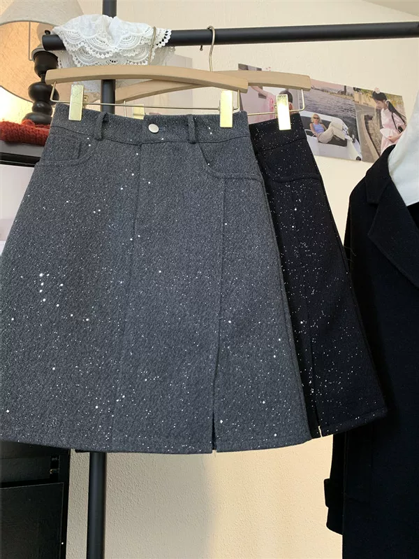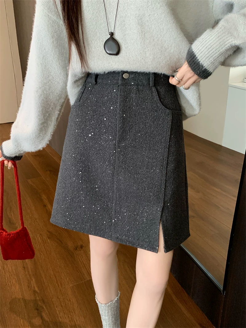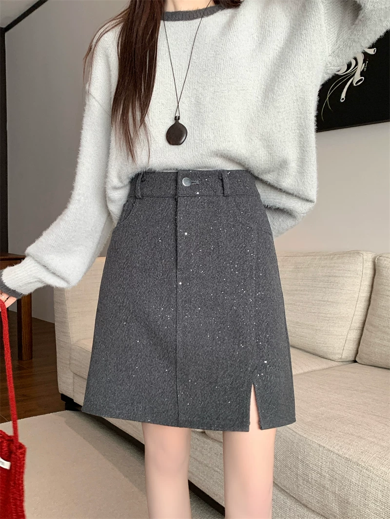 Váy xẻ tà bóng bẩy cỡ lớn dành cho nữ, váy ngắn chữ A đính sequin cao eo mùa thu đông, váy bút chì len dày màu xám.