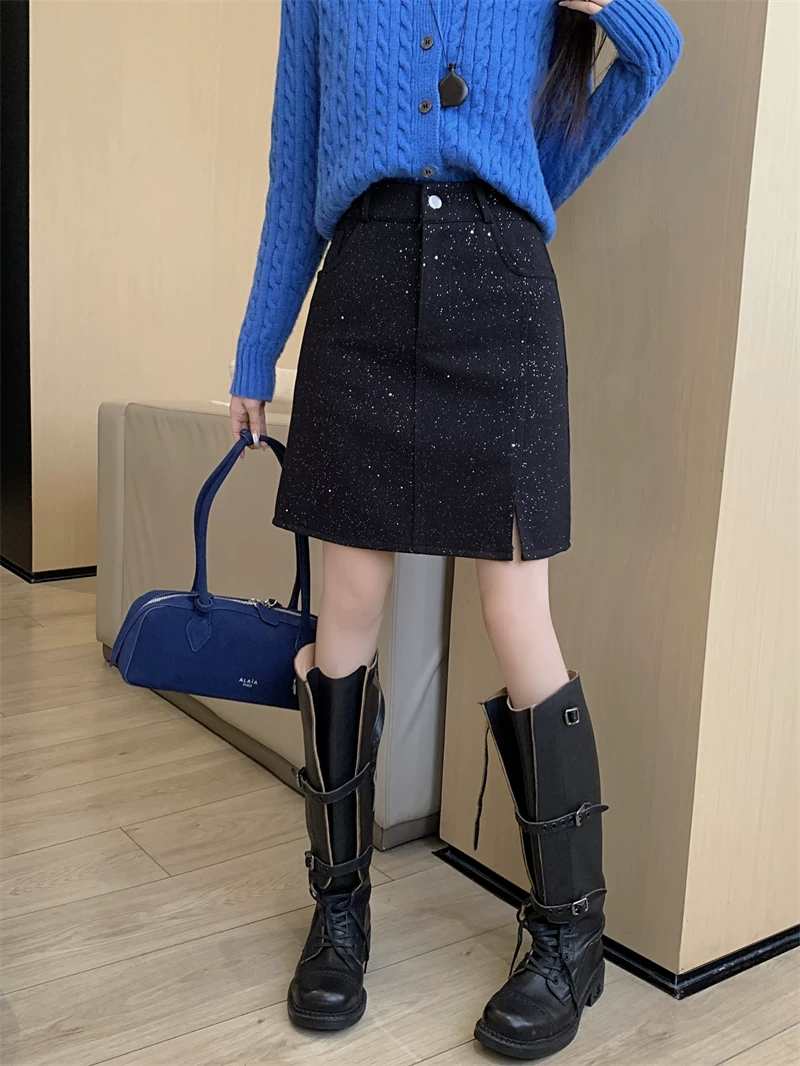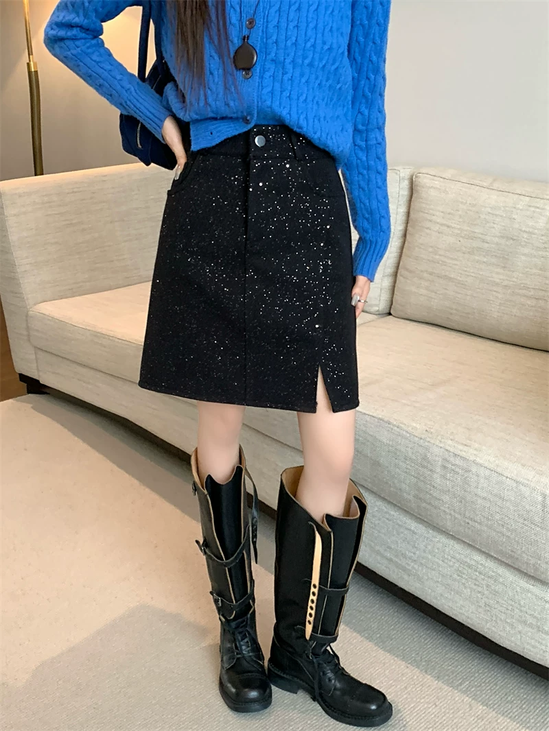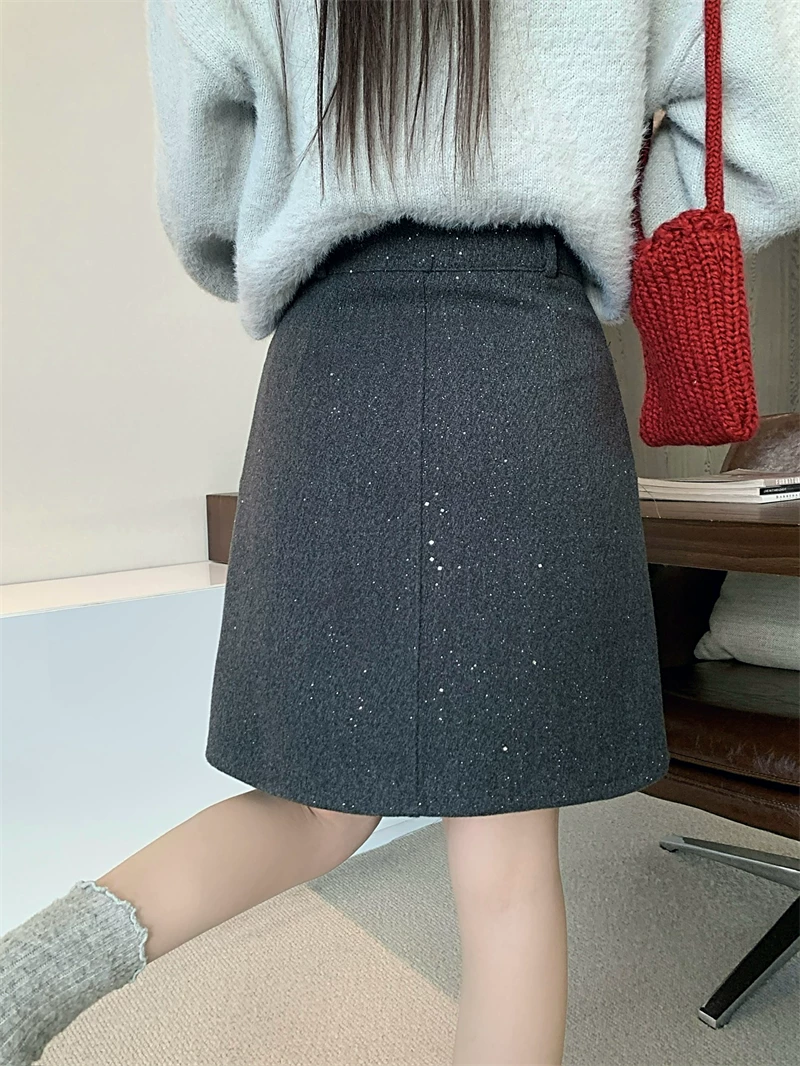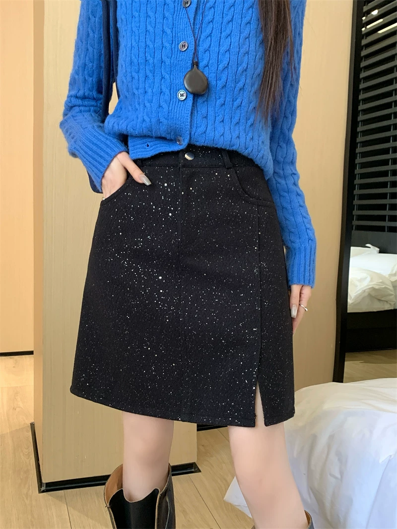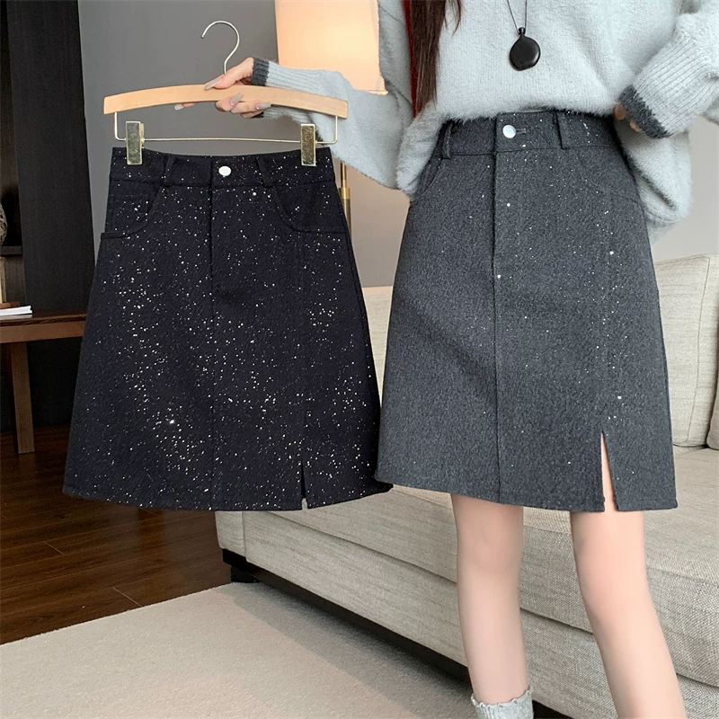 Váy xẻ tà bóng bẩy cỡ lớn dành cho nữ, váy ngắn chữ A đính sequin cao eo mùa thu đông, váy bút chì len dày màu xám.