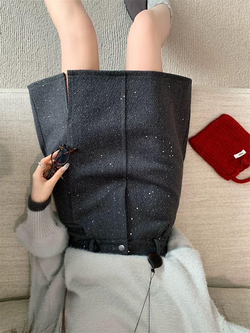 - Váy xẻ tà bóng bẩy cỡ lớn dành cho nữ, váy ngắn chữ A đính sequin cao eo mùa thu đông, váy bút chì len dày màu xám.