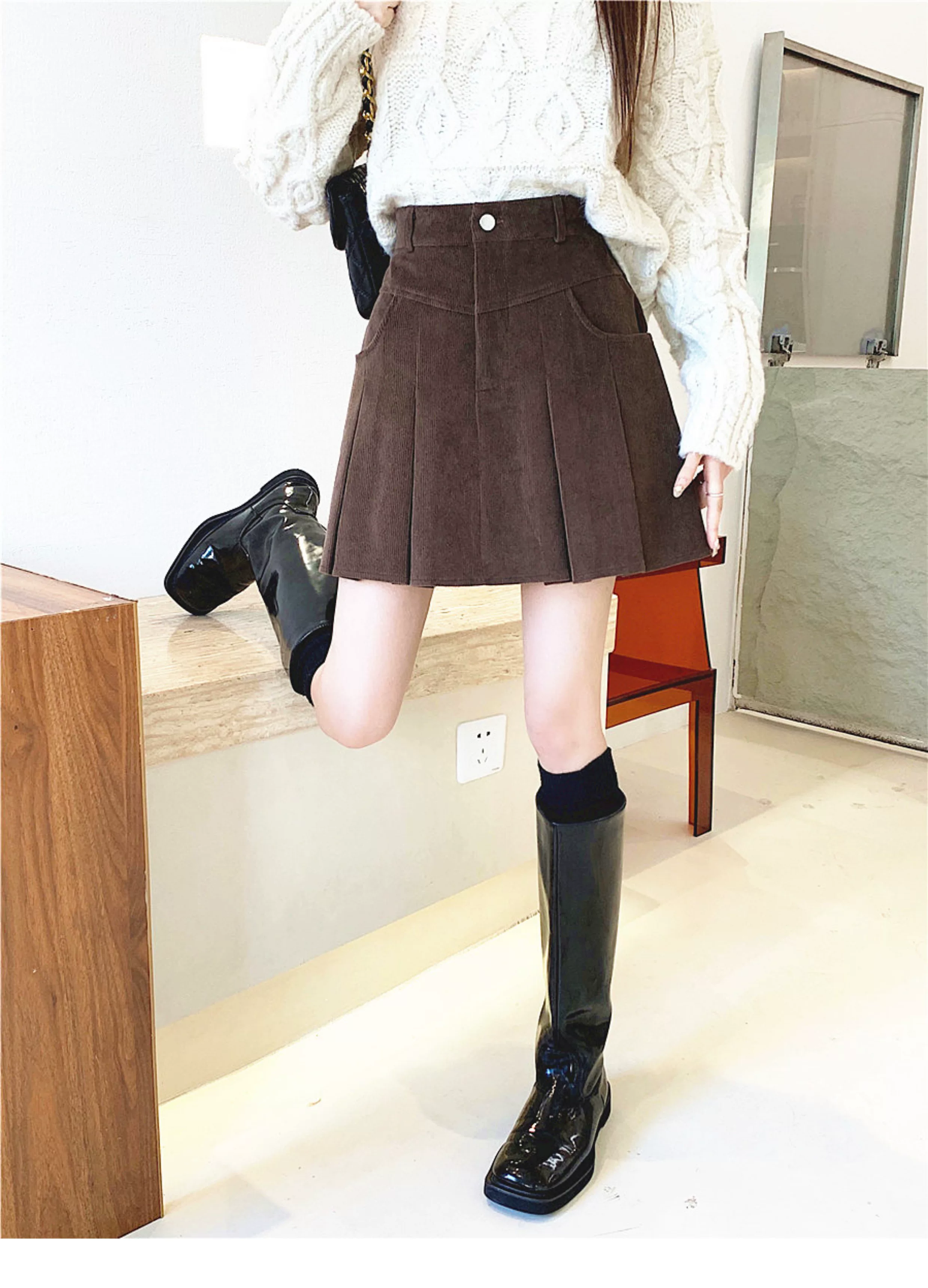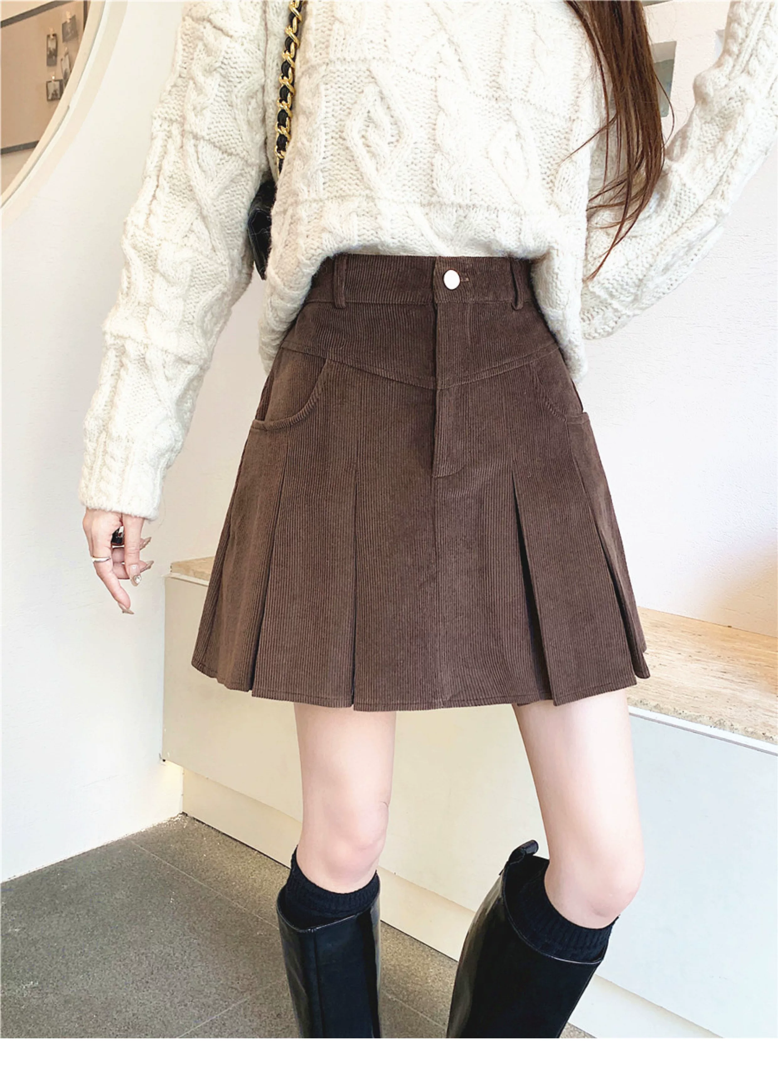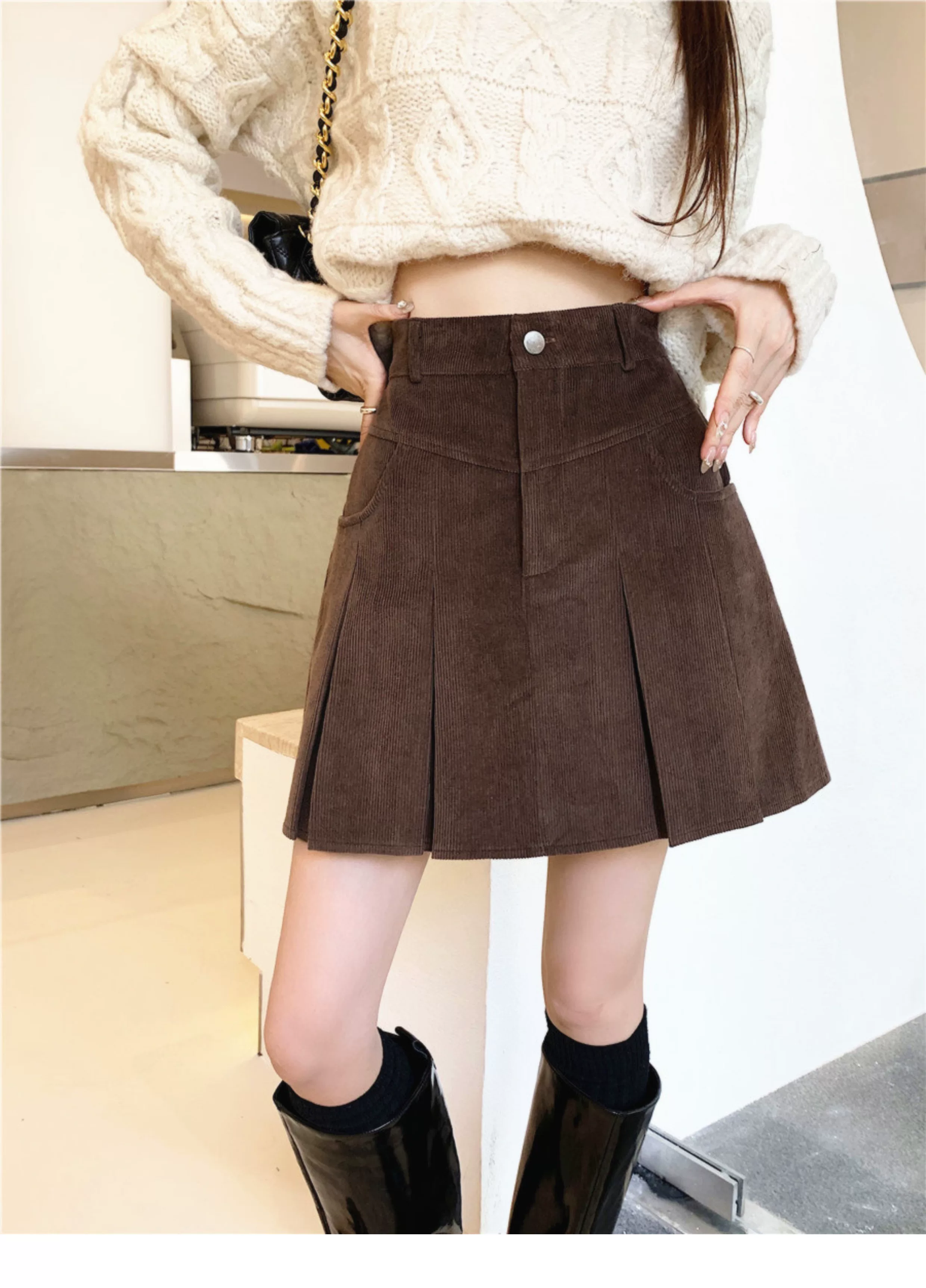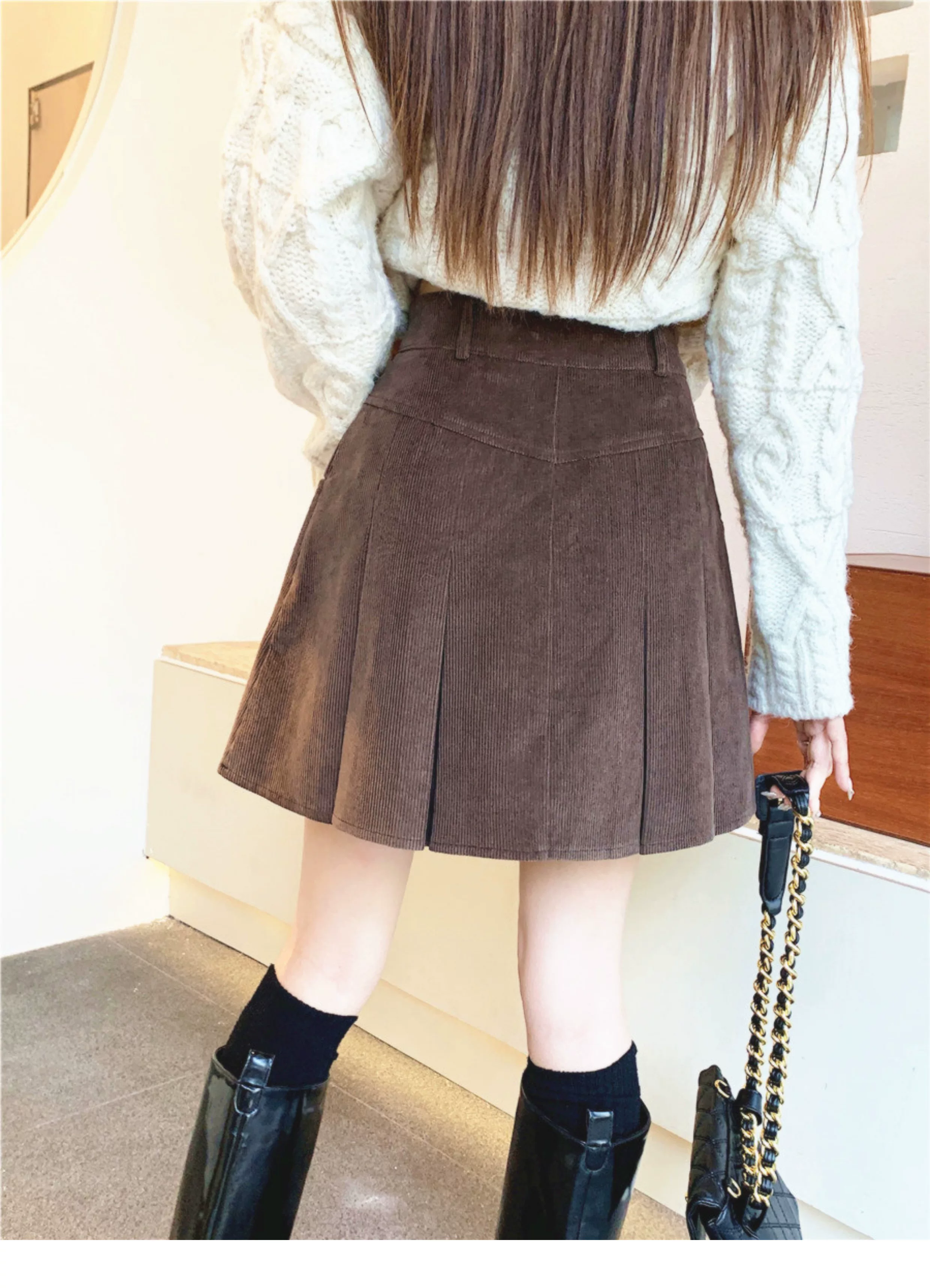 Váy xếp ly bằng vải nhung cỡ lớn dành cho nữ, mùa thu đông, chống lộ, váy ngắn phong cách preppy, thiết kế lưng cao, váy chữ A.