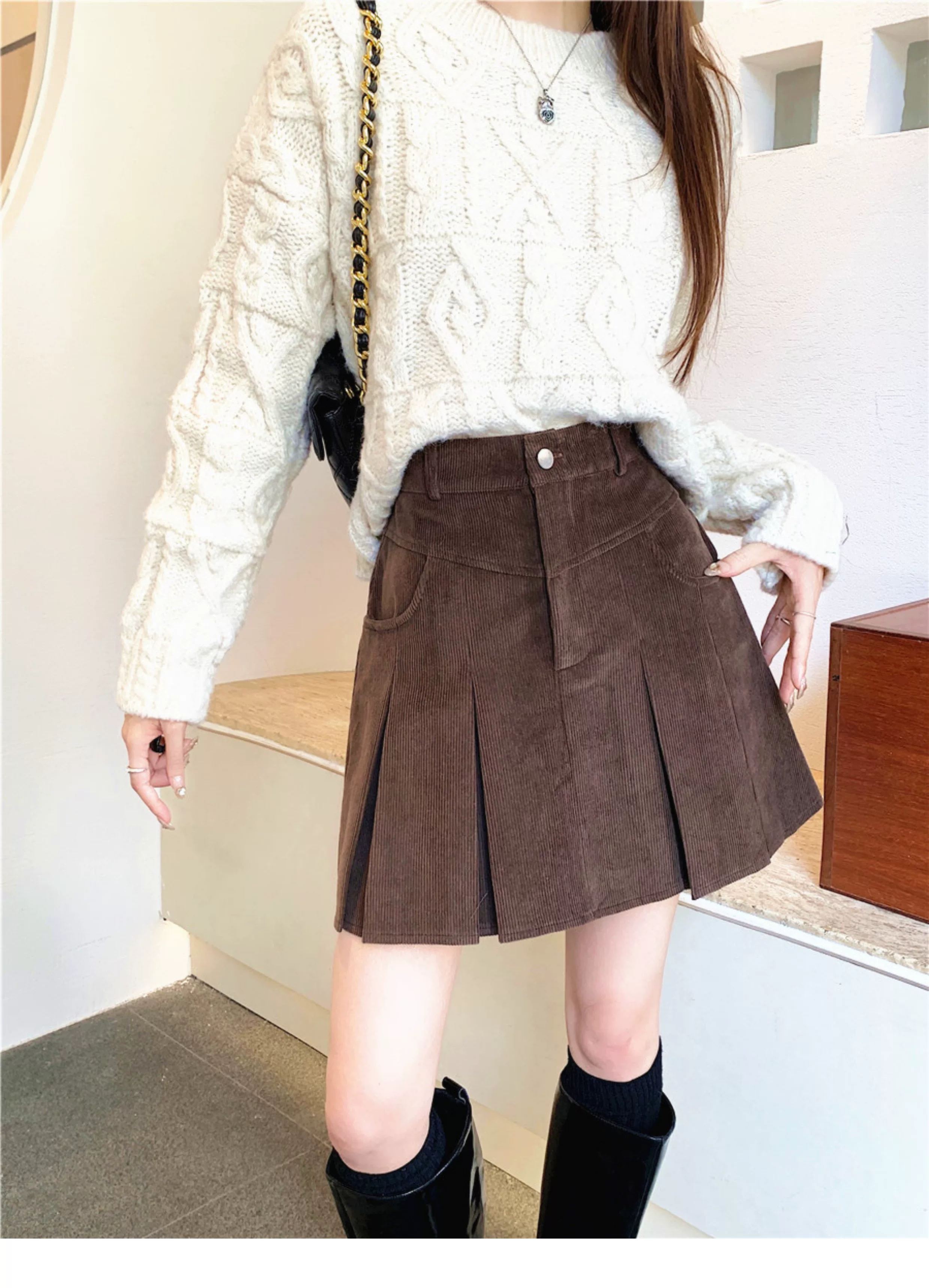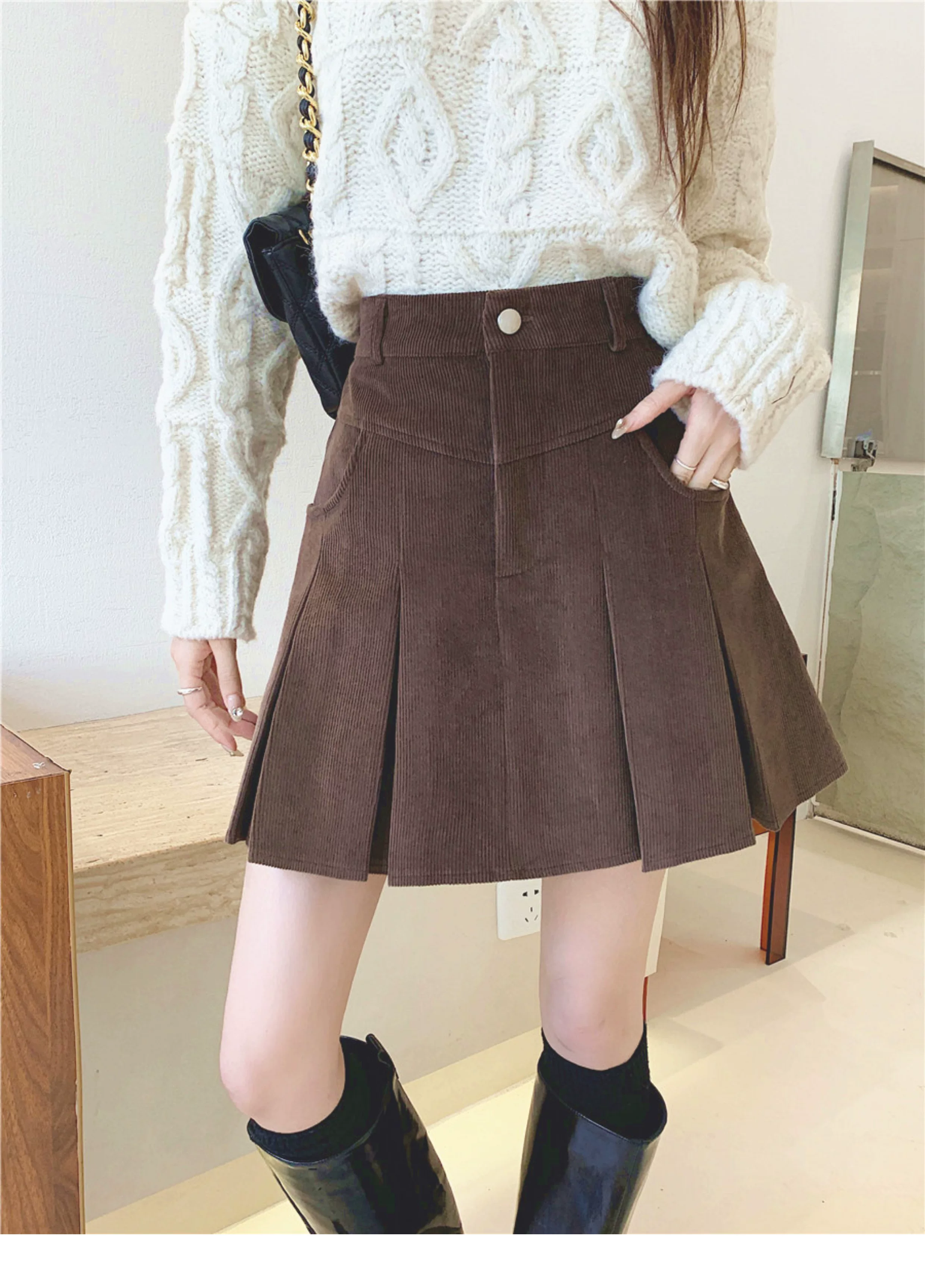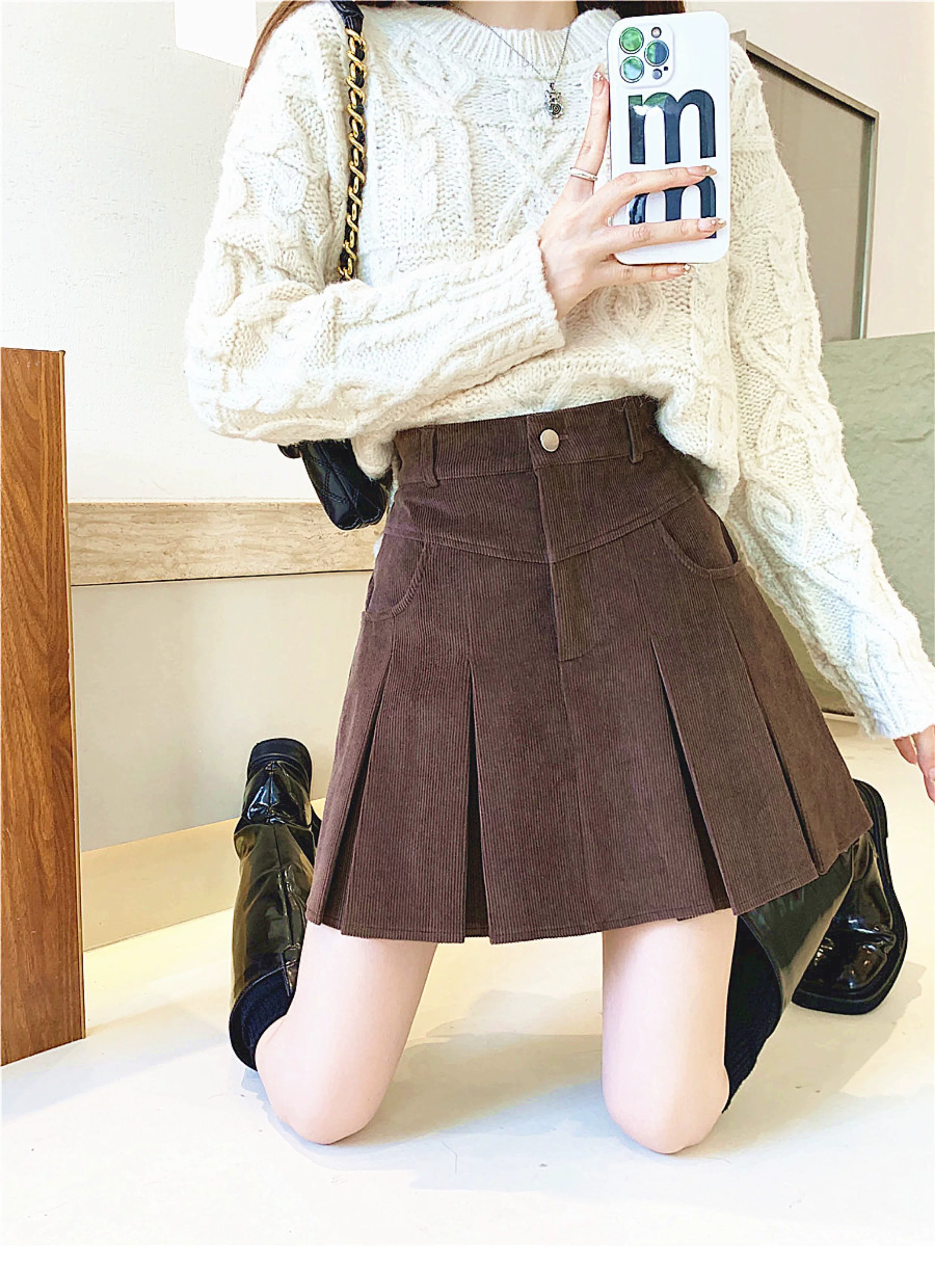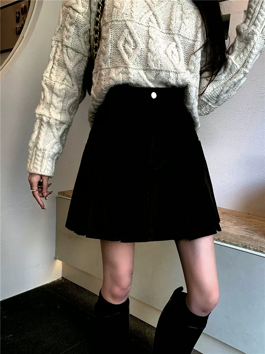 Váy xếp ly bằng vải nhung cỡ lớn dành cho nữ, mùa thu đông, chống lộ, váy ngắn phong cách preppy, thiết kế lưng cao, váy chữ A.