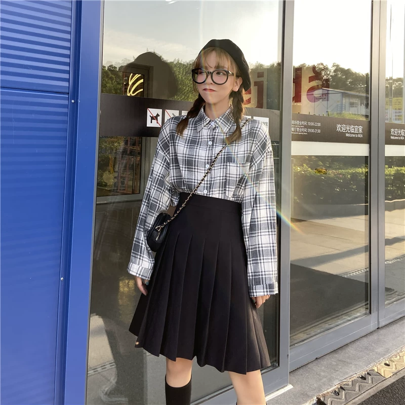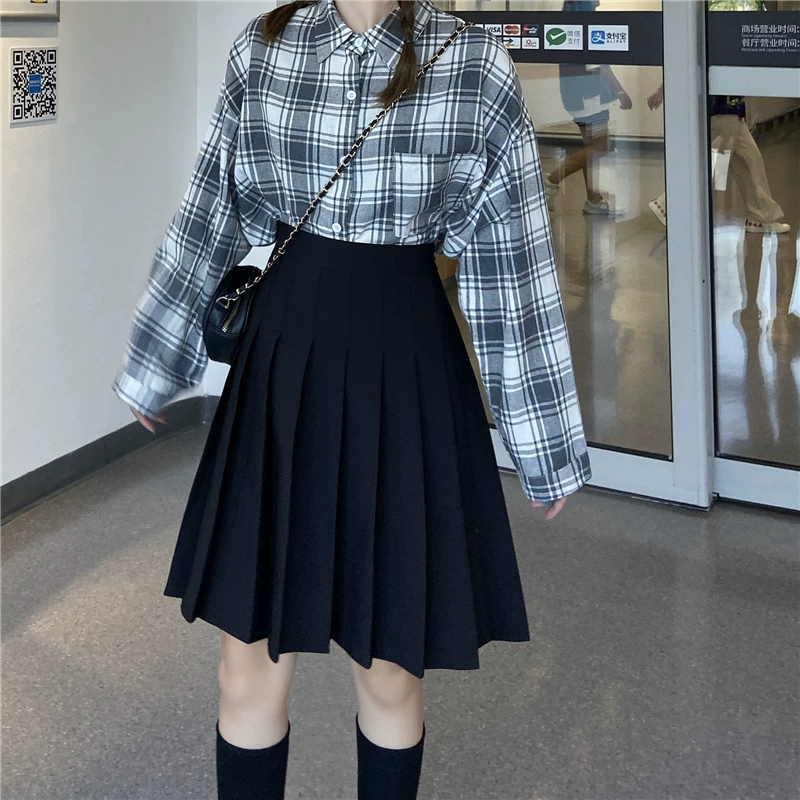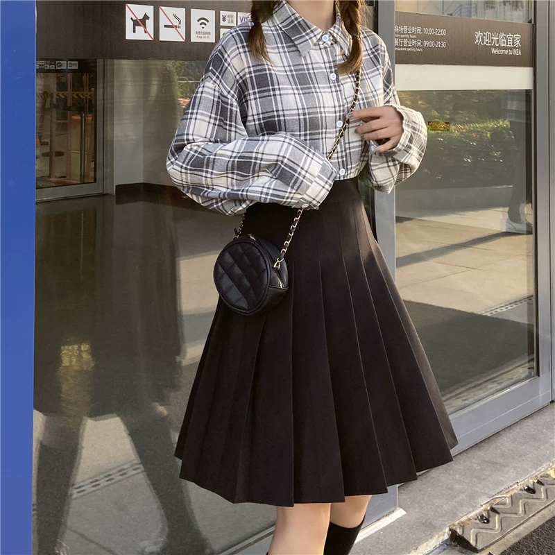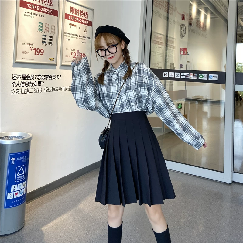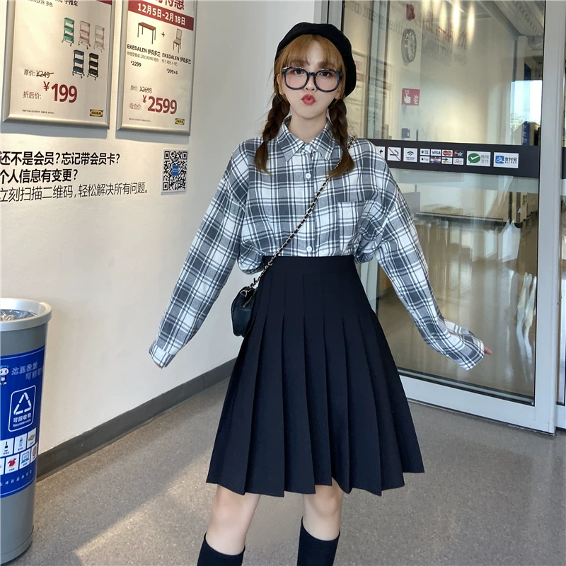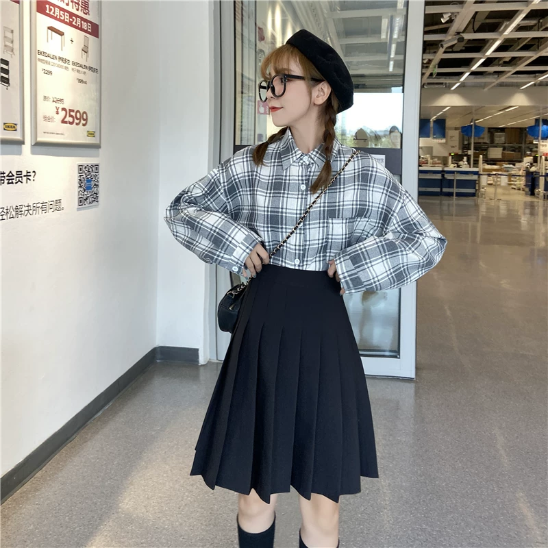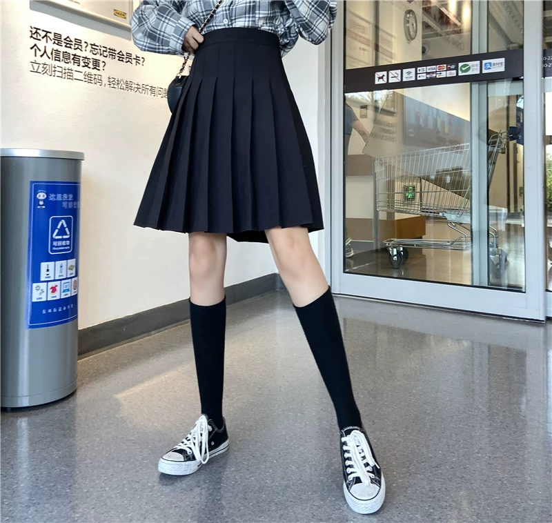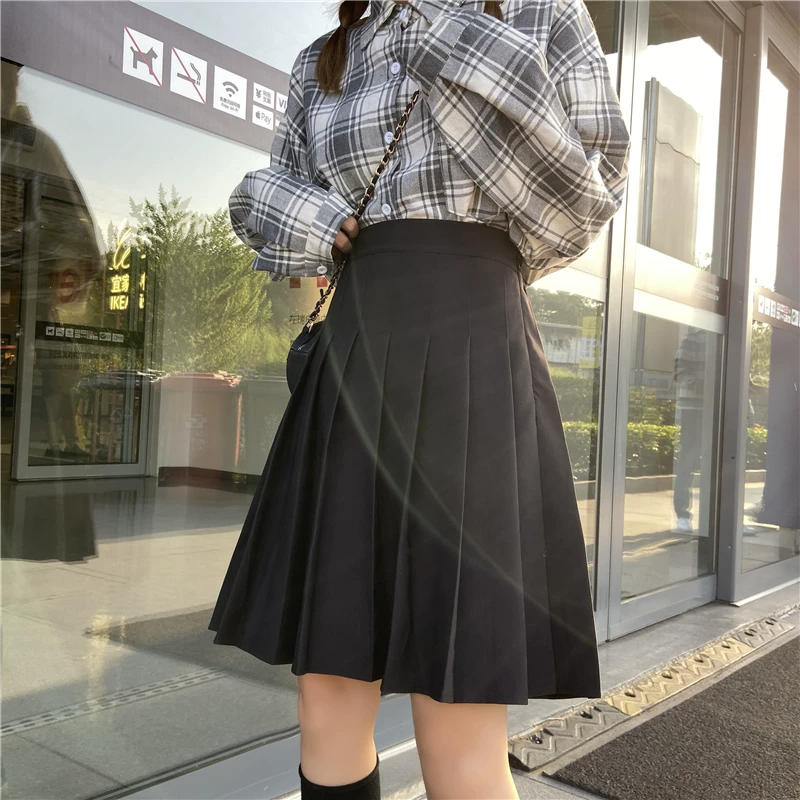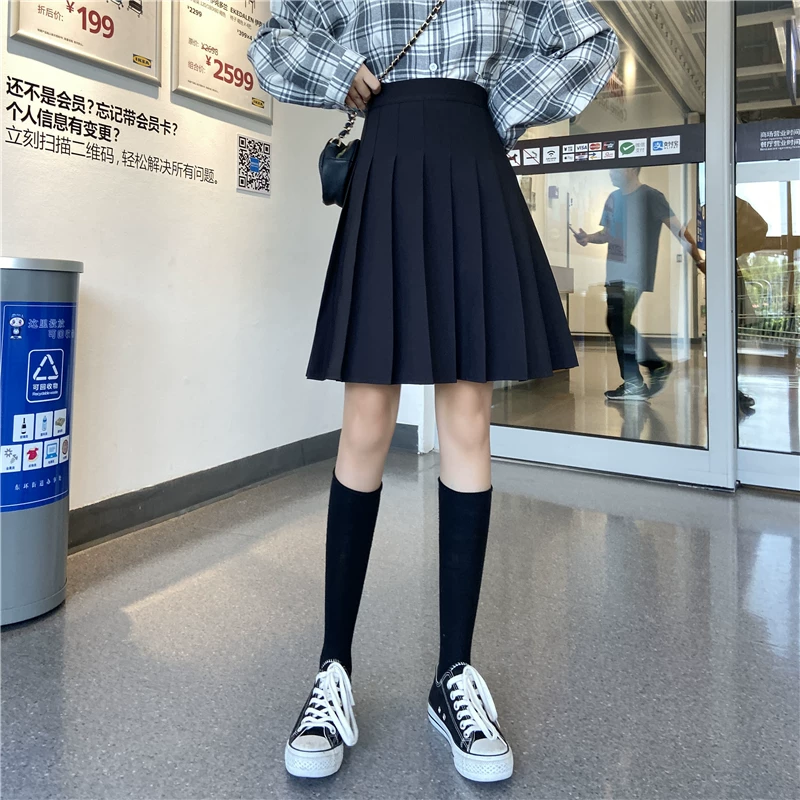 - Váy xếp ly cho nữ, mùa thu đông, váy chữ A dài vừa phải, lưng cao, cỡ lớn, giảm béo, học sinh, chống lộ, váy nửa xòe.