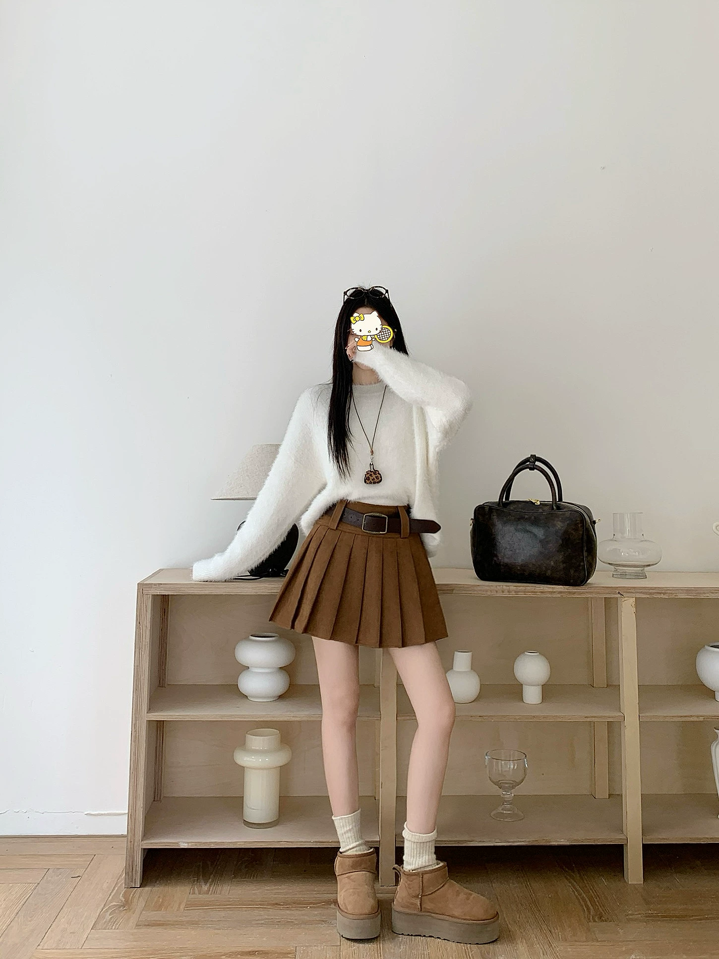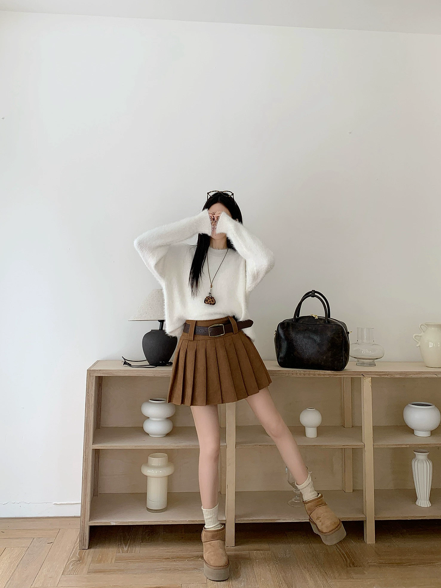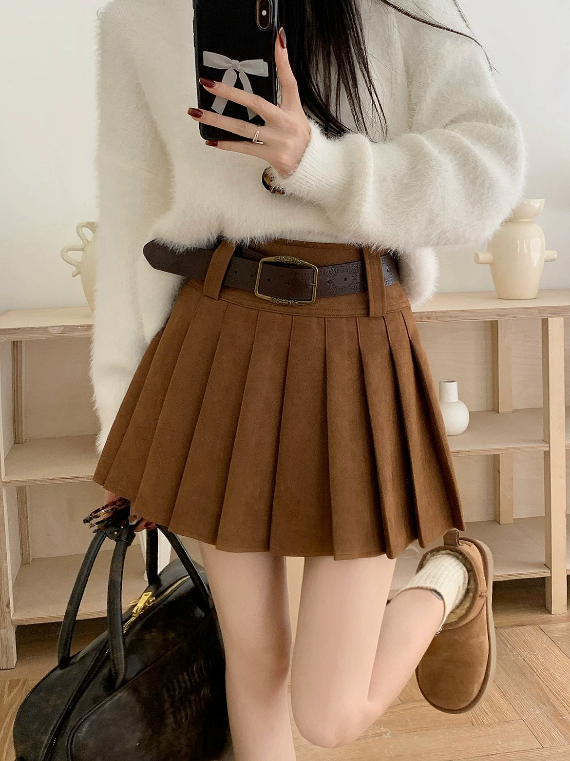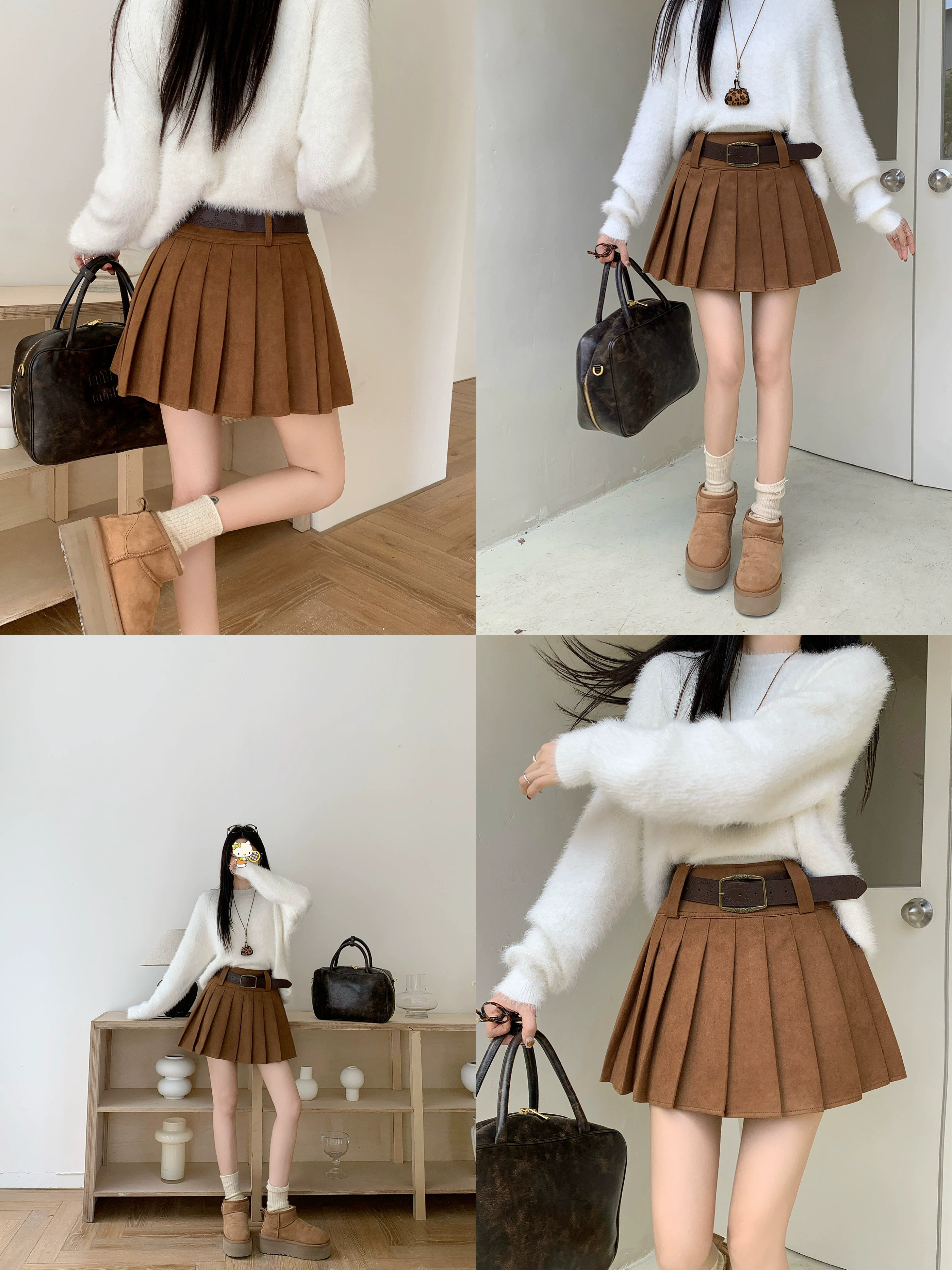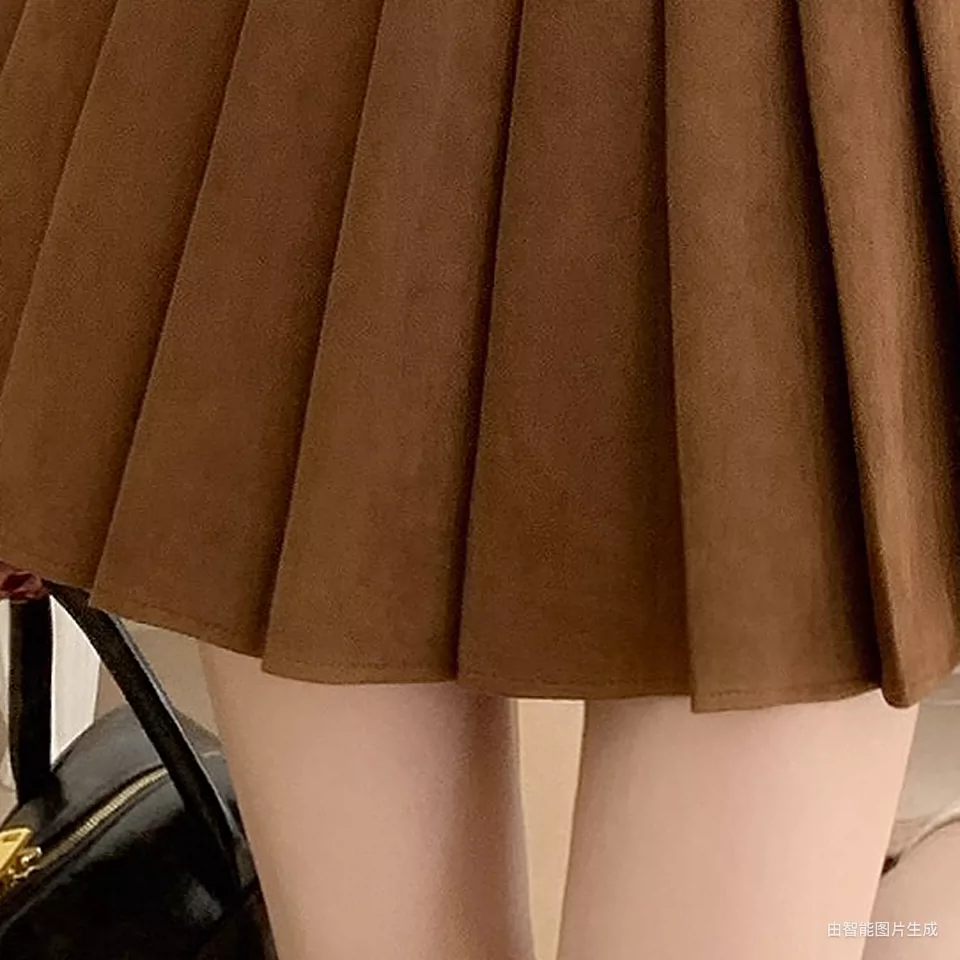 Váy xếp ly da lộn màu nâu cỡ lớn dành cho nữ, váy ngắn chữ A chống lộ dáng thu đông, váy nửa thân màu cà phê phong cách đại học.
