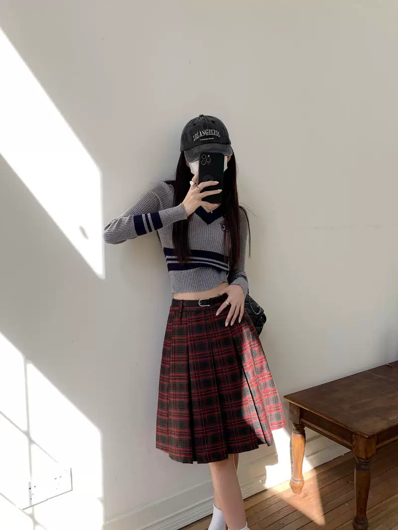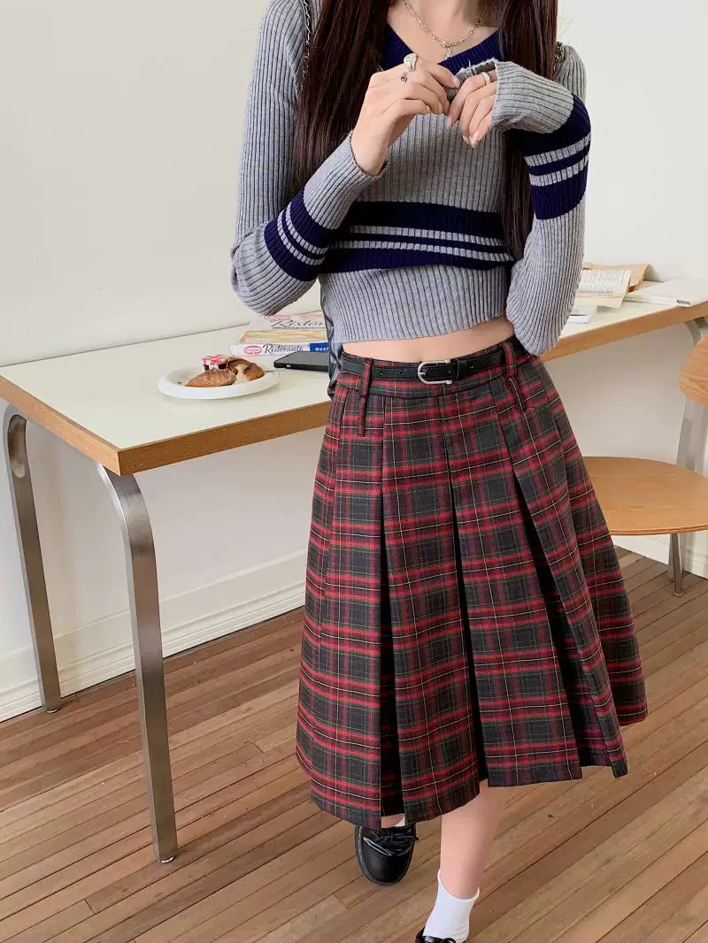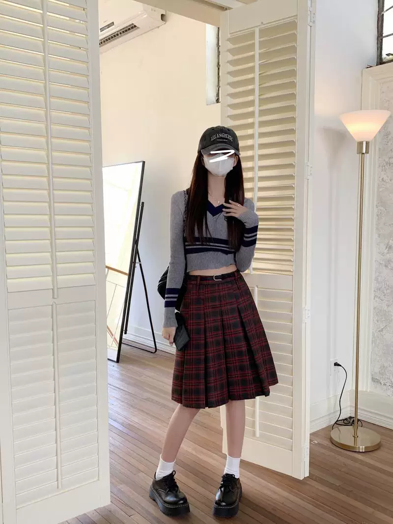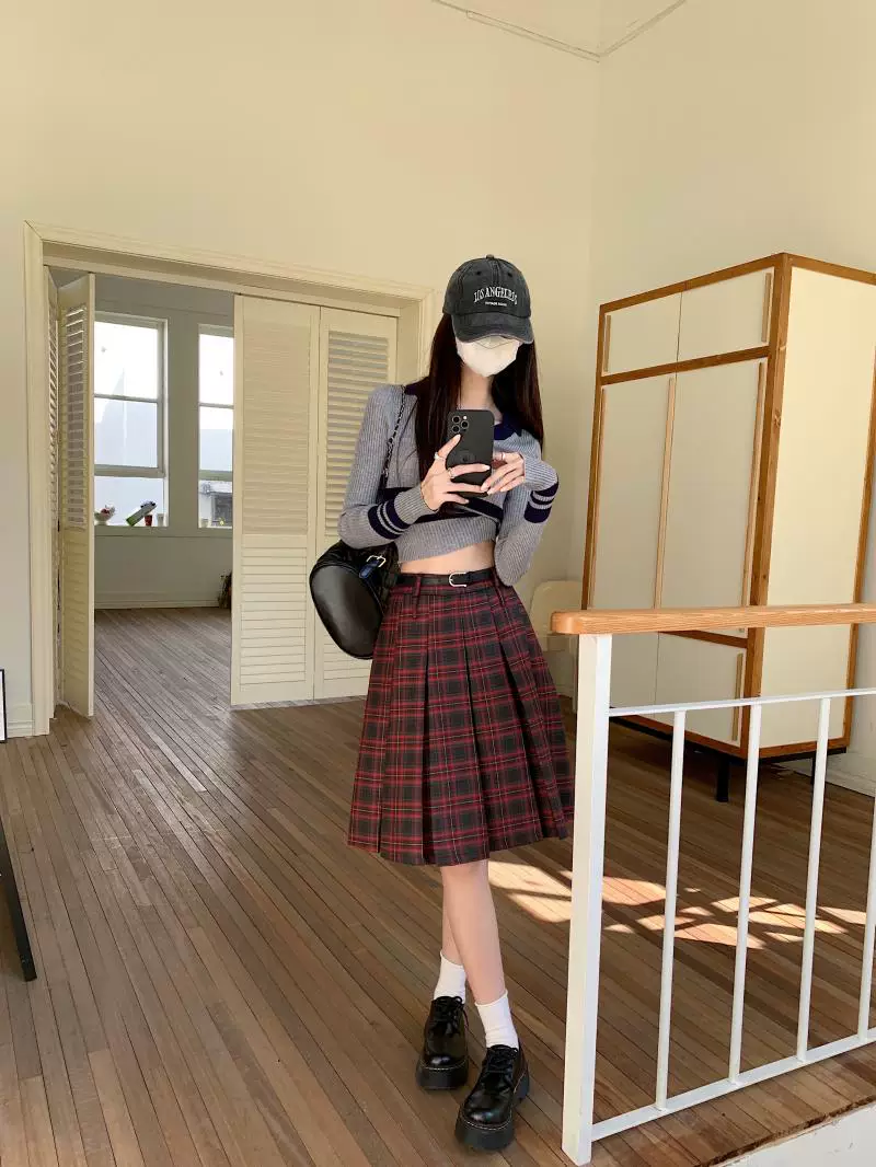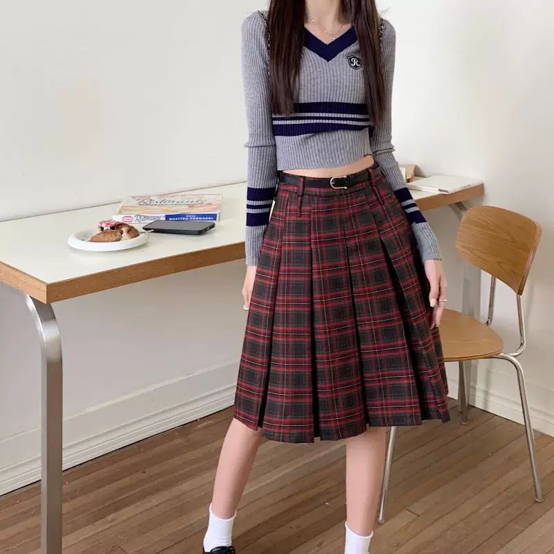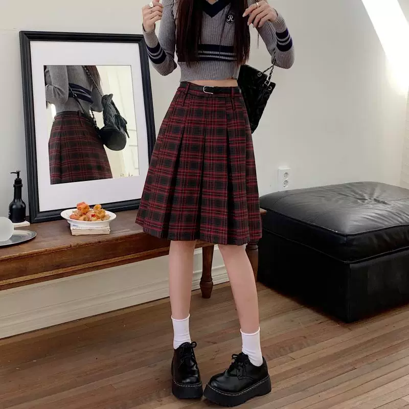 - Váy xếp ly dài, dài ngang đùi mùa xuân hè, size lớn, váy kẻ đỏ tôn dáng, váy xòe chữ A lưng cao