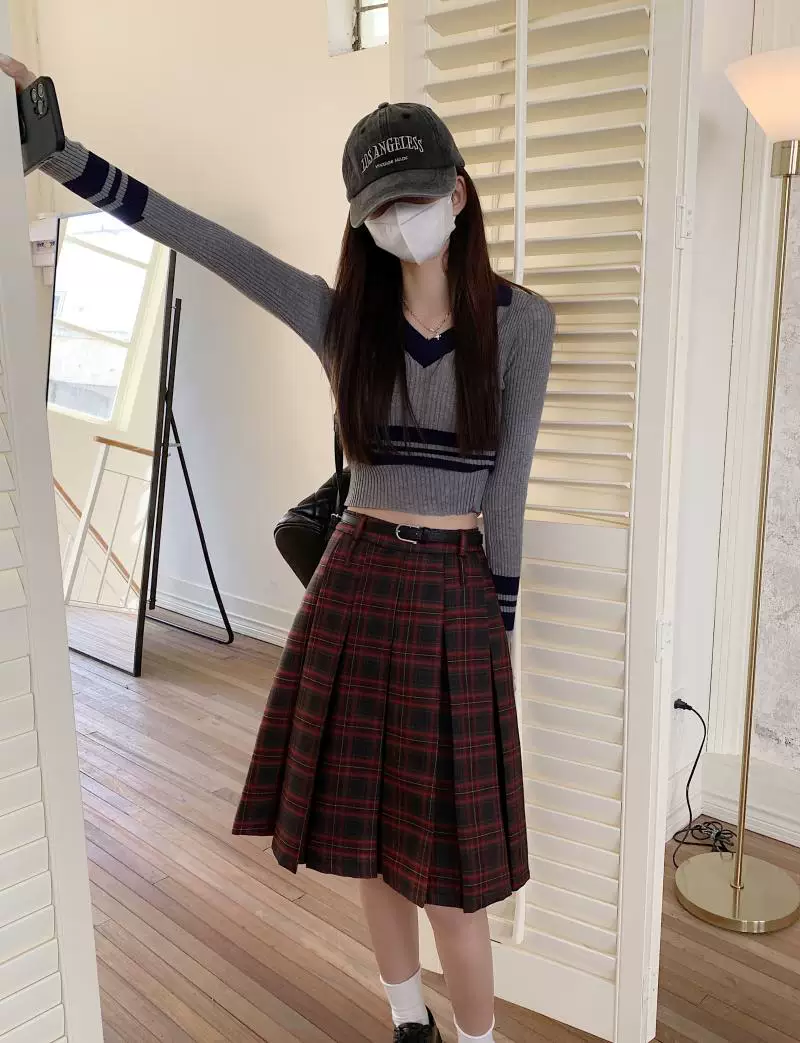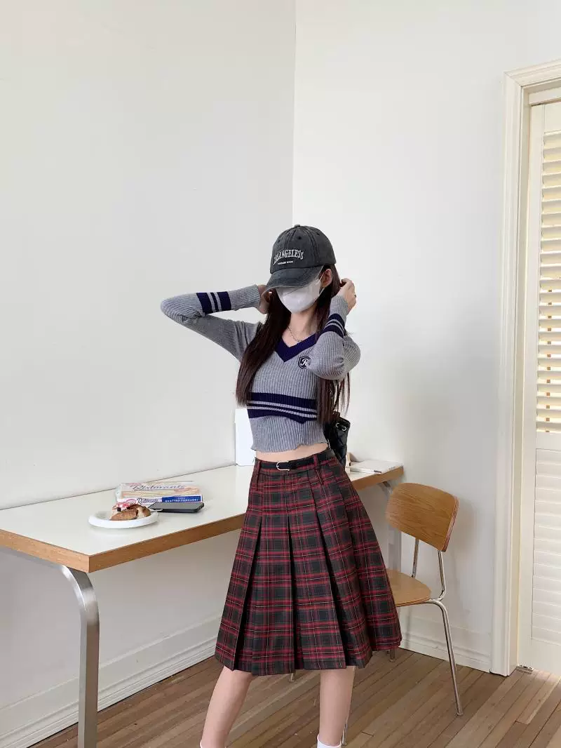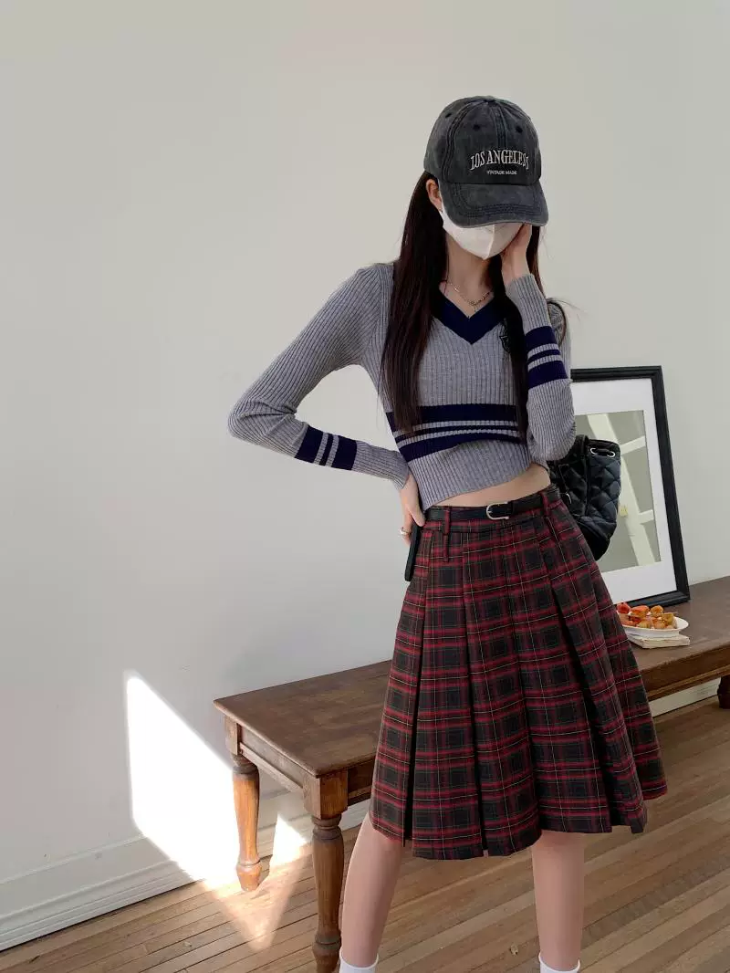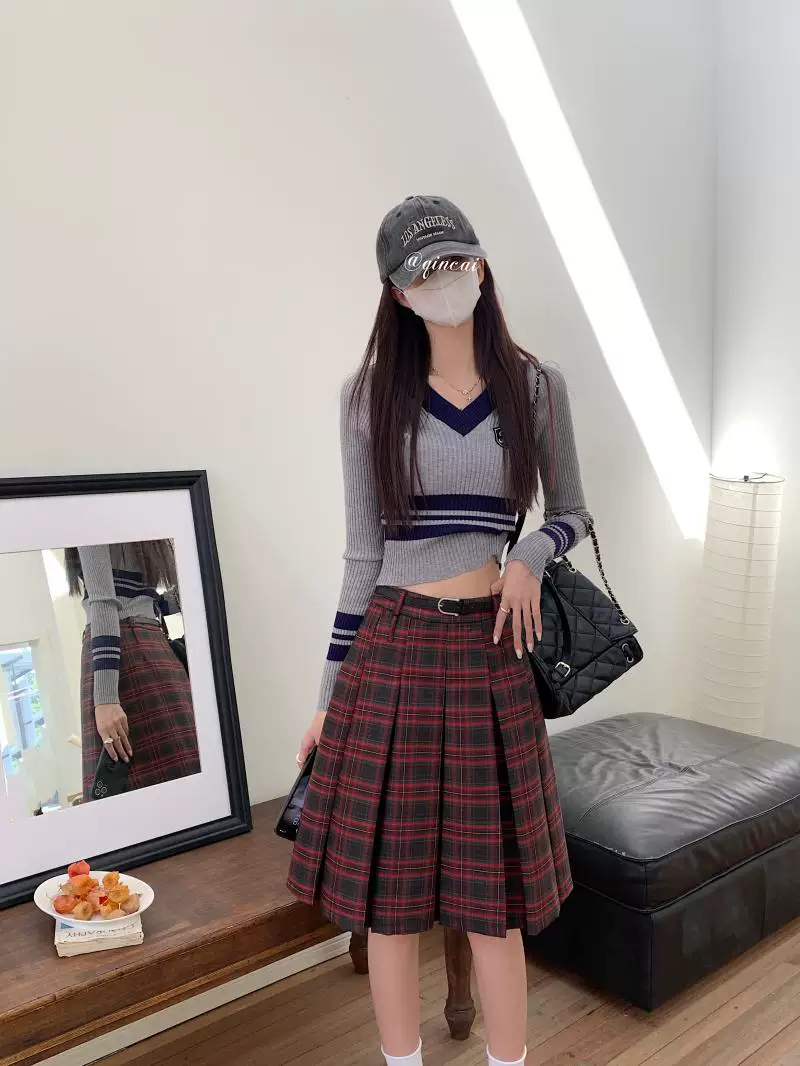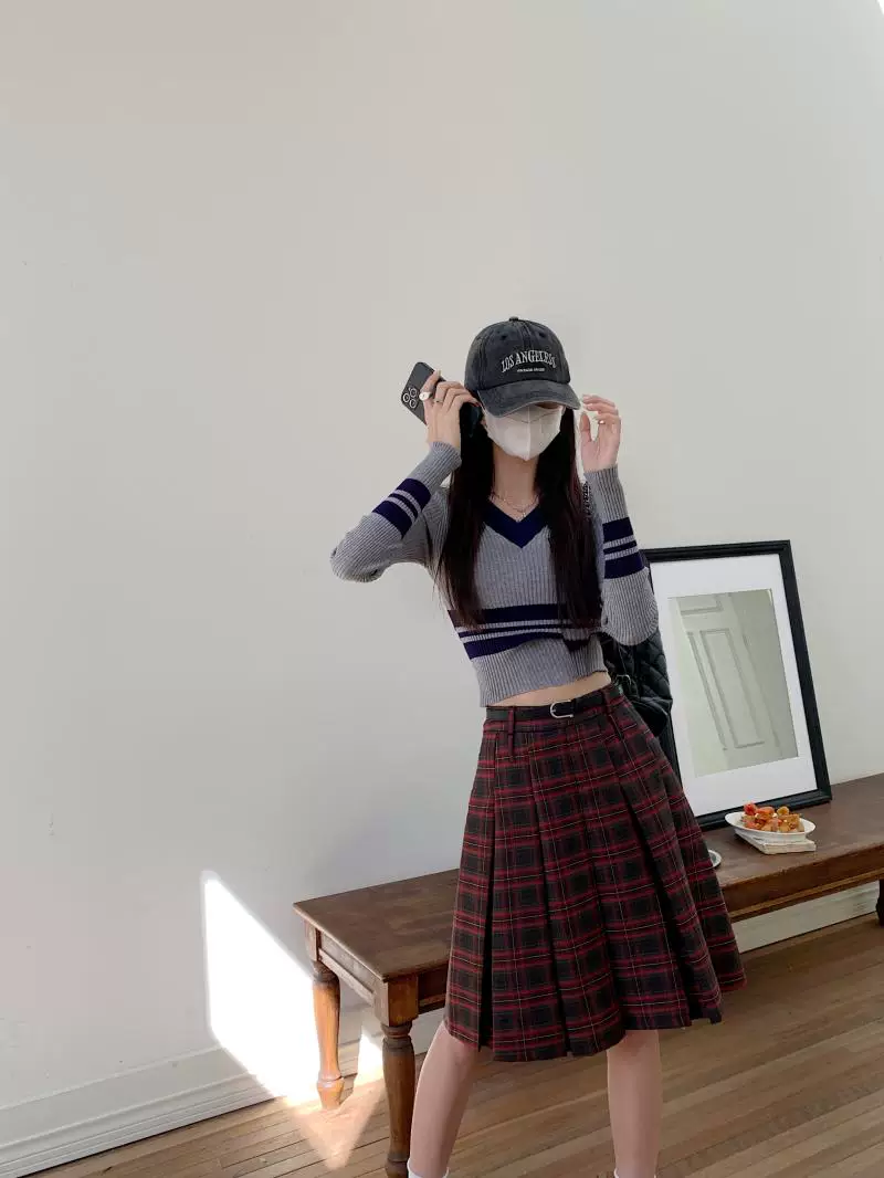 - Váy xếp ly dài, dài ngang đùi mùa xuân hè, size lớn, váy kẻ đỏ tôn dáng, váy xòe chữ A lưng cao