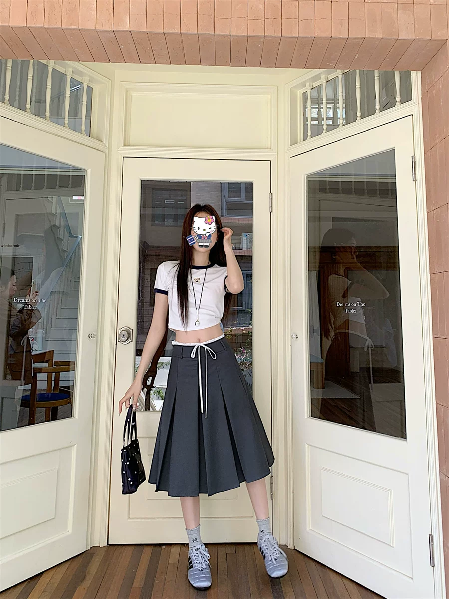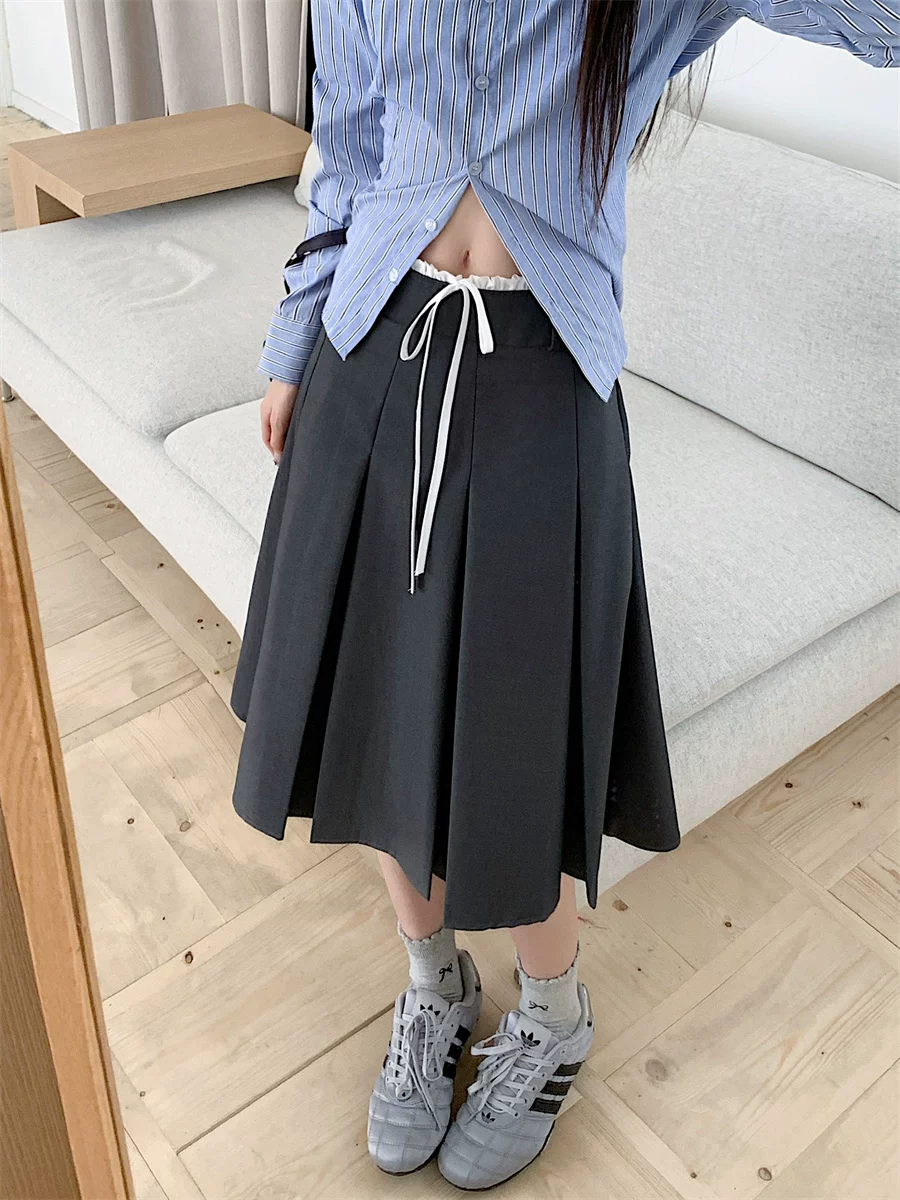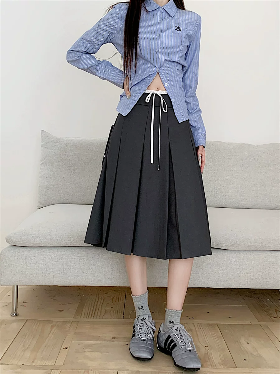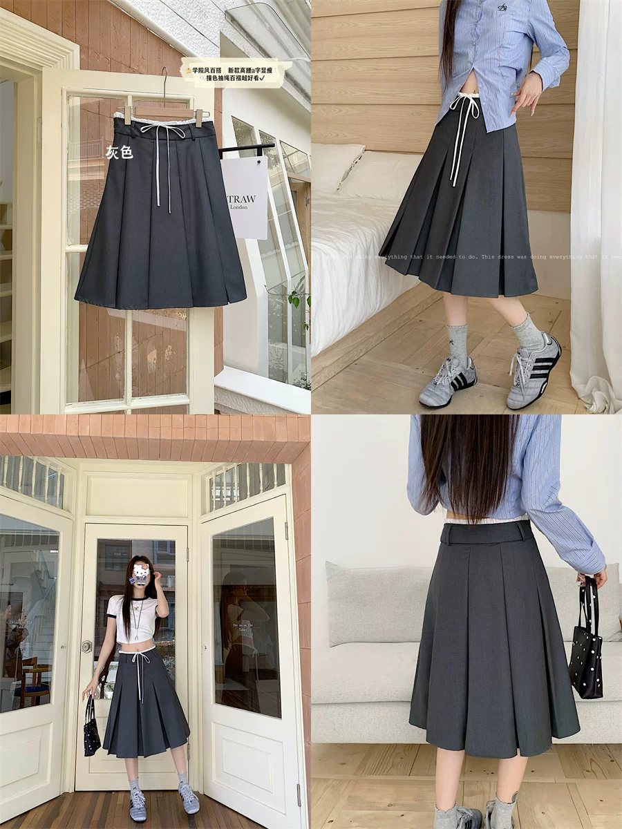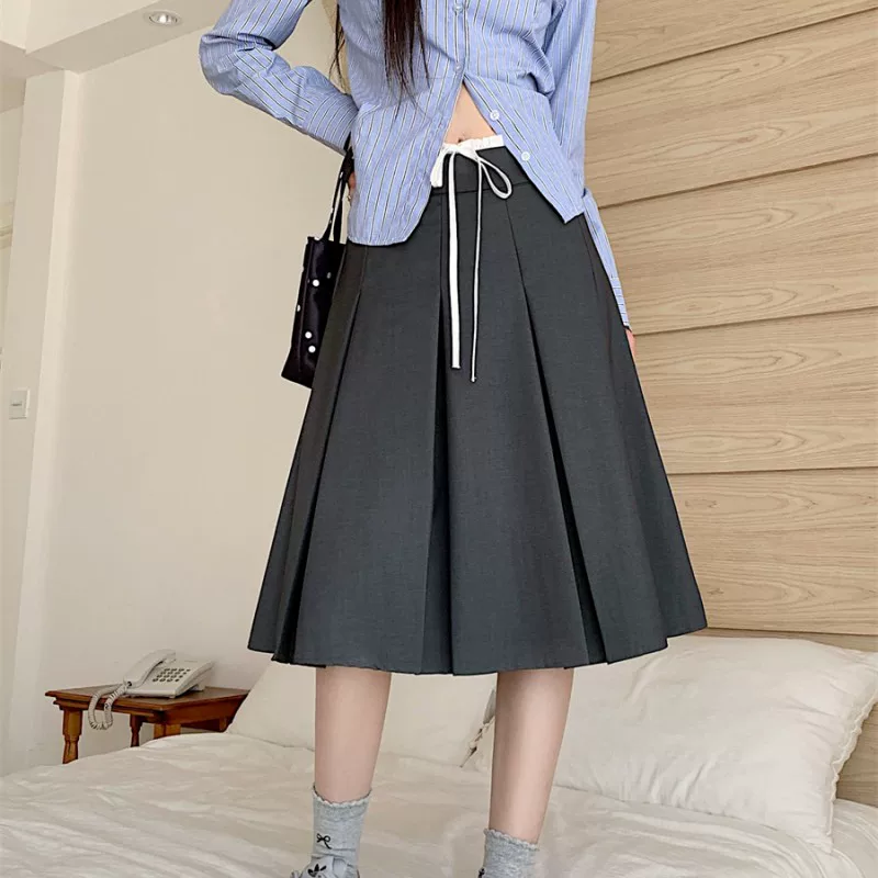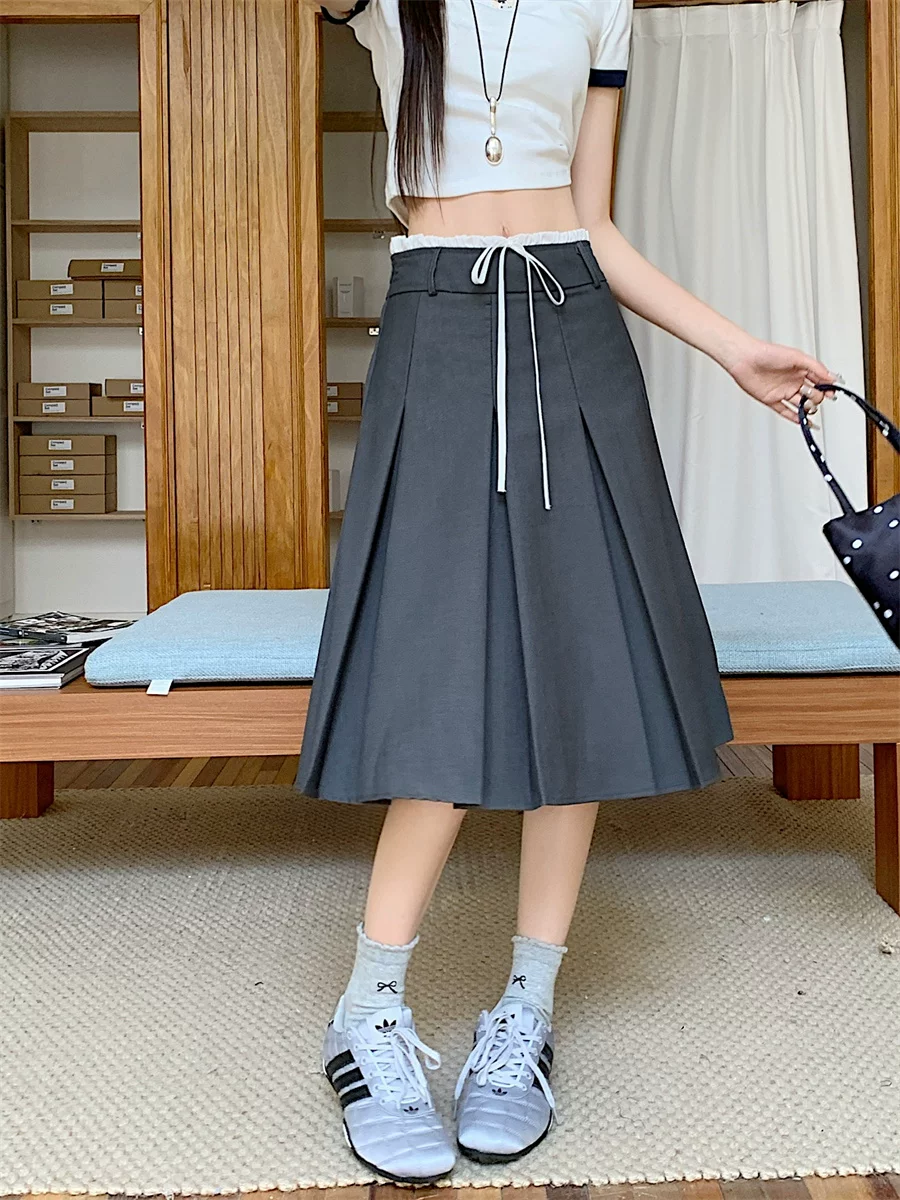 Váy xếp ly dài vừa phải màu xám dành cho nữ, cỡ lớn mùa hè, phong cách preppy, váy kiểu dáng ôm dáng cao eo, váy chữ A che hông.