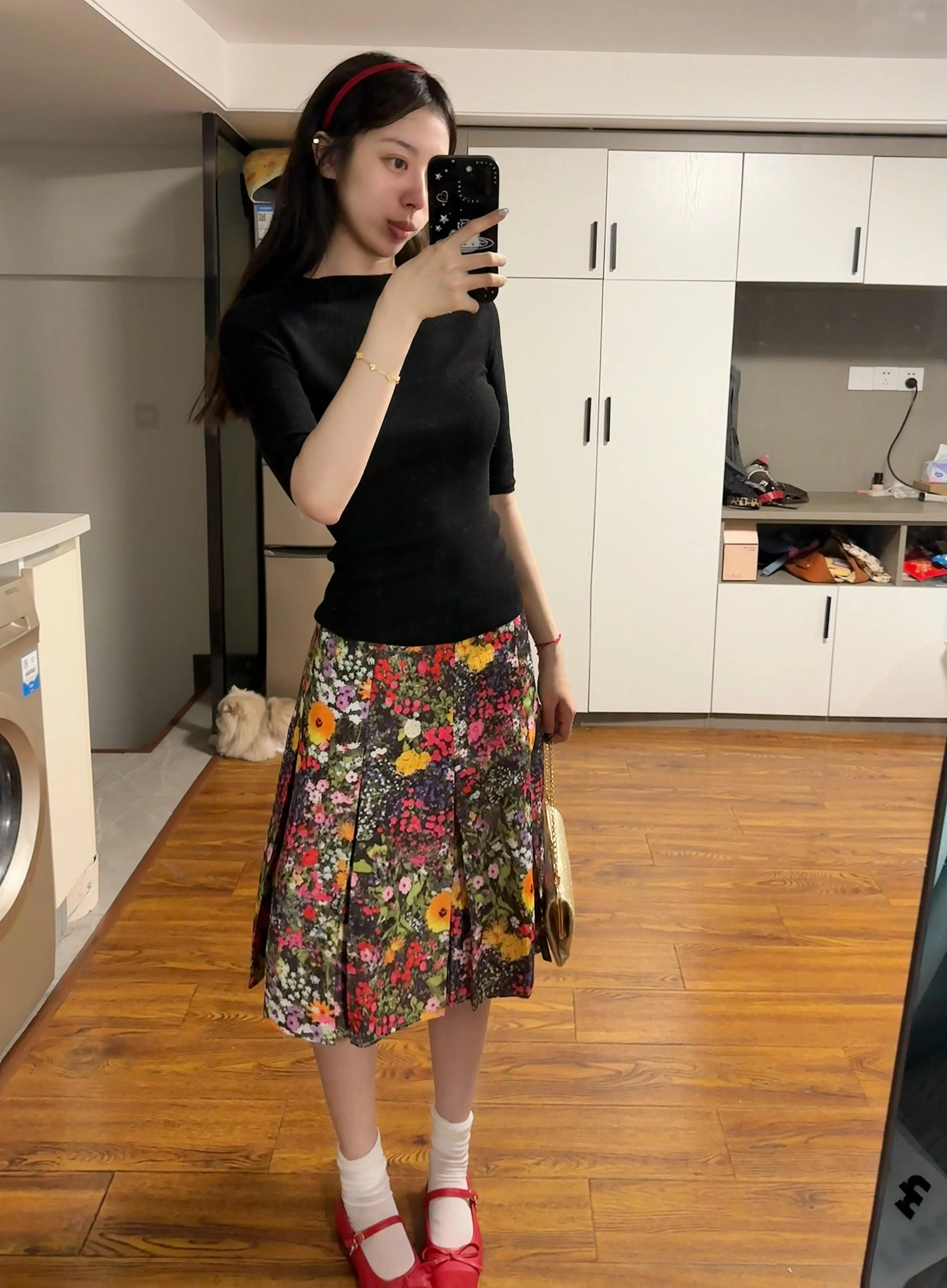 Váy xếp ly in hoa phong cách retro Mỹ cao cấp thanh lịch mùa hè 2025, size lớn, tôn dáng, dài qua gối dành cho nữ