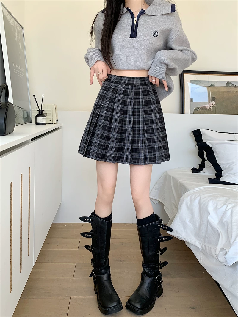 Váy xếp ly kẻ ca rô nâu cổ điển dành cho nữ, mùa thu đông, size lớn, size nhỏ, cạp cao, dáng chữ A, váy ngắn kiểu JK