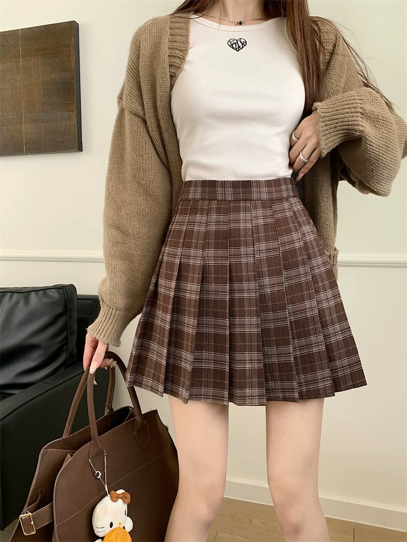 - Váy xếp ly kẻ ca rô nâu cổ điển dành cho nữ, mùa thu đông, size lớn, size nhỏ, cạp cao, dáng chữ A, váy ngắn kiểu JK
