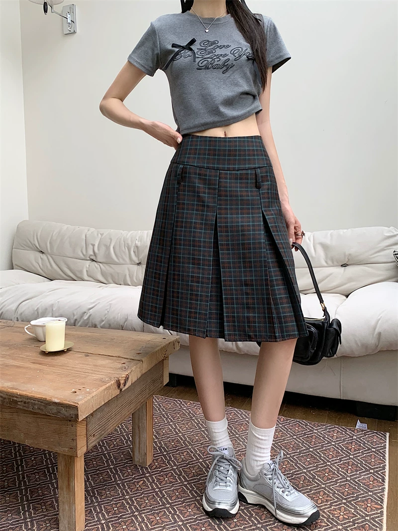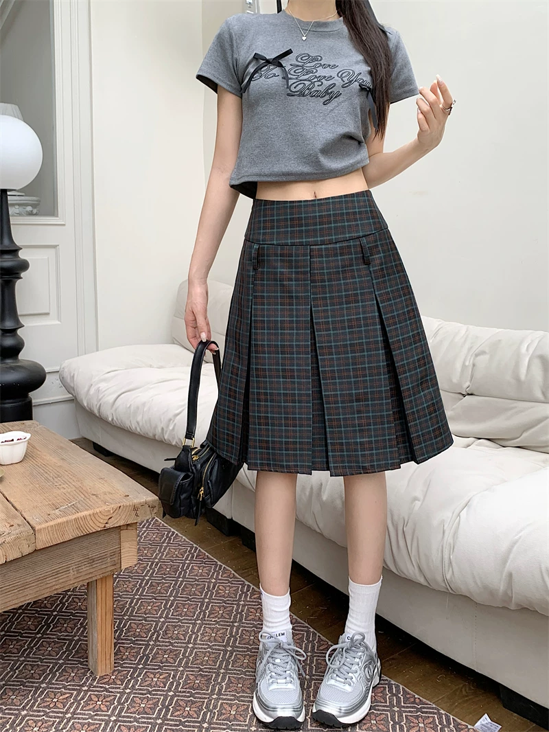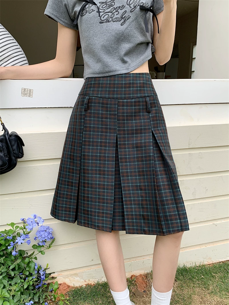 Váy xếp ly kẻ sọc cổ điển kiểu Mỹ, váy ngắn chữ A cỡ lớn dành cho nữ, váy kiểu học sinh cạp cao dành cho phụ nữ nhỏ nhắn.
