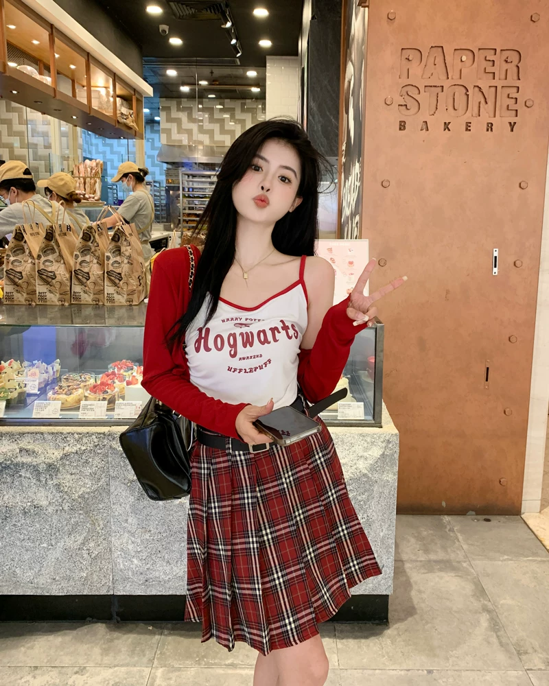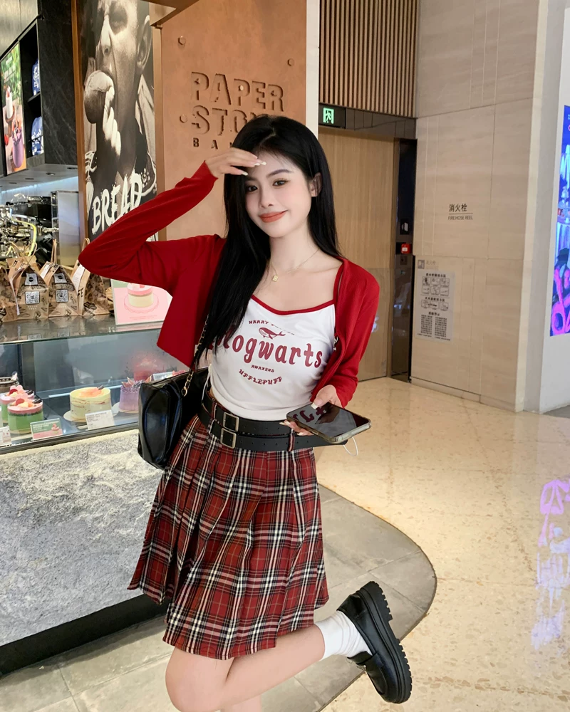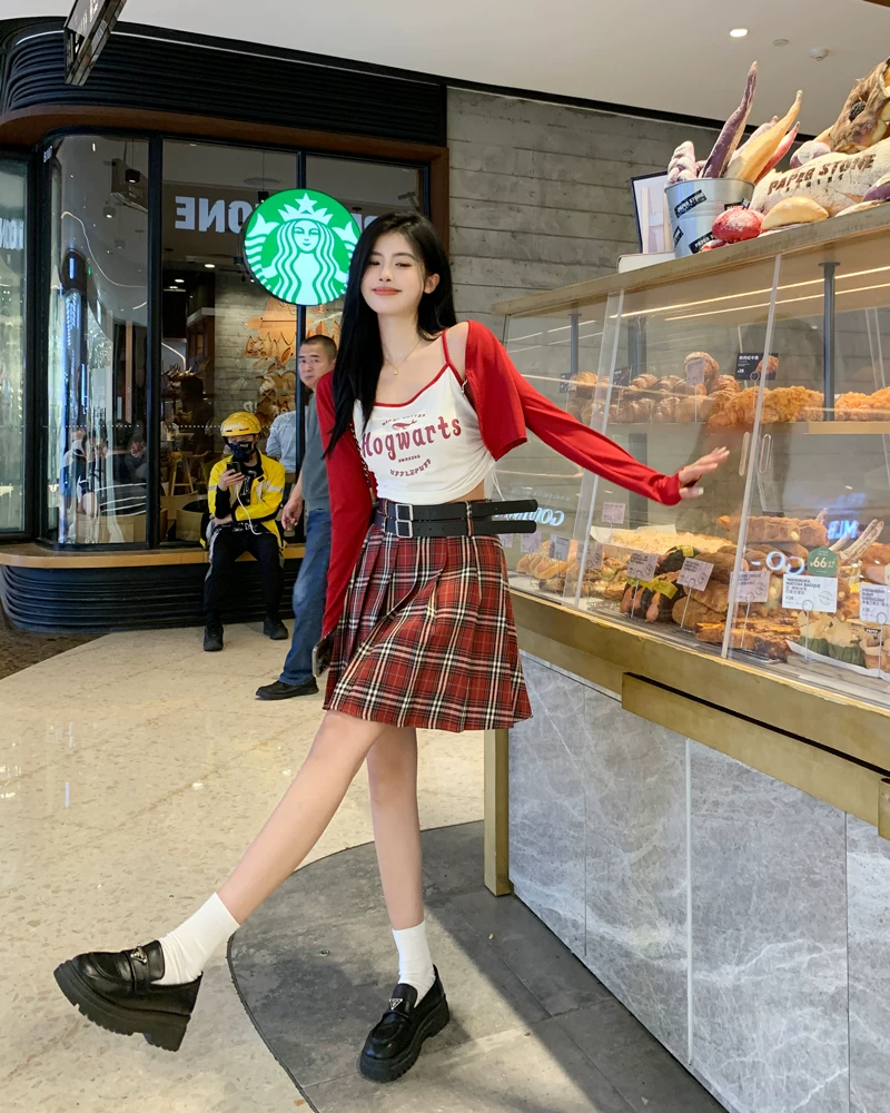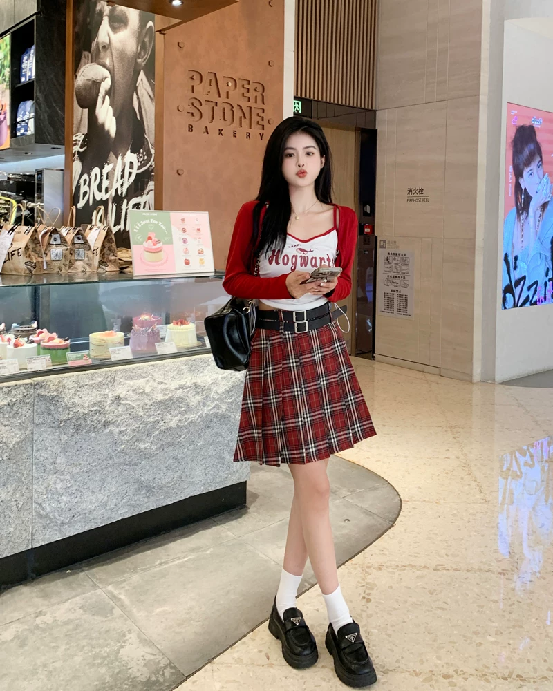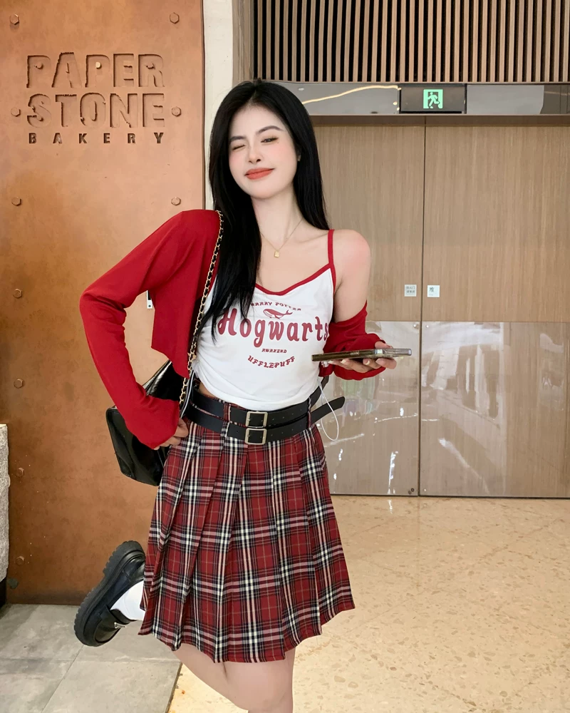 - Váy xếp ly kẻ sọc đỏ cỡ lớn dành cho nữ mùa hè, lưng cao, tôn dáng, váy ngắn chữ A phong cách preppy, váy JK chống lộ.