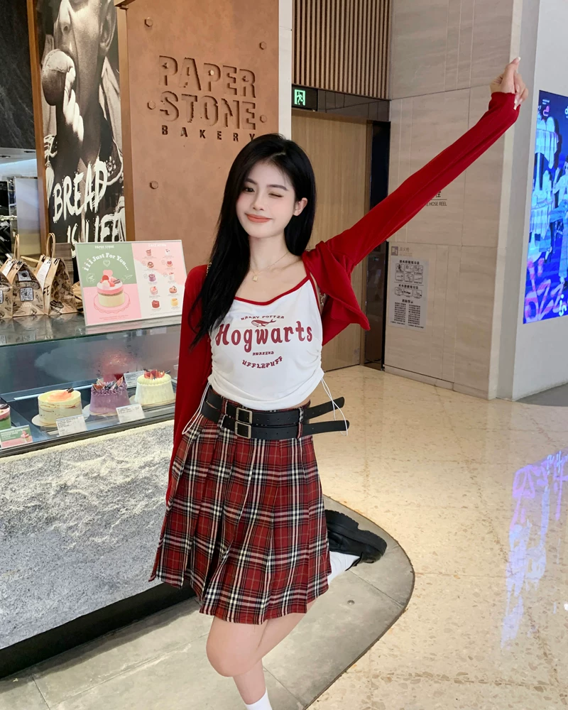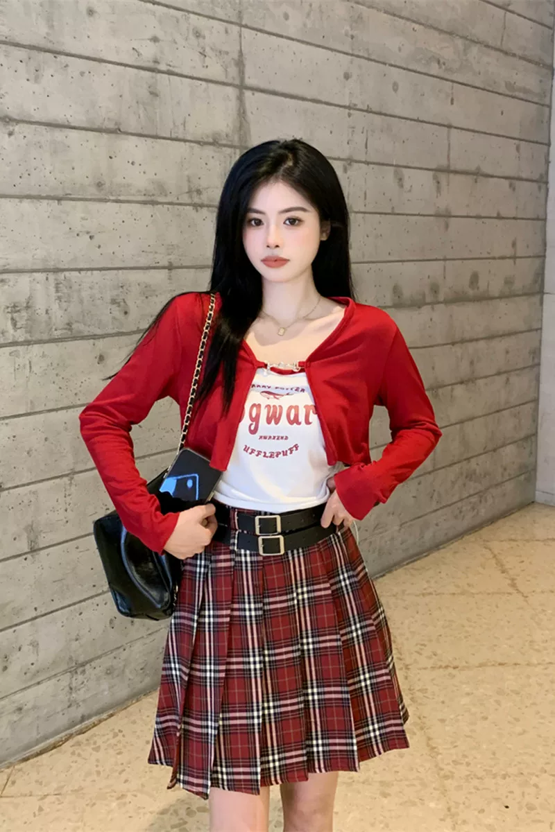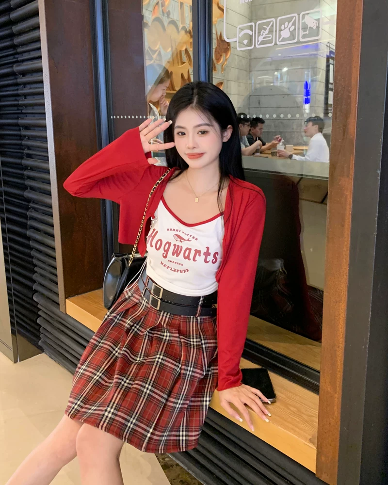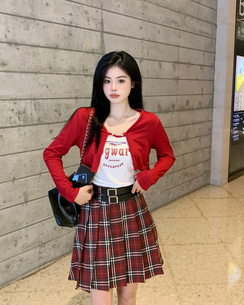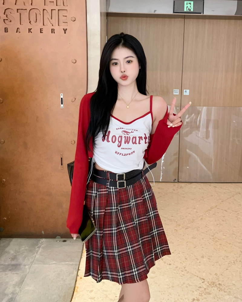 - Váy xếp ly kẻ sọc đỏ cỡ lớn dành cho nữ mùa hè, lưng cao, tôn dáng, váy ngắn chữ A phong cách preppy, váy JK chống lộ.