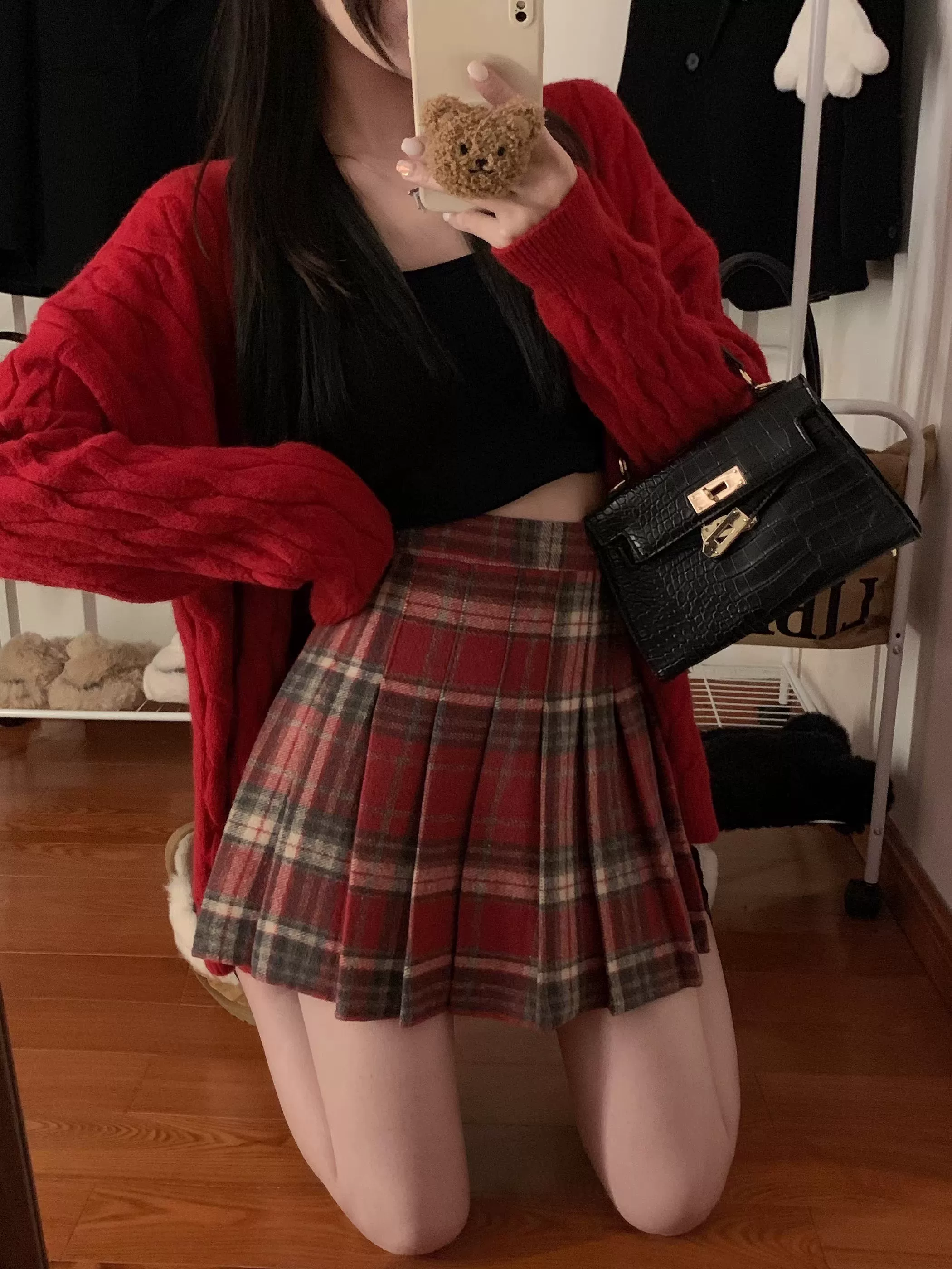 Váy xếp ly kẻ sọc đỏ len phong cách đại học dành cho nữ, mùa thu đông, cỡ lớn, eo cao, dáng nhỏ nhắn, váy ngắn chữ A giúp thon gọn.