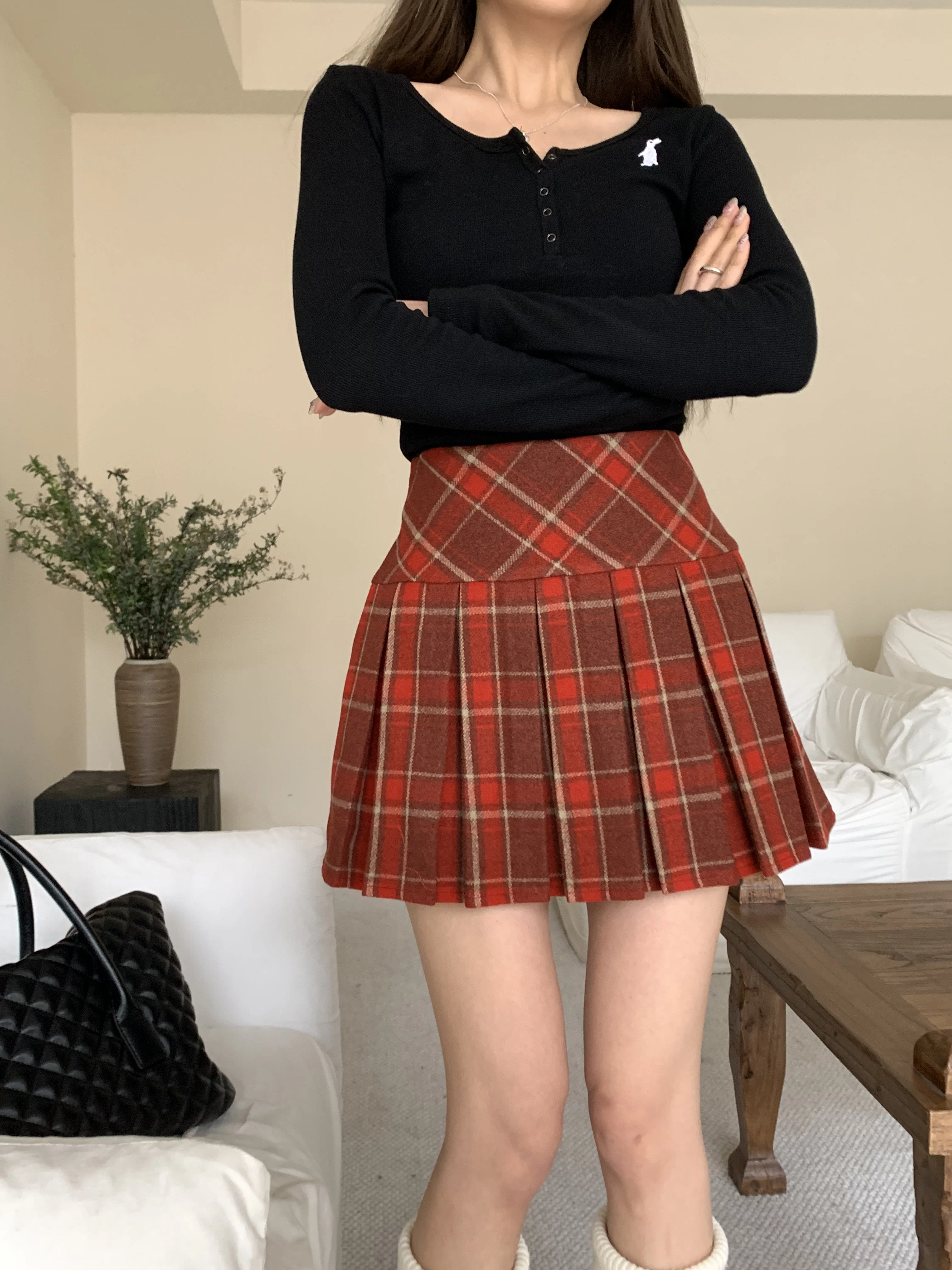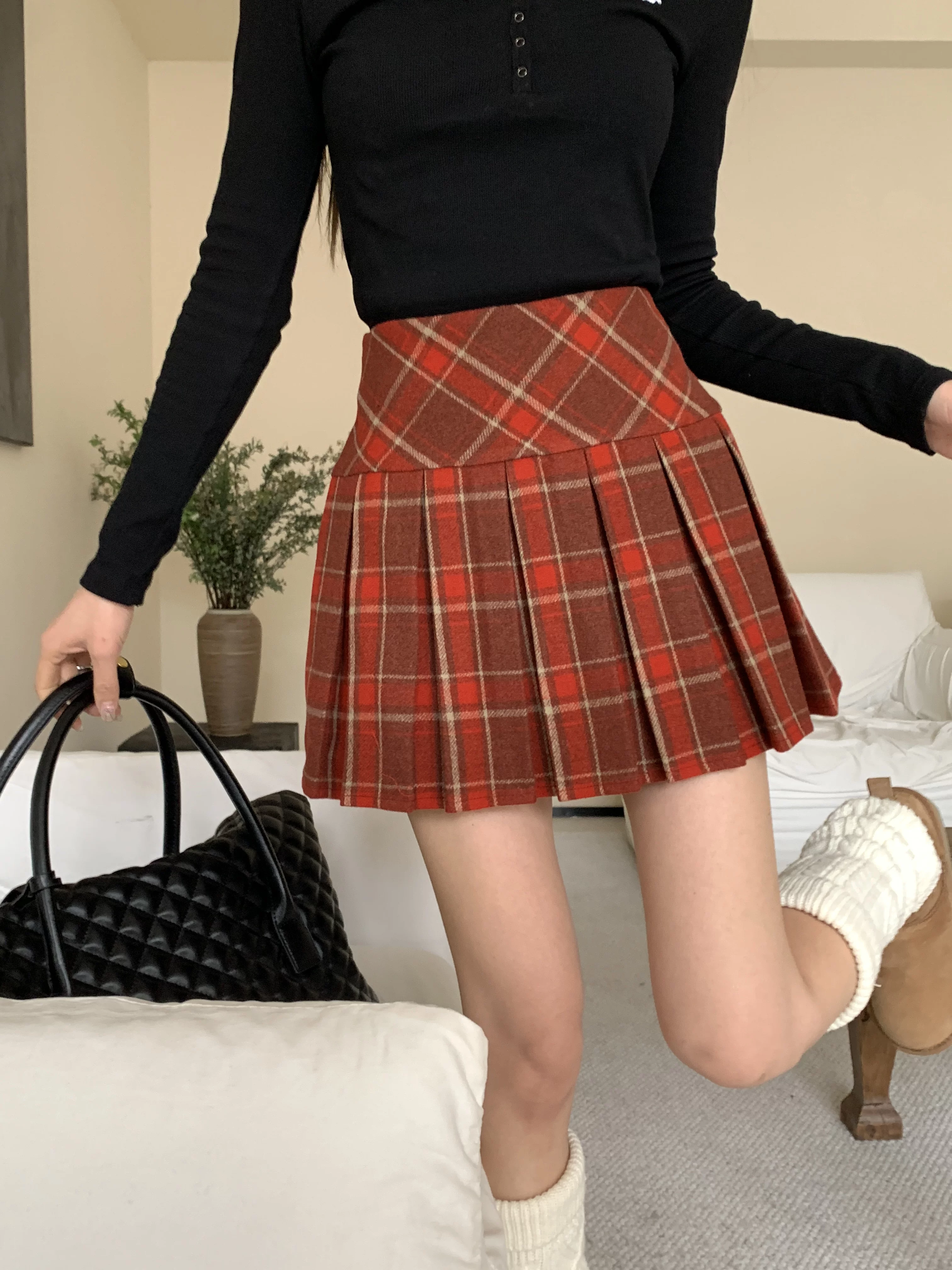 Váy xếp ly kẻ sọc đỏ phong cách preppy của Mỹ, váy ngắn kẻ sọc len dáng chữ A cạp cao cỡ lớn, váy ngắn mùa thu đông
