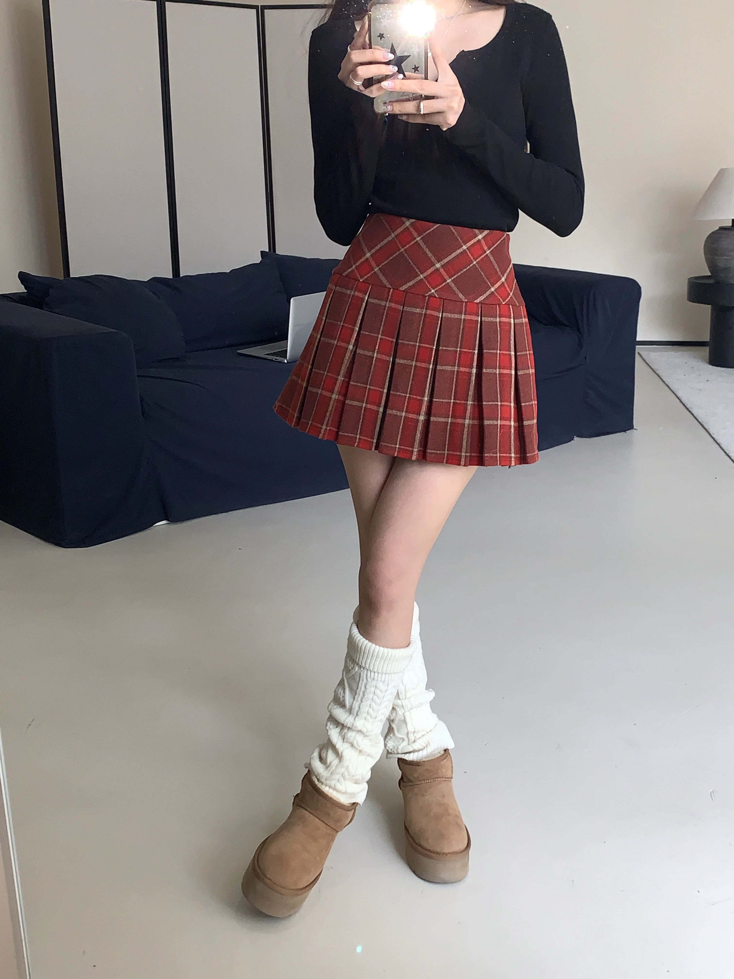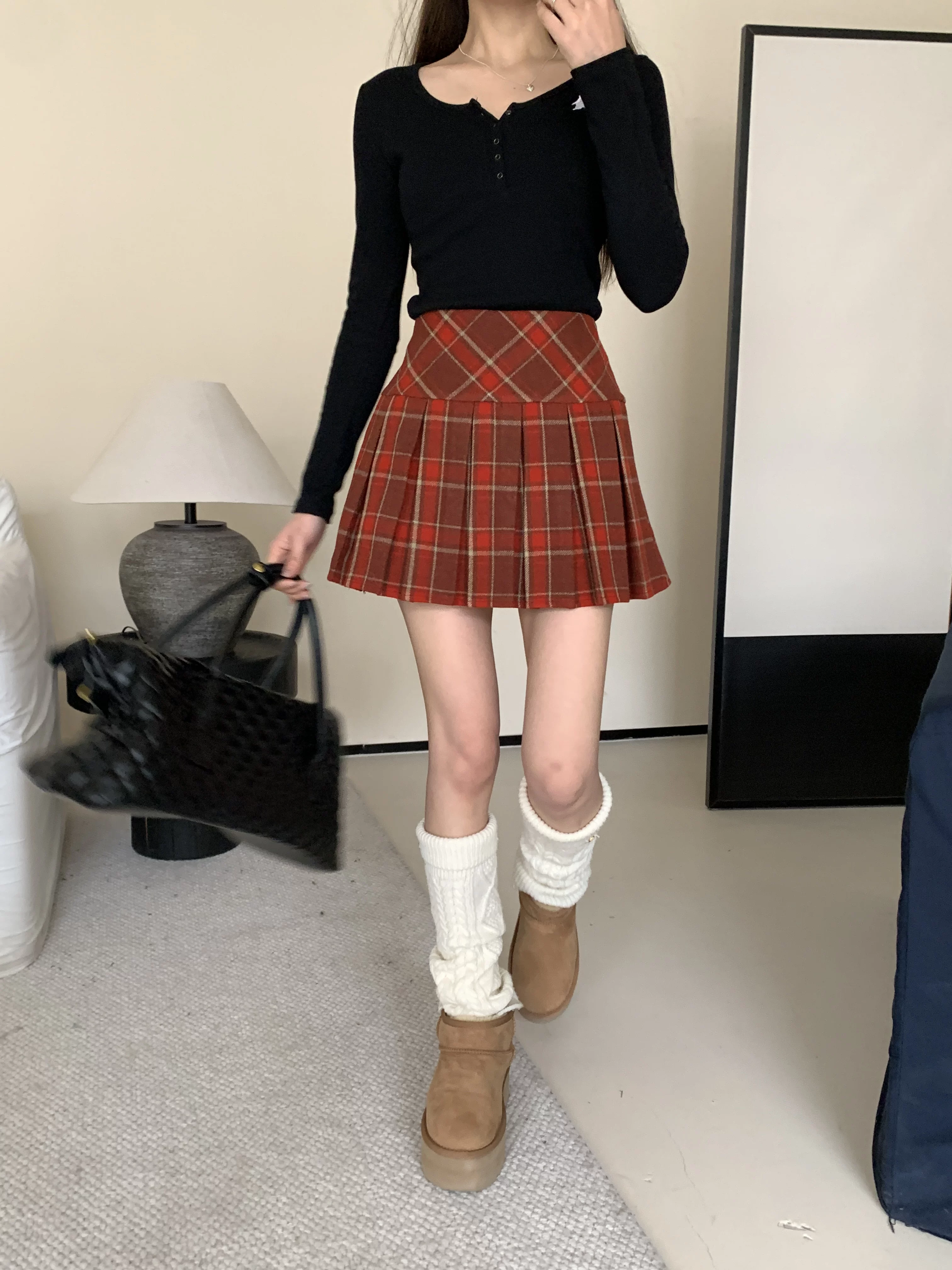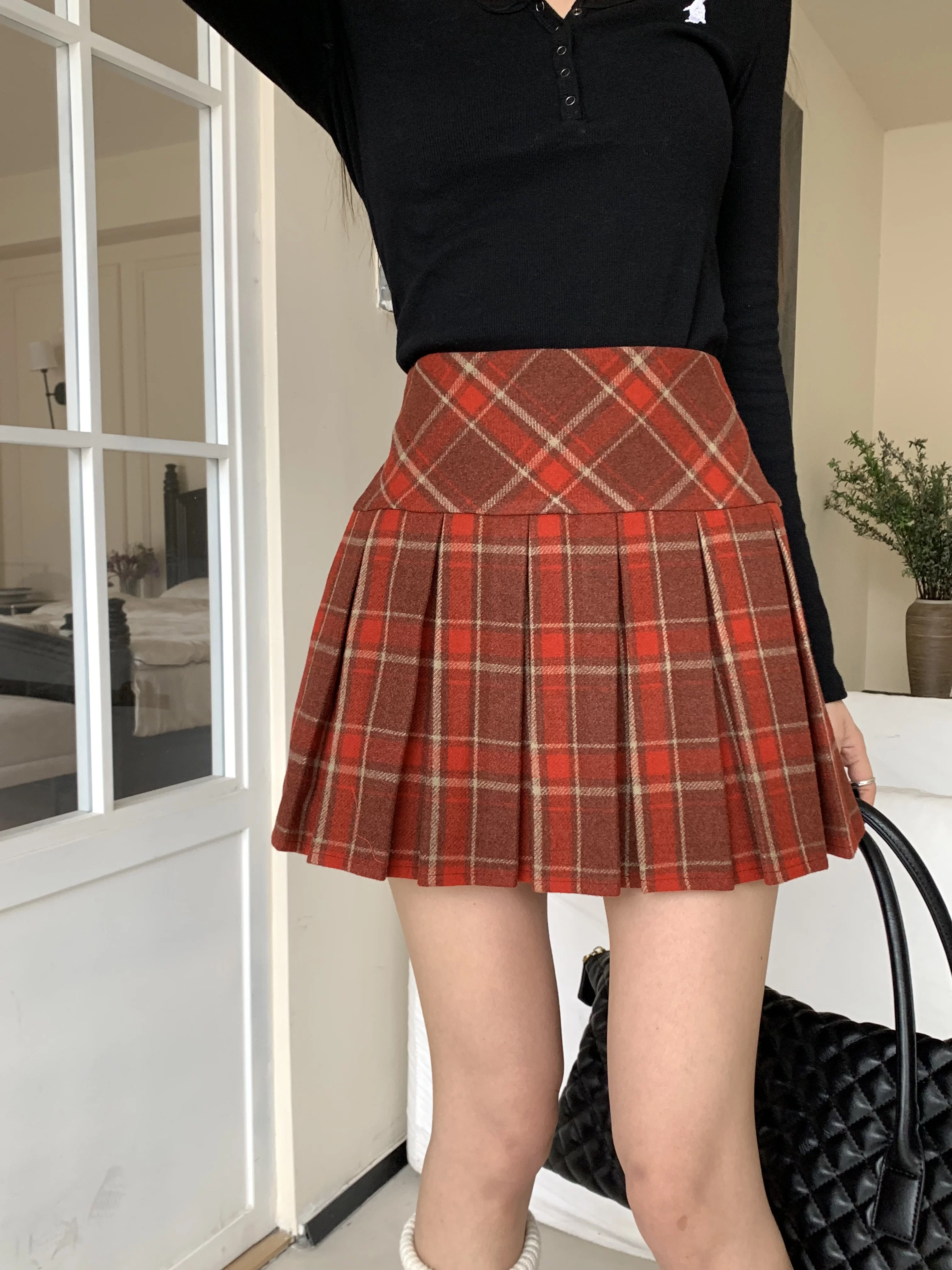 - Váy xếp ly kẻ sọc đỏ phong cách preppy của Mỹ, váy ngắn kẻ sọc len dáng chữ A cạp cao cỡ lớn, váy ngắn mùa thu đông