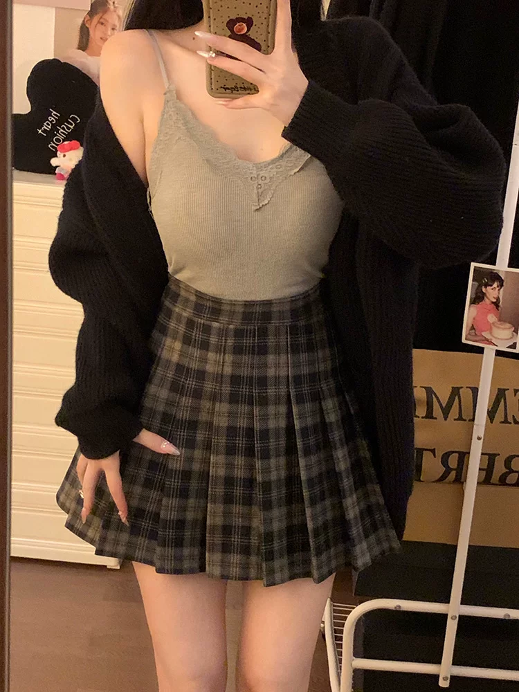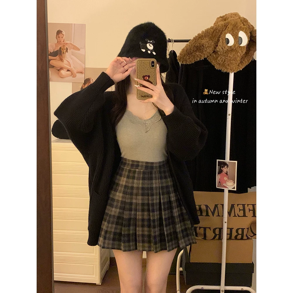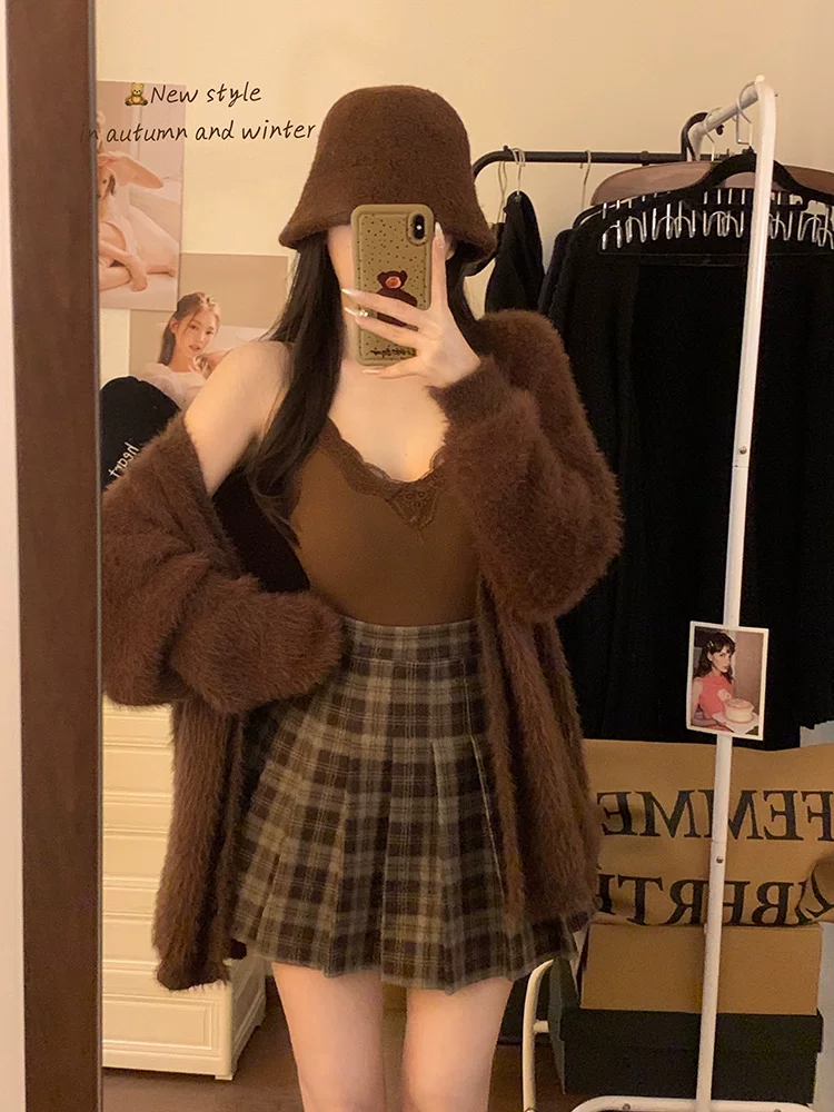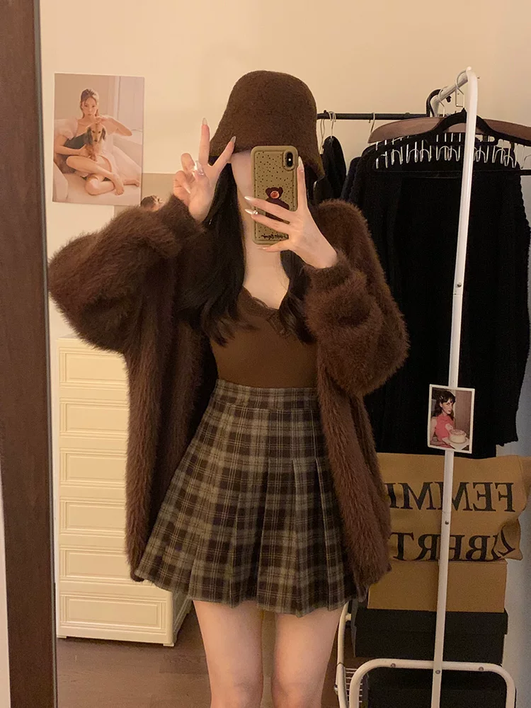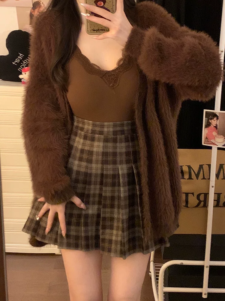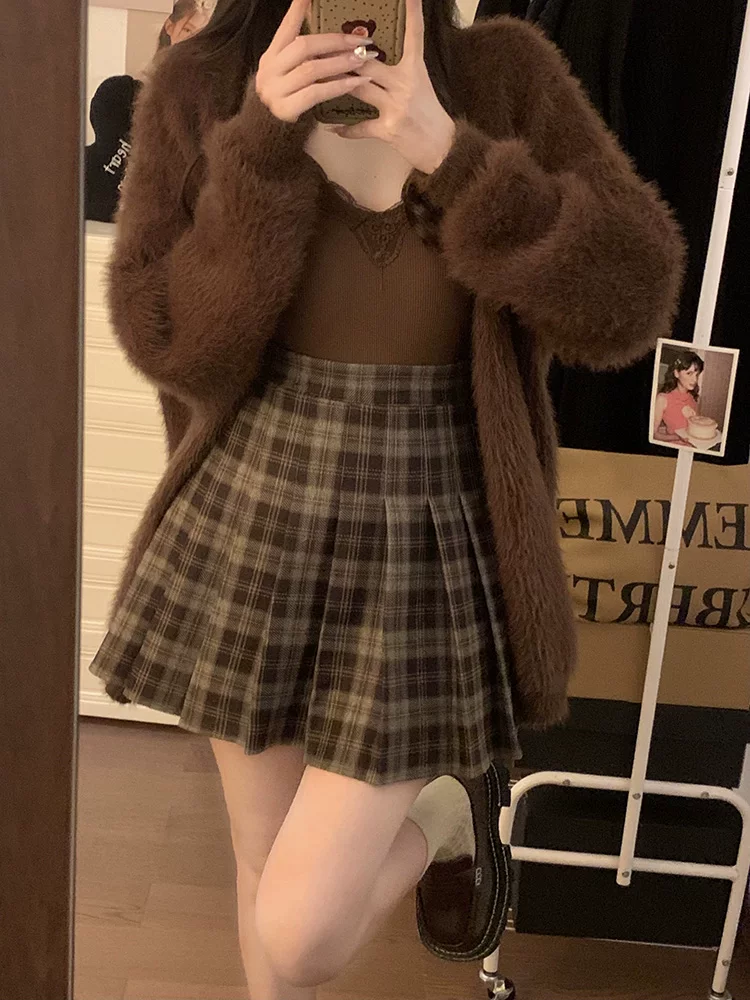 - Váy xếp ly kẻ sọc nâu nữ, kiểu dáng chữ A, thu đông 2025, mới, cạp cao, tôn dáng, váy ngắn kiểu JK