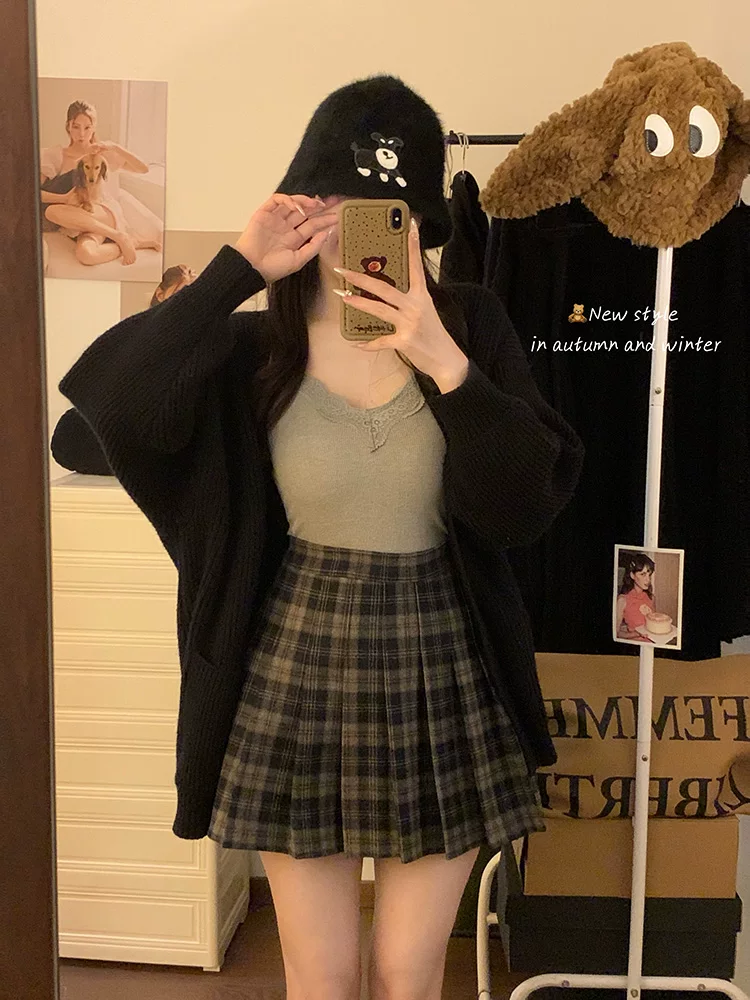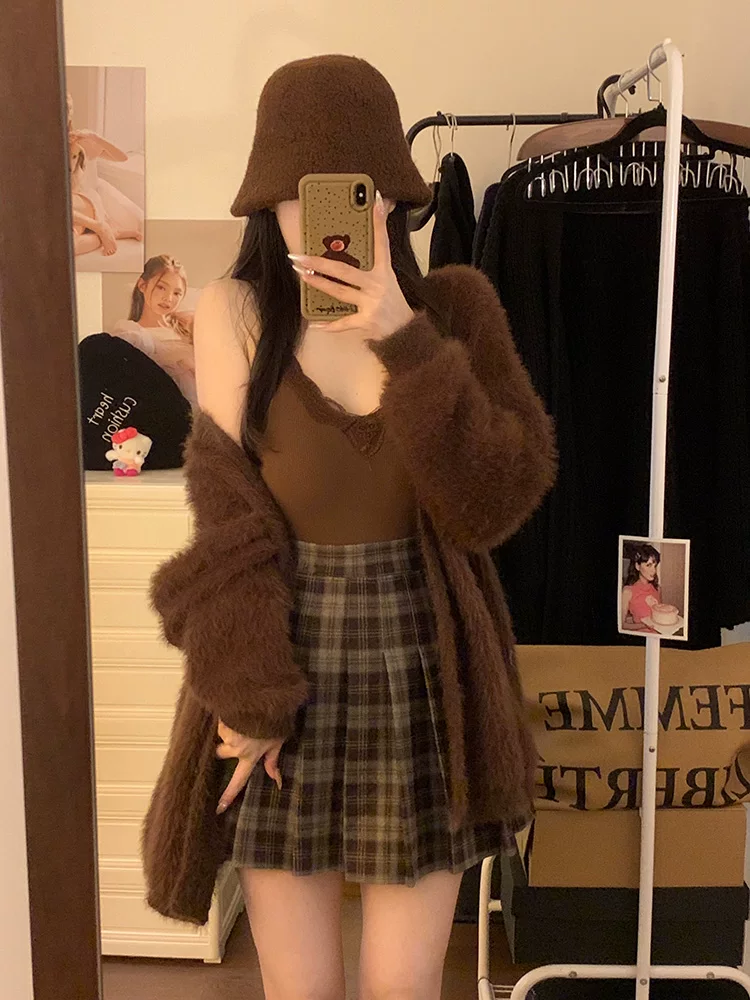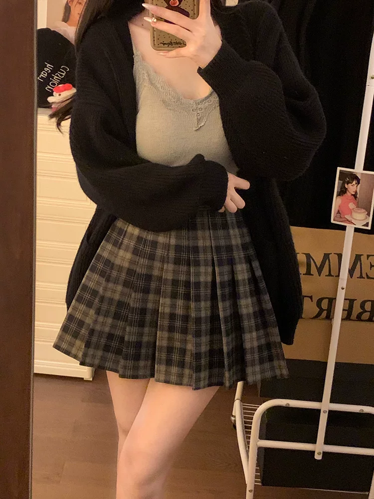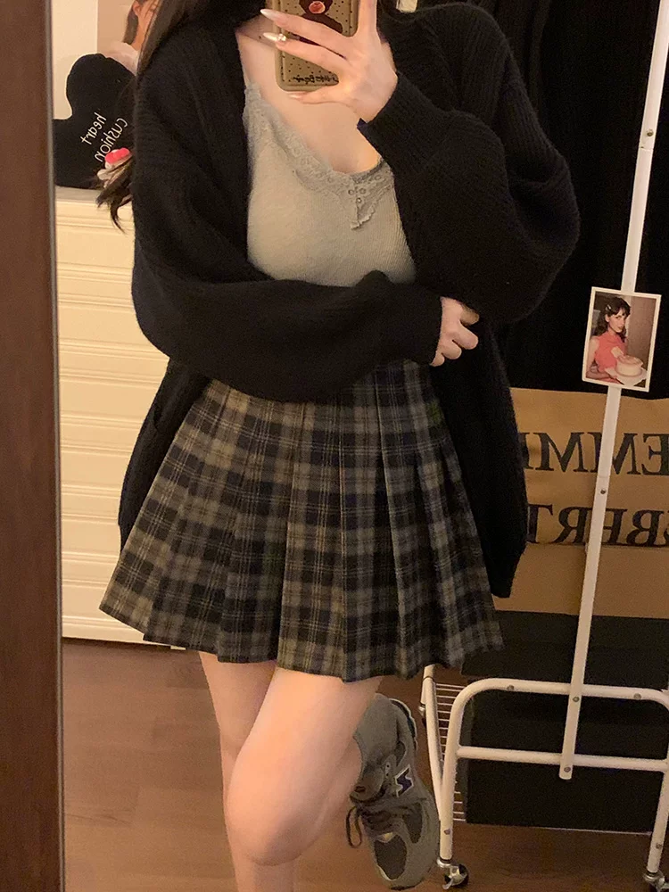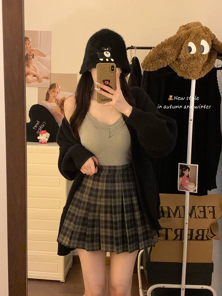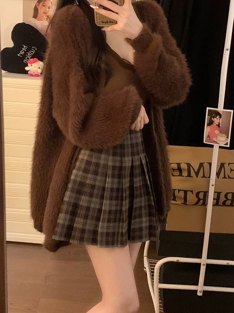 - Váy xếp ly kẻ sọc nâu nữ, kiểu dáng chữ A, thu đông 2025, mới, cạp cao, tôn dáng, váy ngắn kiểu JK