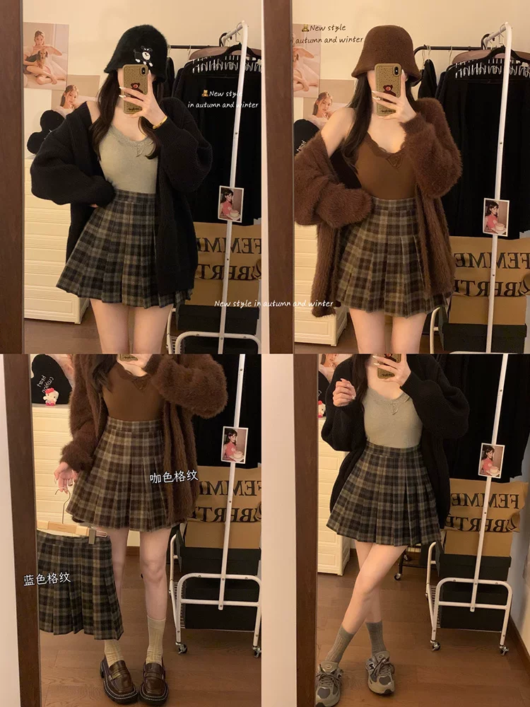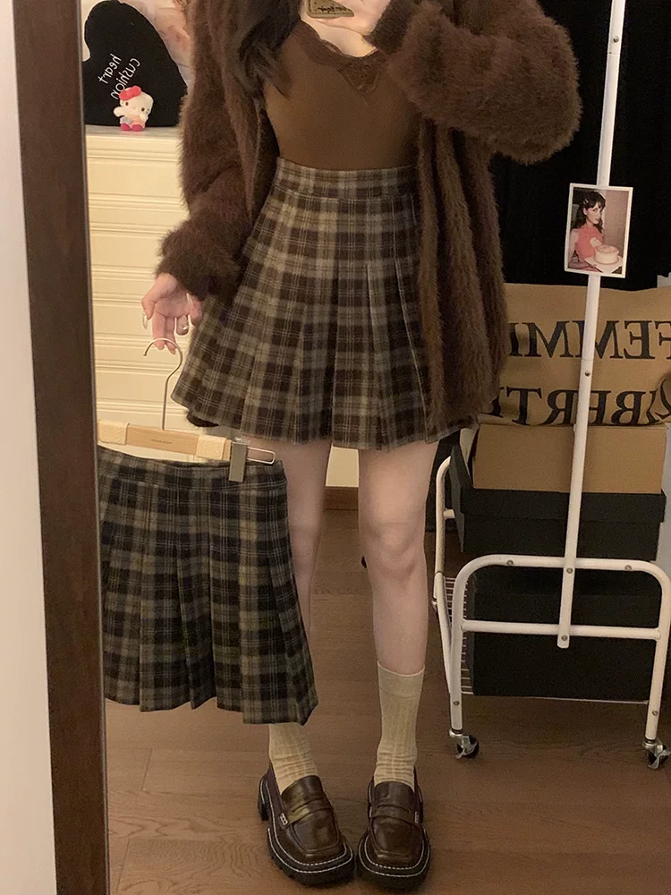 Váy xếp ly kẻ sọc nâu nữ, kiểu dáng chữ A, thu đông 2025, mới, cạp cao, tôn dáng, váy ngắn kiểu JK