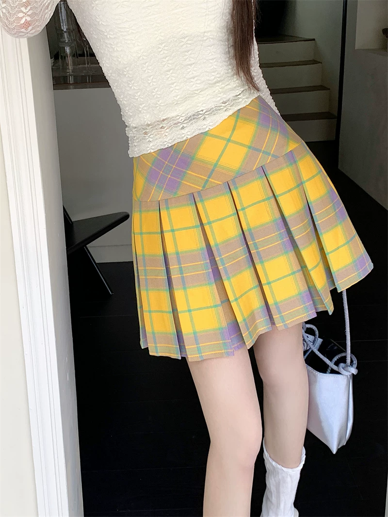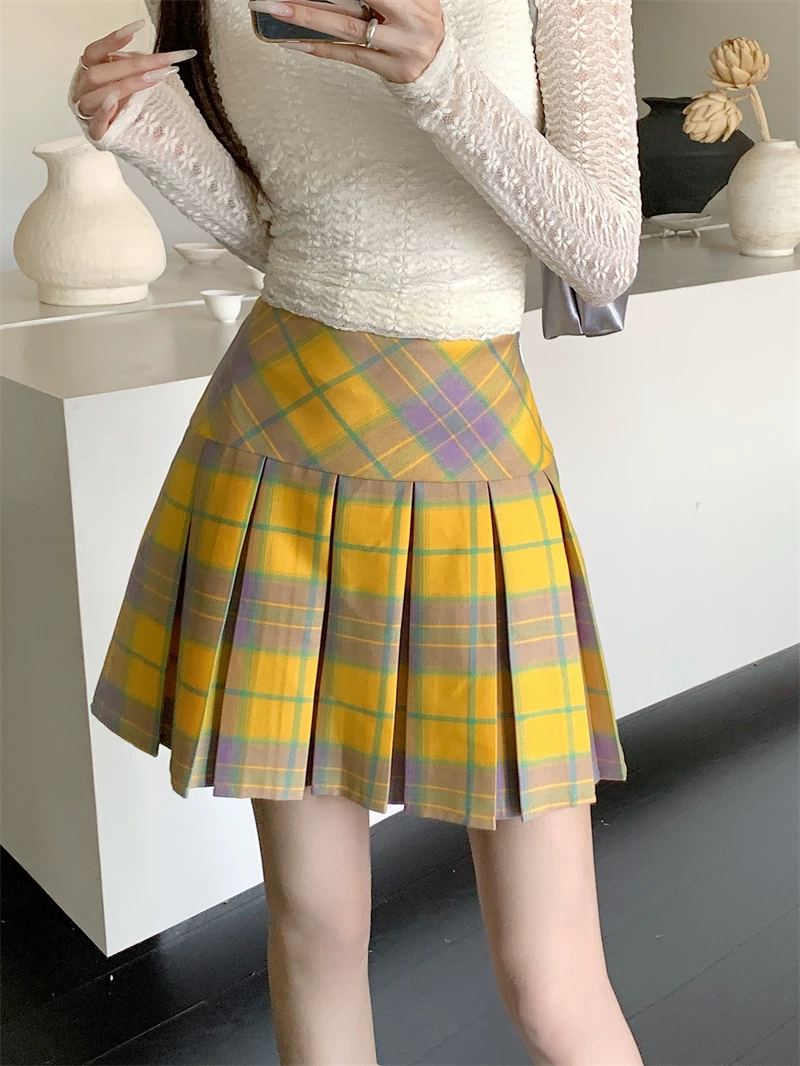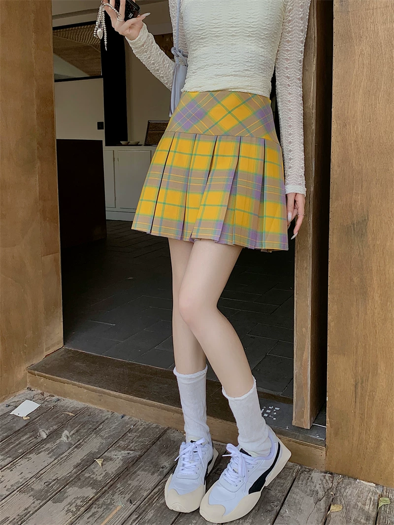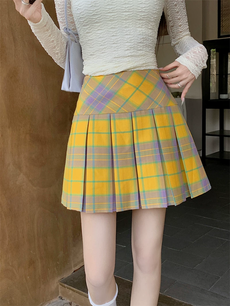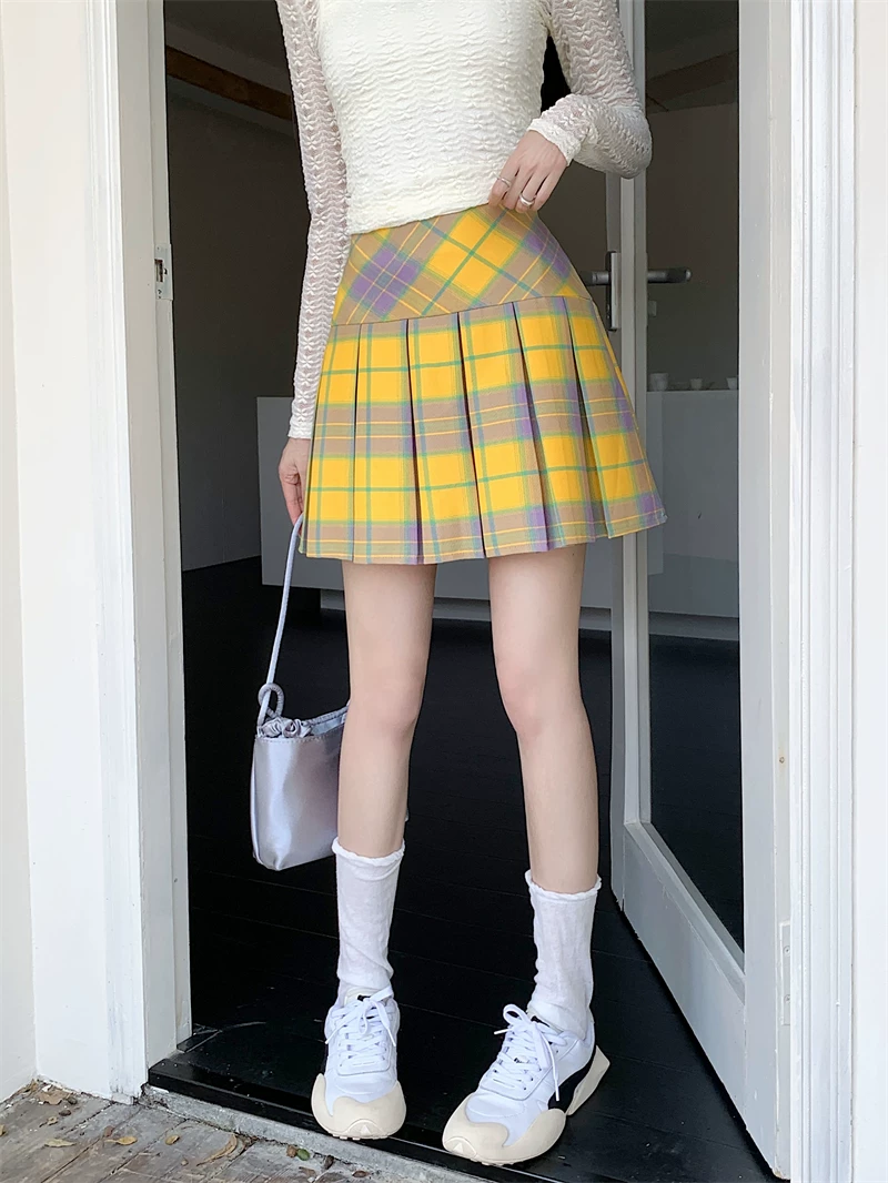 - Váy xếp ly kẻ sọc vàng cổ điển kiểu Mỹ mùa hè cỡ lớn eo cao váy ngắn giảm béo váy kẻ sọc chữ A ôm hông dành cho nữ