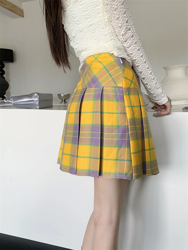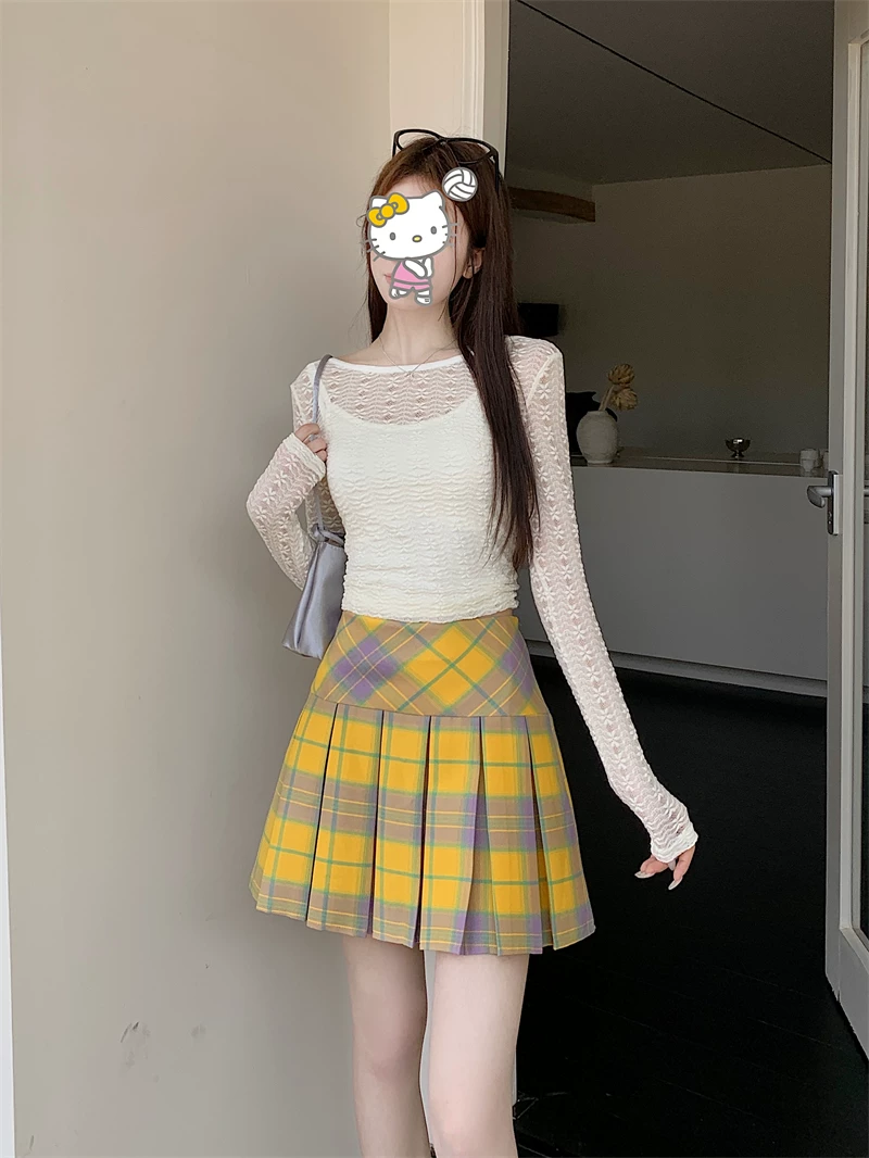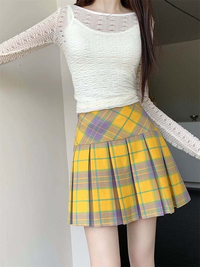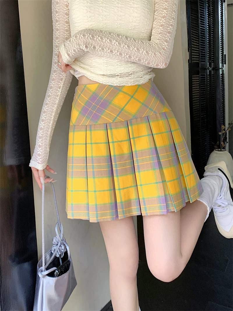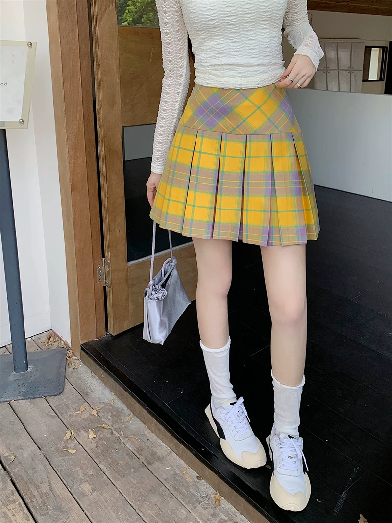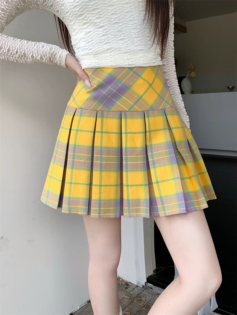 - Váy xếp ly kẻ sọc vàng cổ điển kiểu Mỹ mùa hè cỡ lớn eo cao váy ngắn giảm béo váy kẻ sọc chữ A ôm hông dành cho nữ