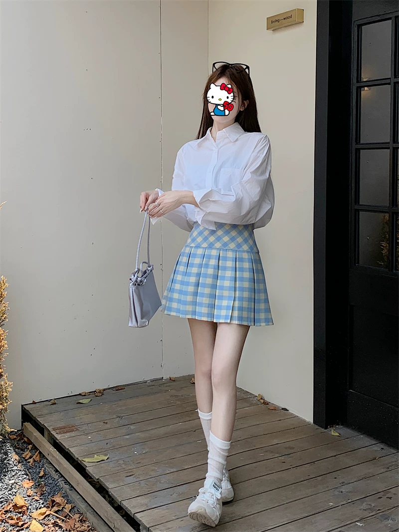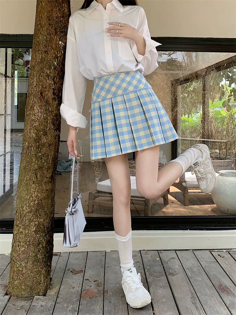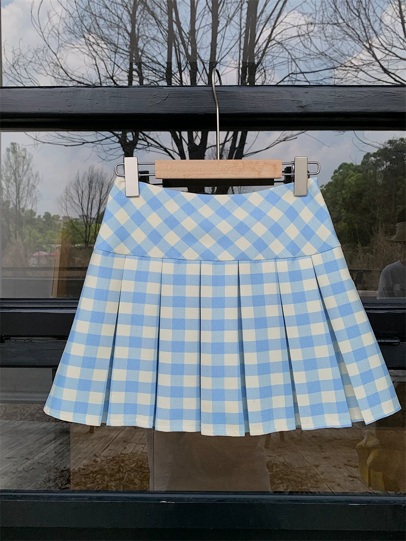 Váy xếp ly kẻ sọc xanh kiểu Mỹ dành cho nữ, cỡ lớn, váy chữ A cạp cao, phong cách đại học mùa hè, váy ngắn kẻ sọc chống lộ