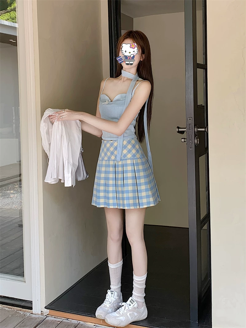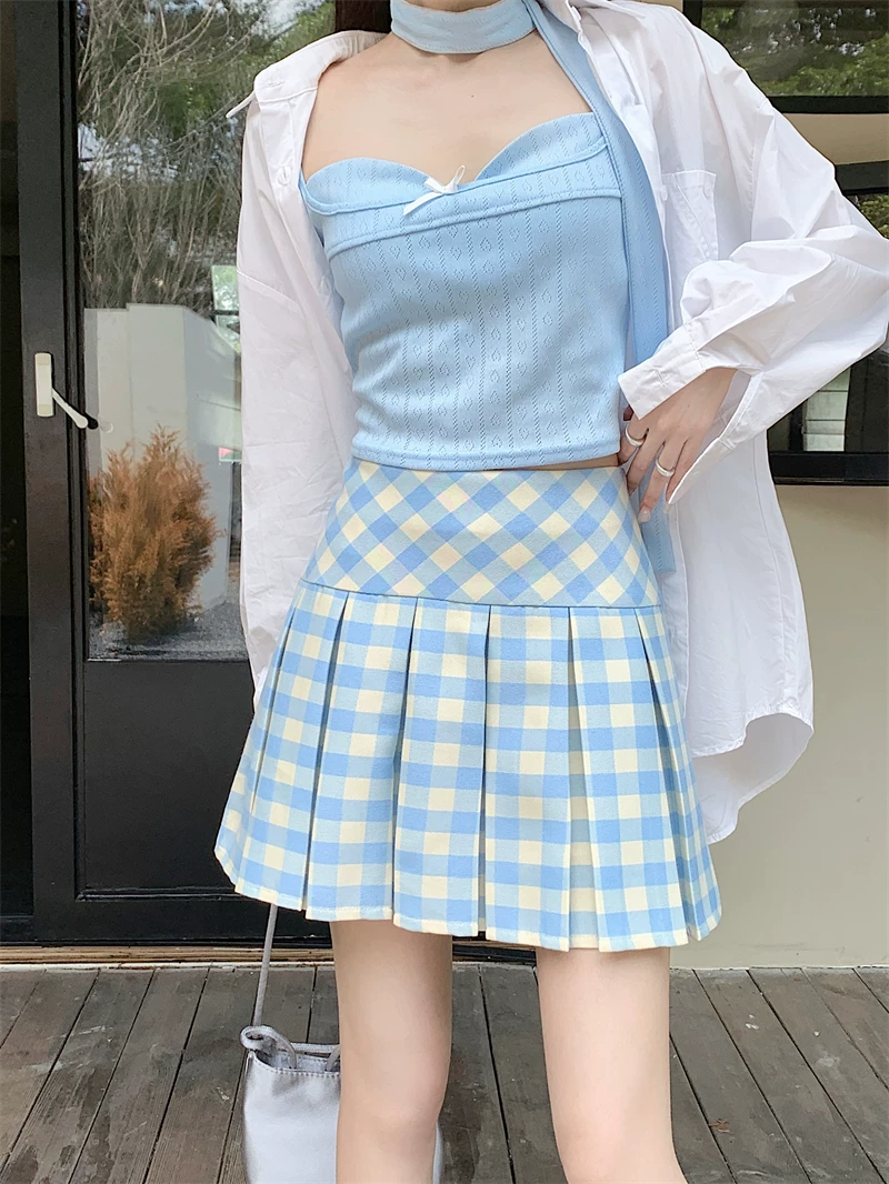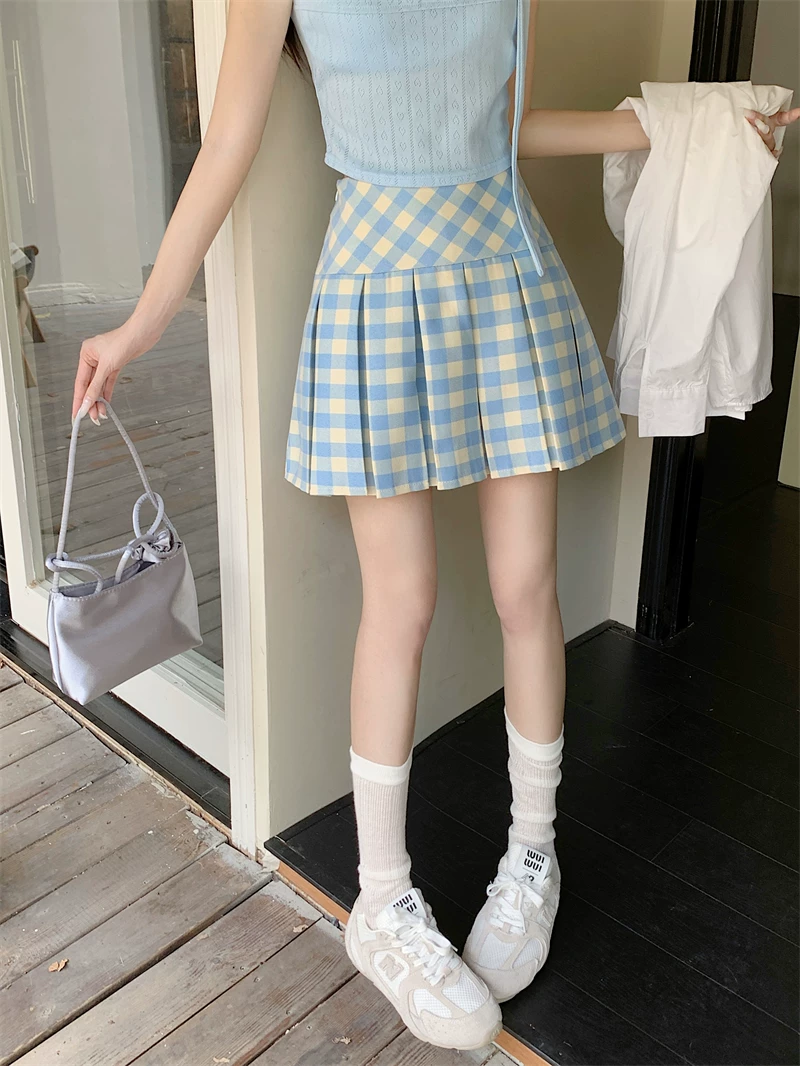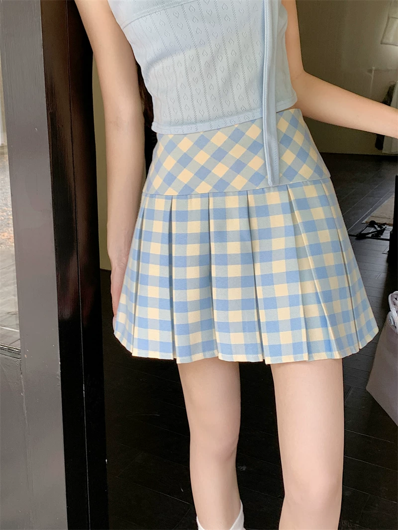 - Váy xếp ly kẻ sọc xanh kiểu Mỹ dành cho nữ, cỡ lớn, váy chữ A cạp cao, phong cách đại học mùa hè, váy ngắn kẻ sọc chống lộ