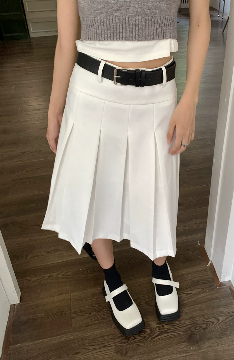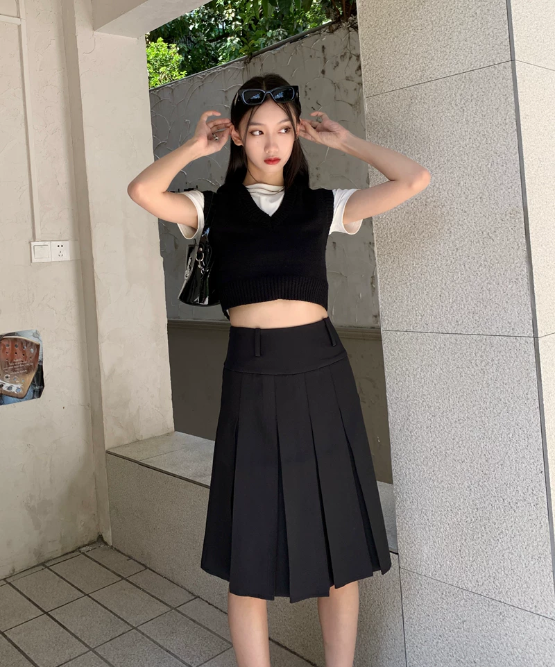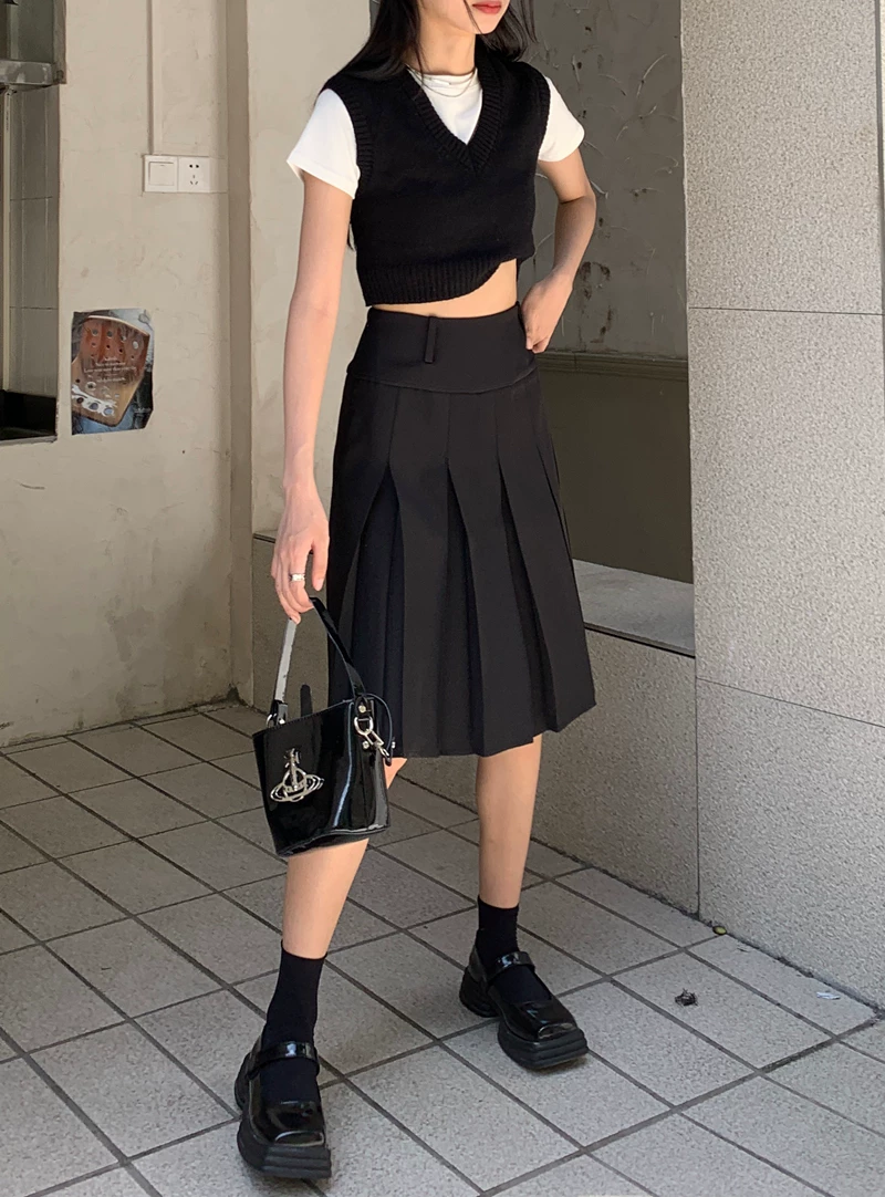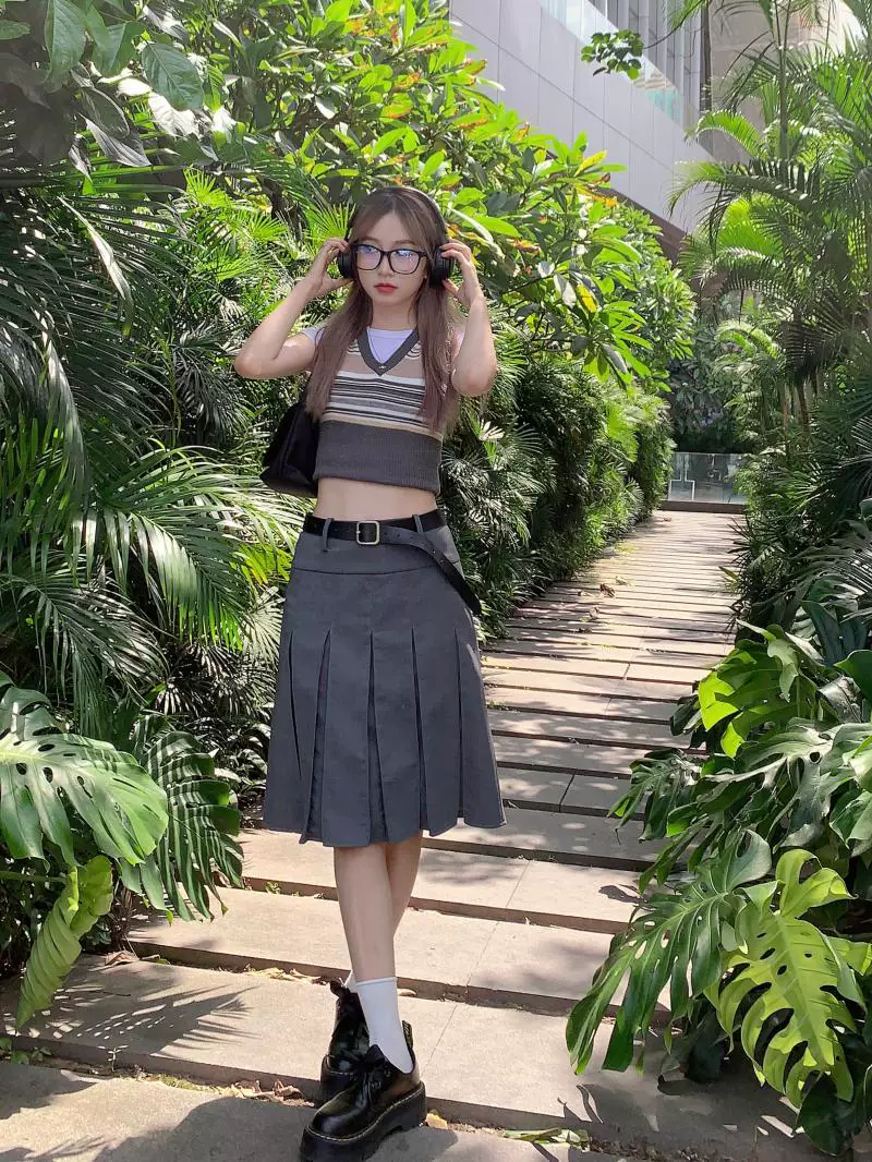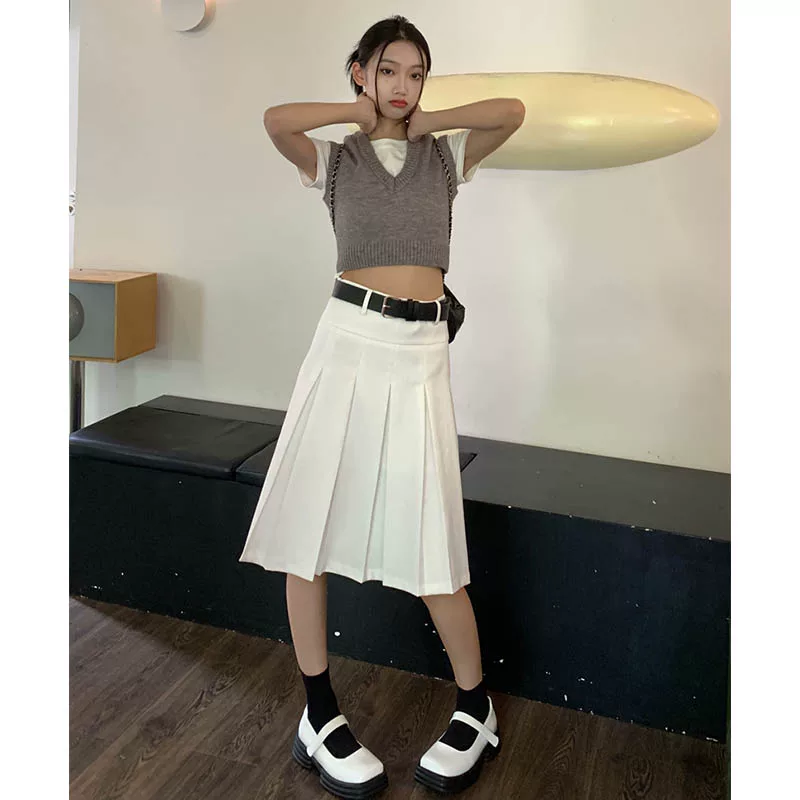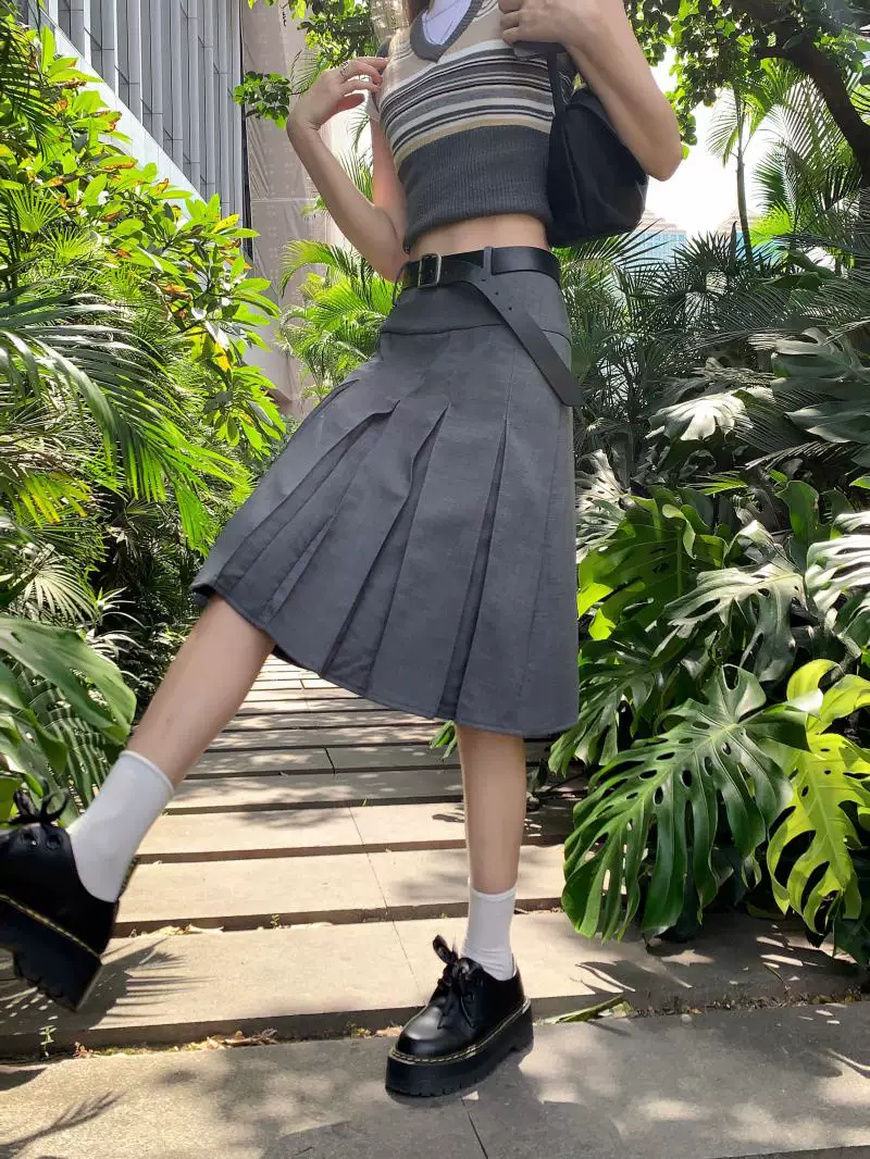 - Váy xếp ly kiểu học sinh, cạp cao, size lớn cho nữ, màu xám, dáng chữ A, thiết kế tôn dáng mùa thu.