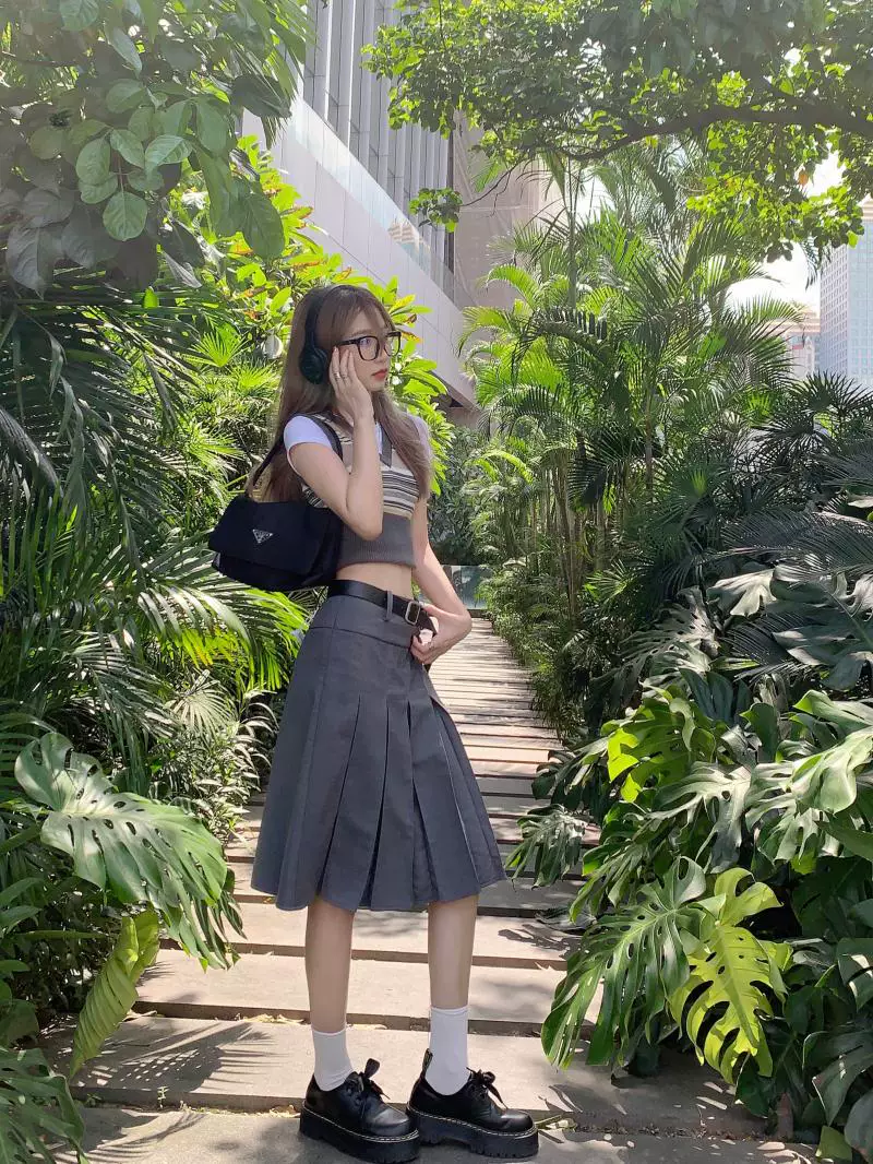 Váy xếp ly kiểu học sinh, cạp cao, size lớn cho nữ, màu xám, dáng chữ A, thiết kế tôn dáng mùa thu.