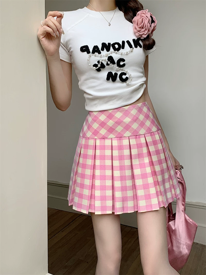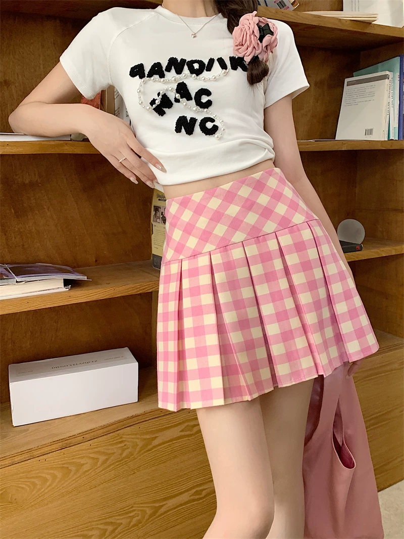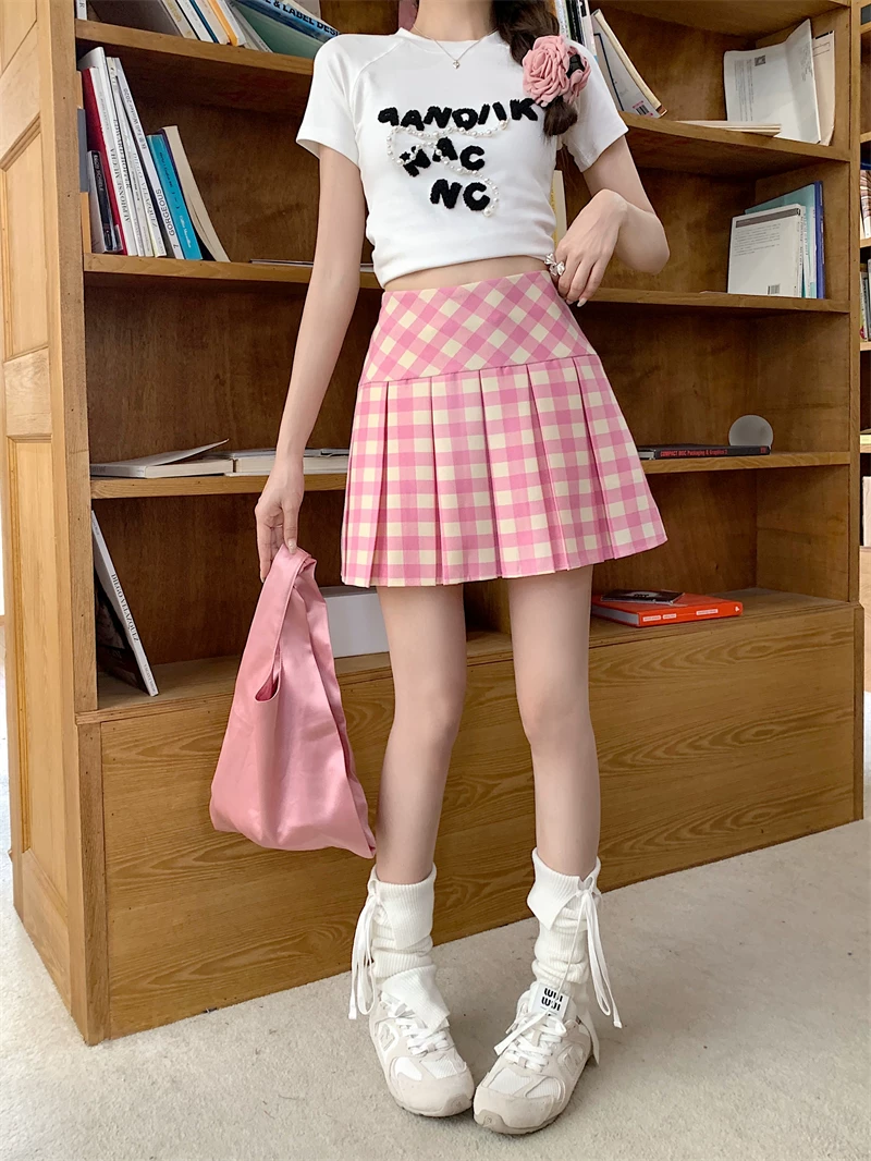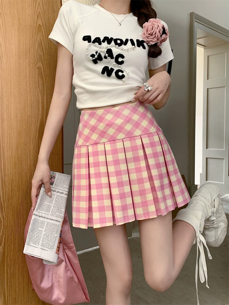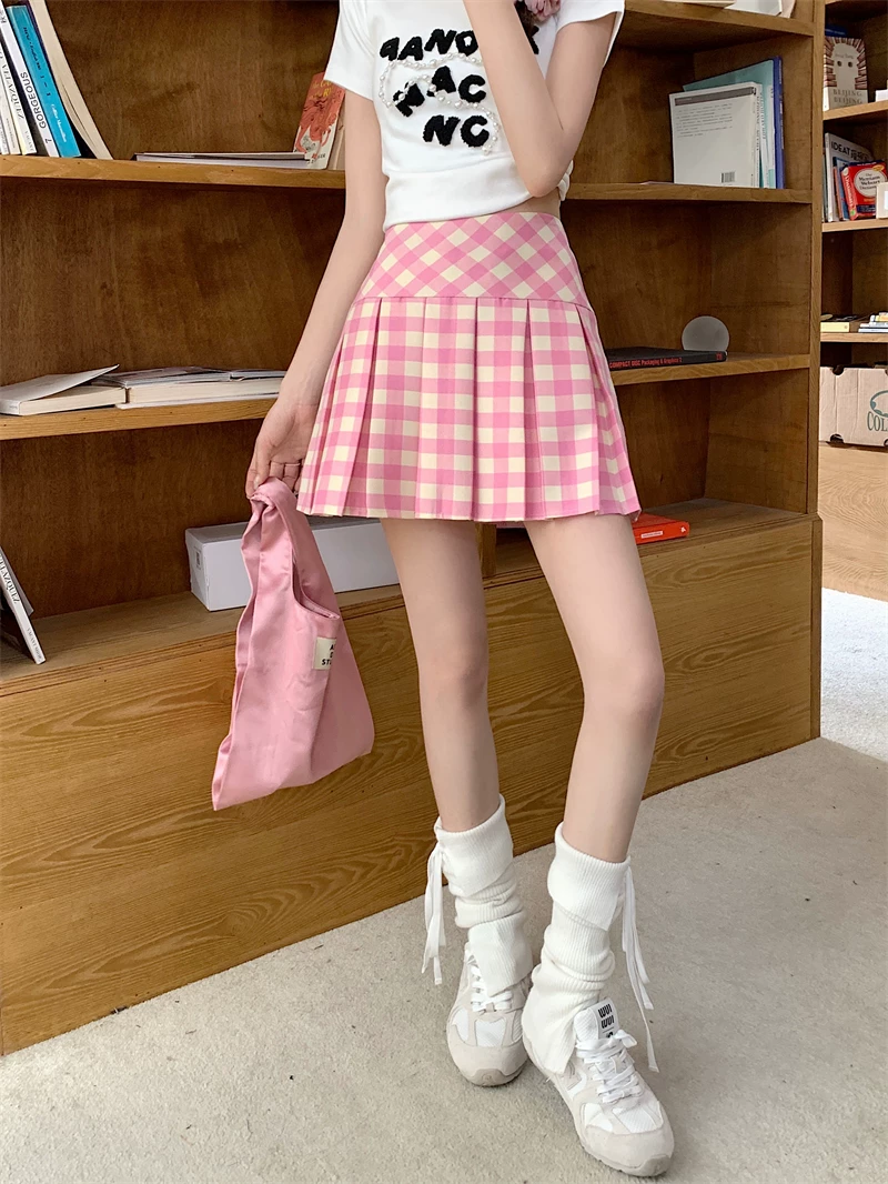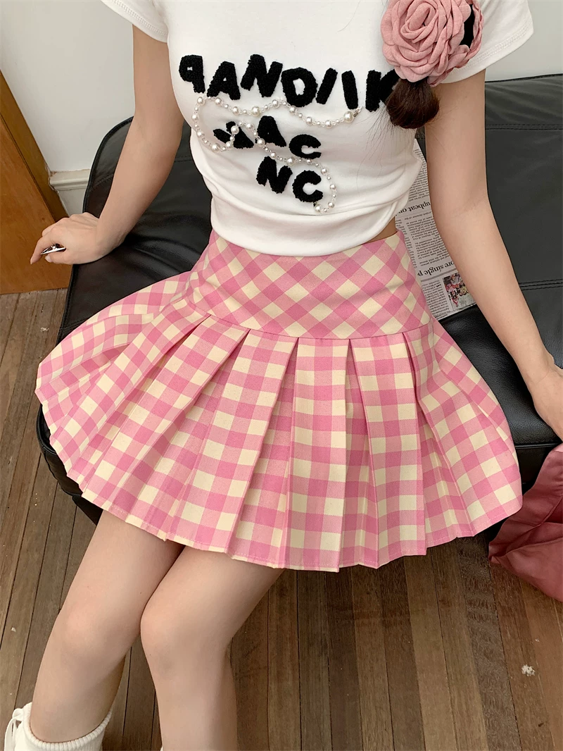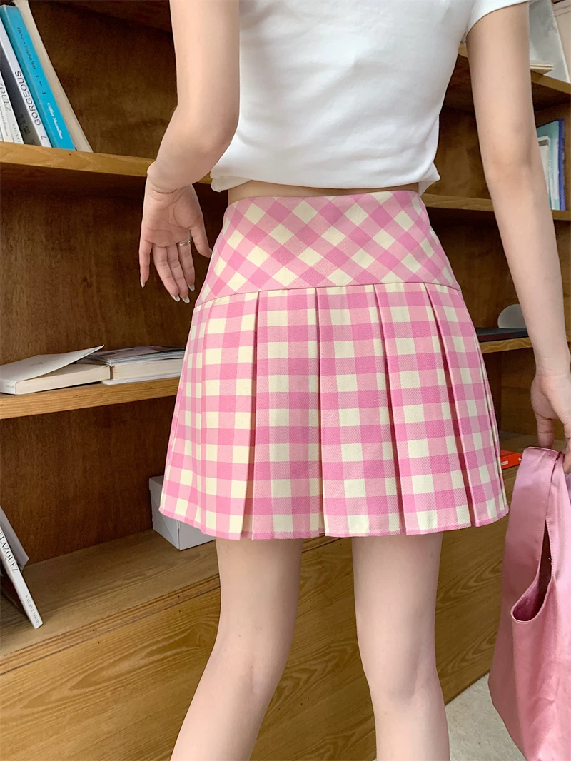 Váy xếp ly lưng cao kẻ sọc hồng cỡ lớn, váy kẻ sọc dopamine mùa hè dành cho nữ, váy ngắn chữ A thon gọn