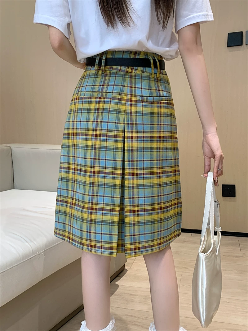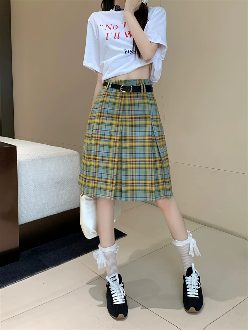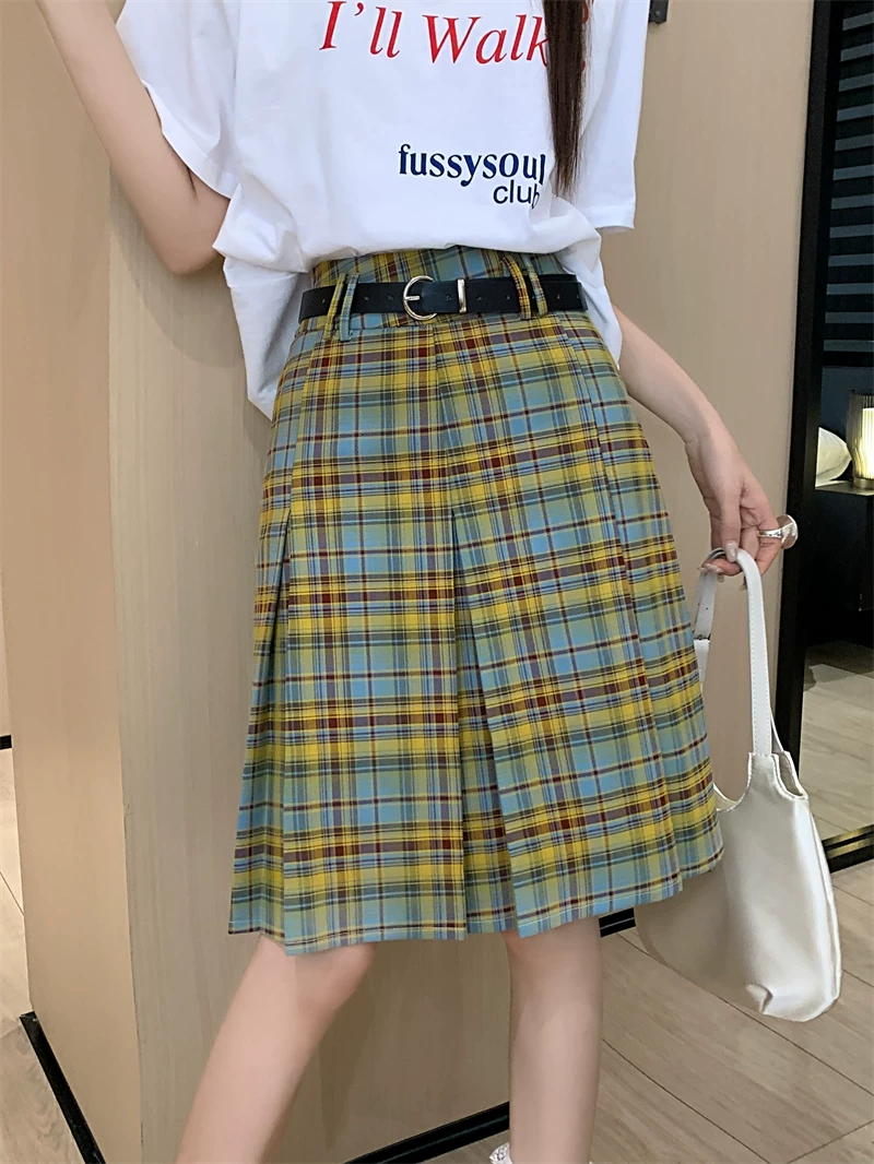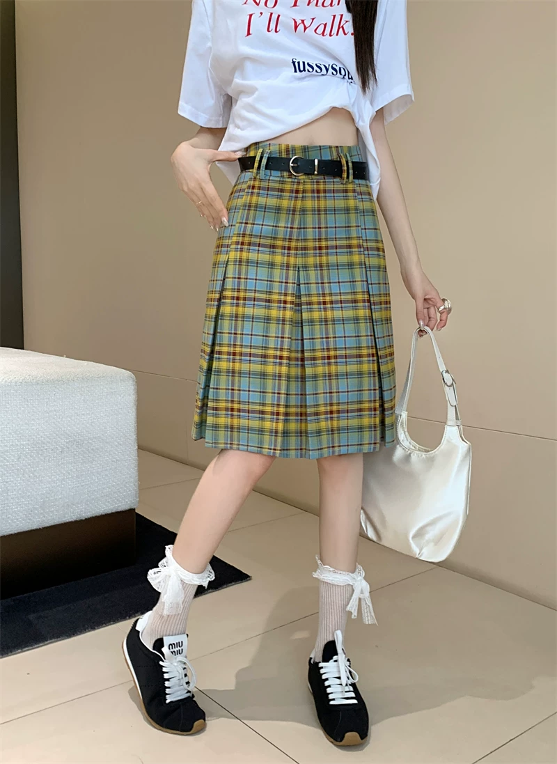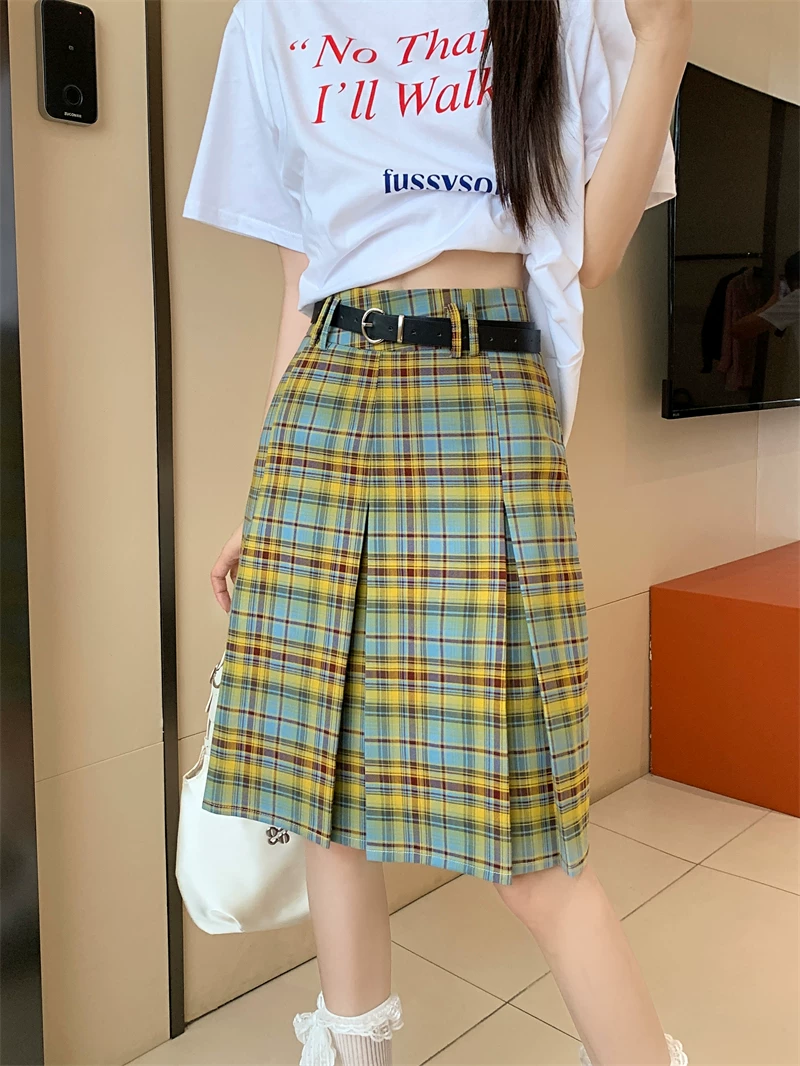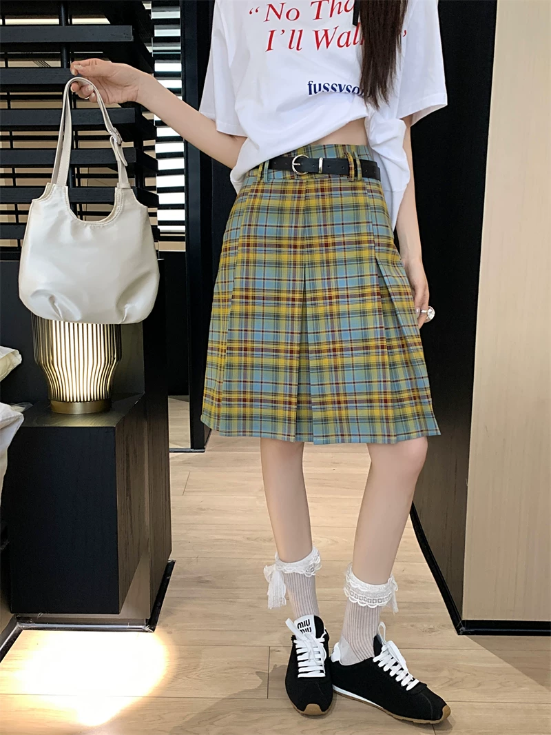 Váy xếp ly lưng cao phong cách preppy cỡ lớn, váy kẻ sọc xanh vàng mùa hè dành cho nữ, váy dài vừa vặn dáng chữ A giúp thon gọn