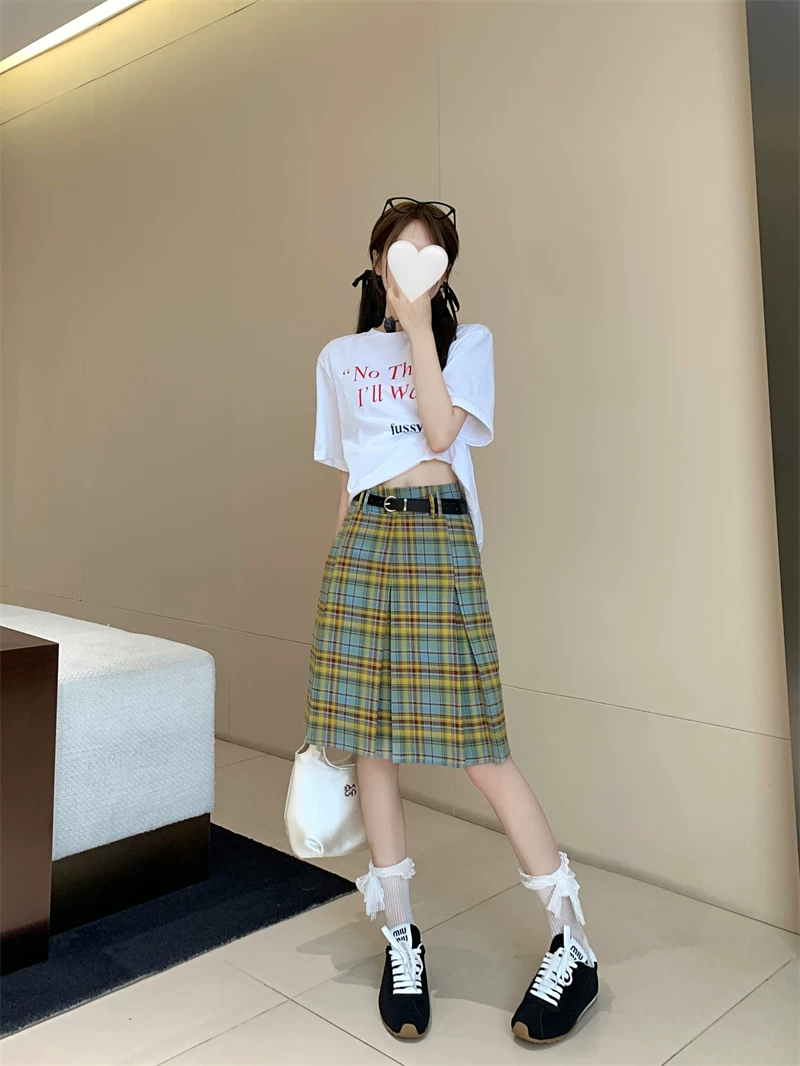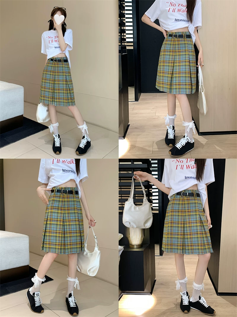 - Váy xếp ly lưng cao phong cách preppy cỡ lớn, váy kẻ sọc xanh vàng mùa hè dành cho nữ, váy dài vừa vặn dáng chữ A giúp thon gọn