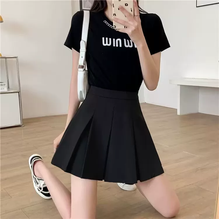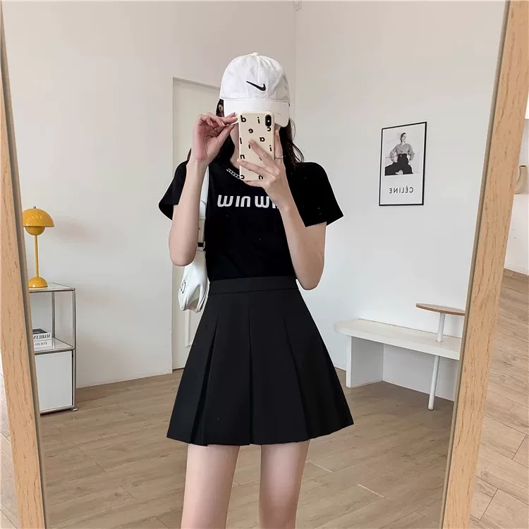 Váy xếp ly màu đen cỡ lớn, váy ngắn chữ A mùa xuân hè dành cho nữ, váy cạp cao kiểu đại học, giúp thon gọn và che bụng.