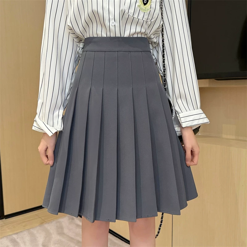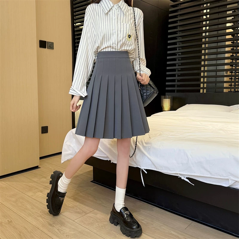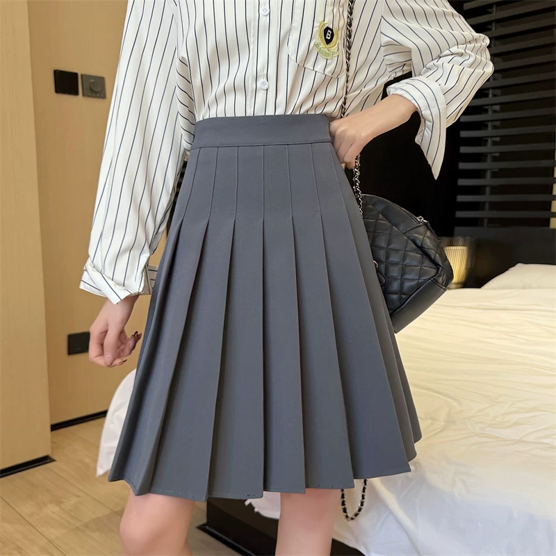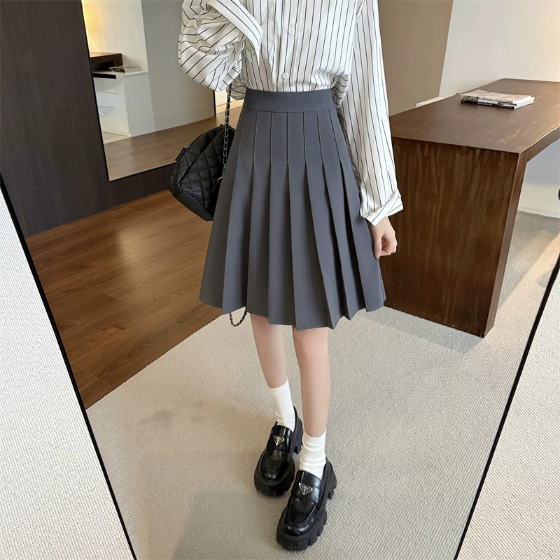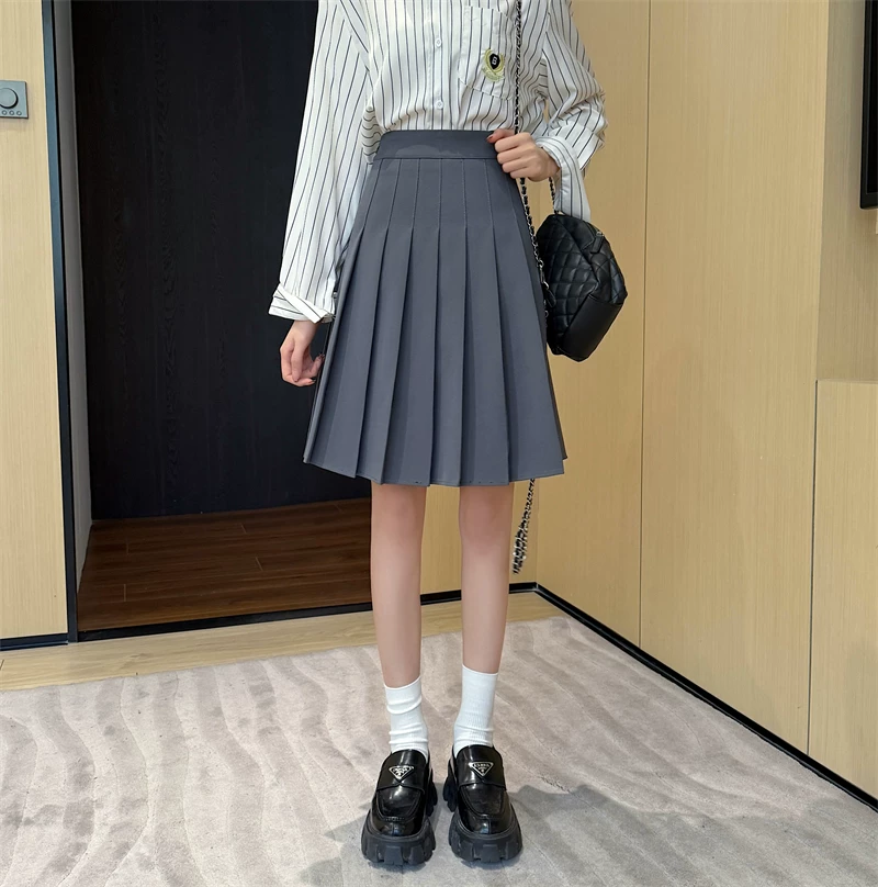 - Váy xếp ly màu xám cực dài dành cho nữ, mùa xuân hè, lưng cao, tôn dáng, váy chữ A phong cách preppy, chống lộ, váy dài vừa phải.