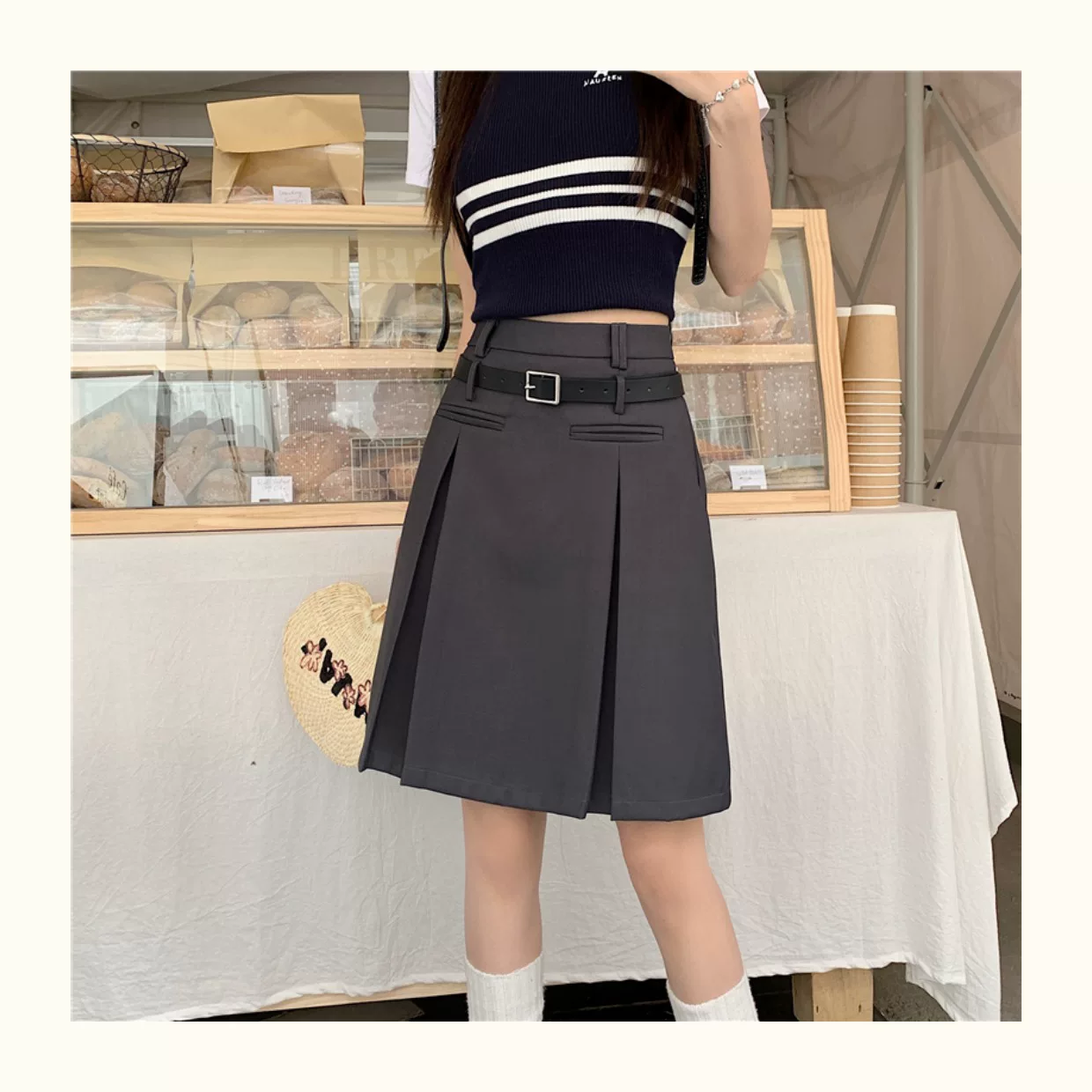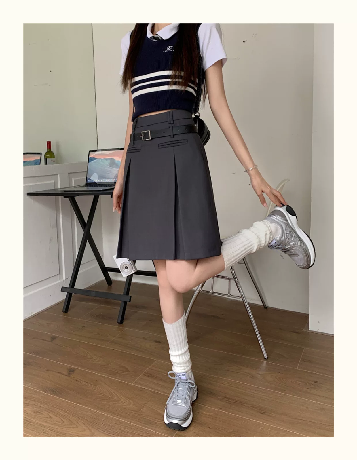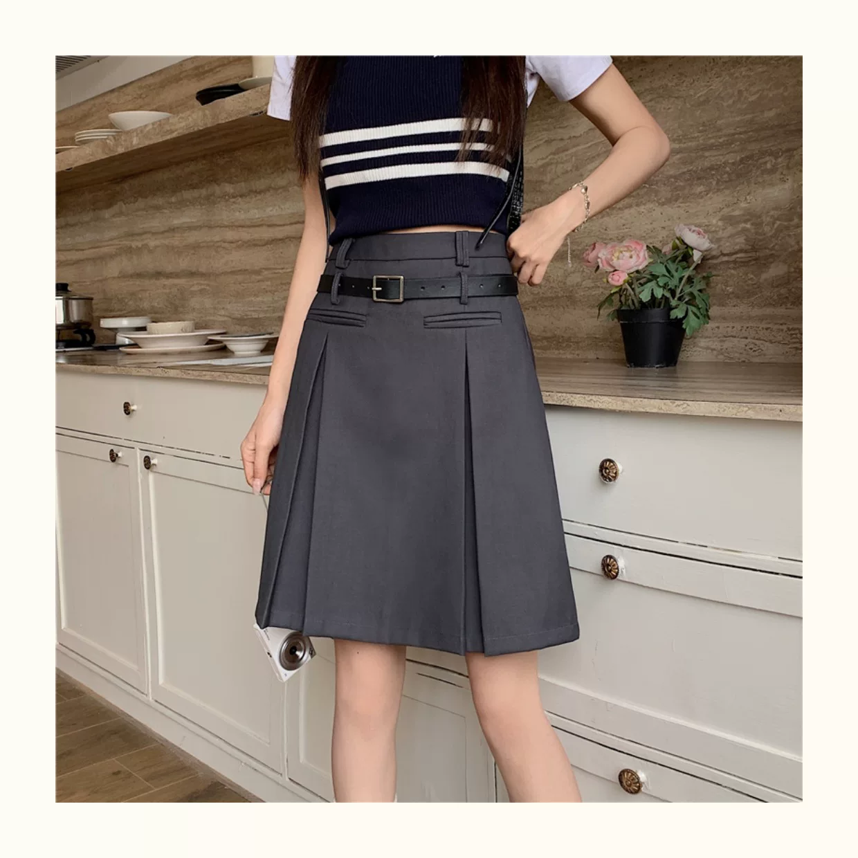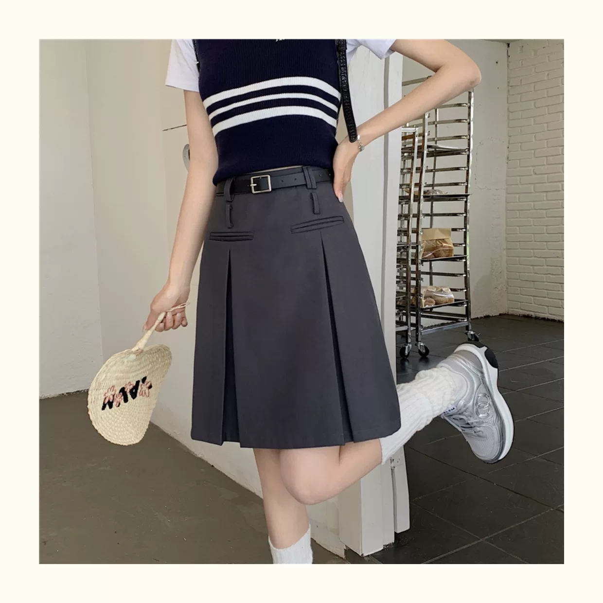 - Váy xếp ly màu xám dành cho nữ, dài vừa phải, mùa hè, lưng cao, váy chữ A thon gọn, cỡ lớn, che tay và bụng, váy midi, quần váy.