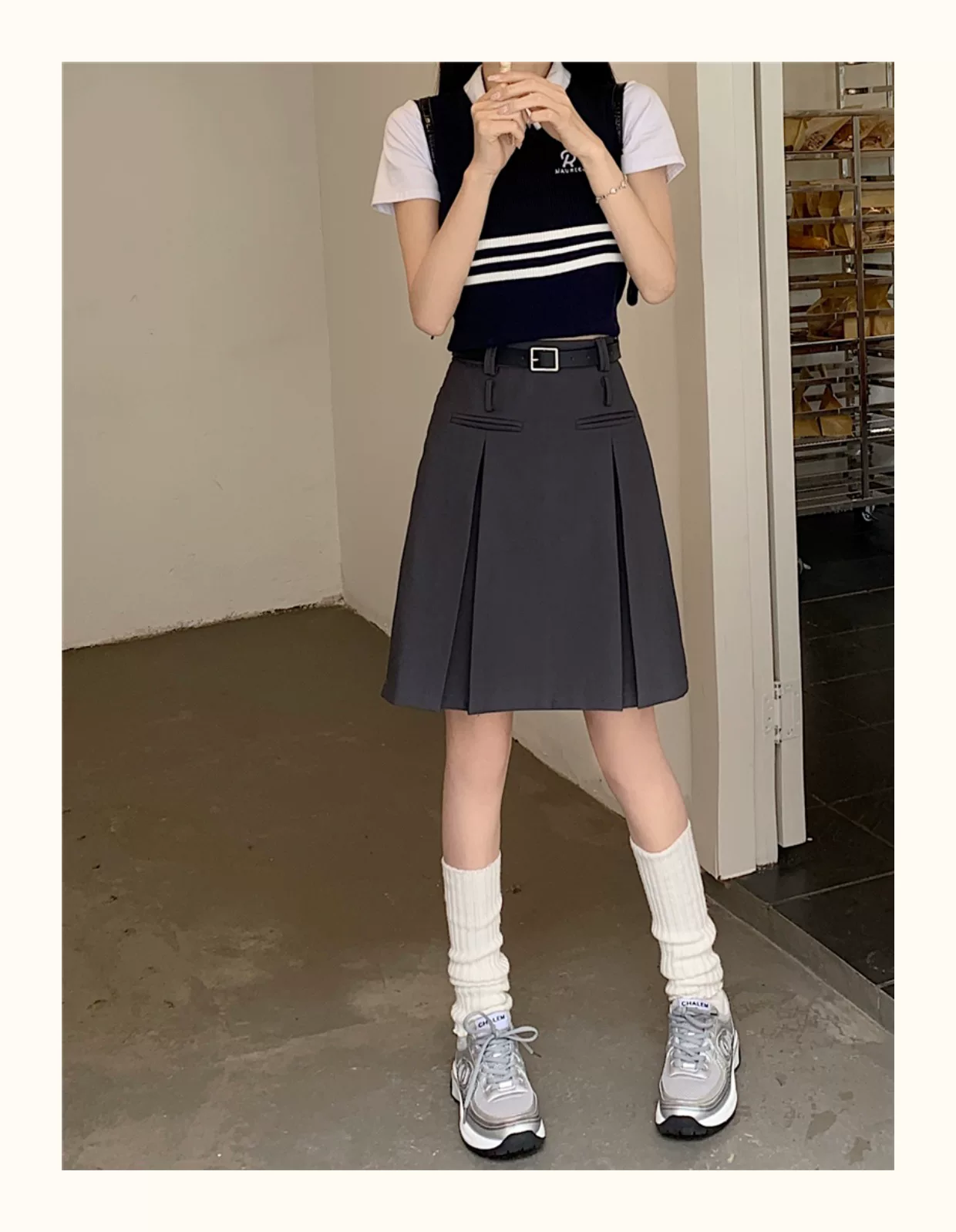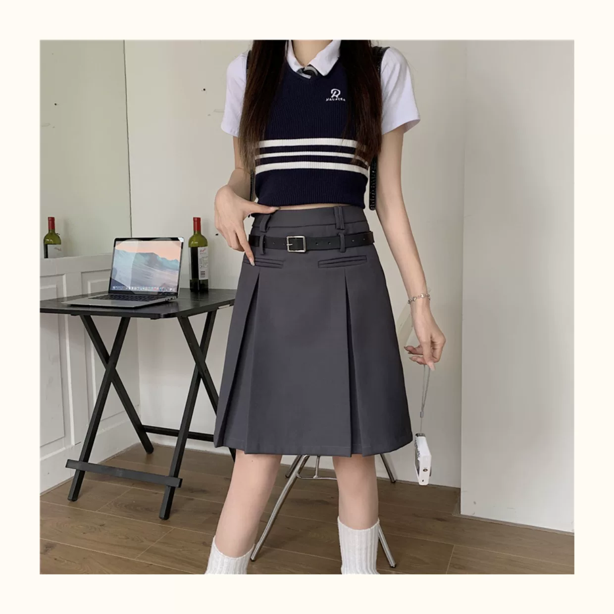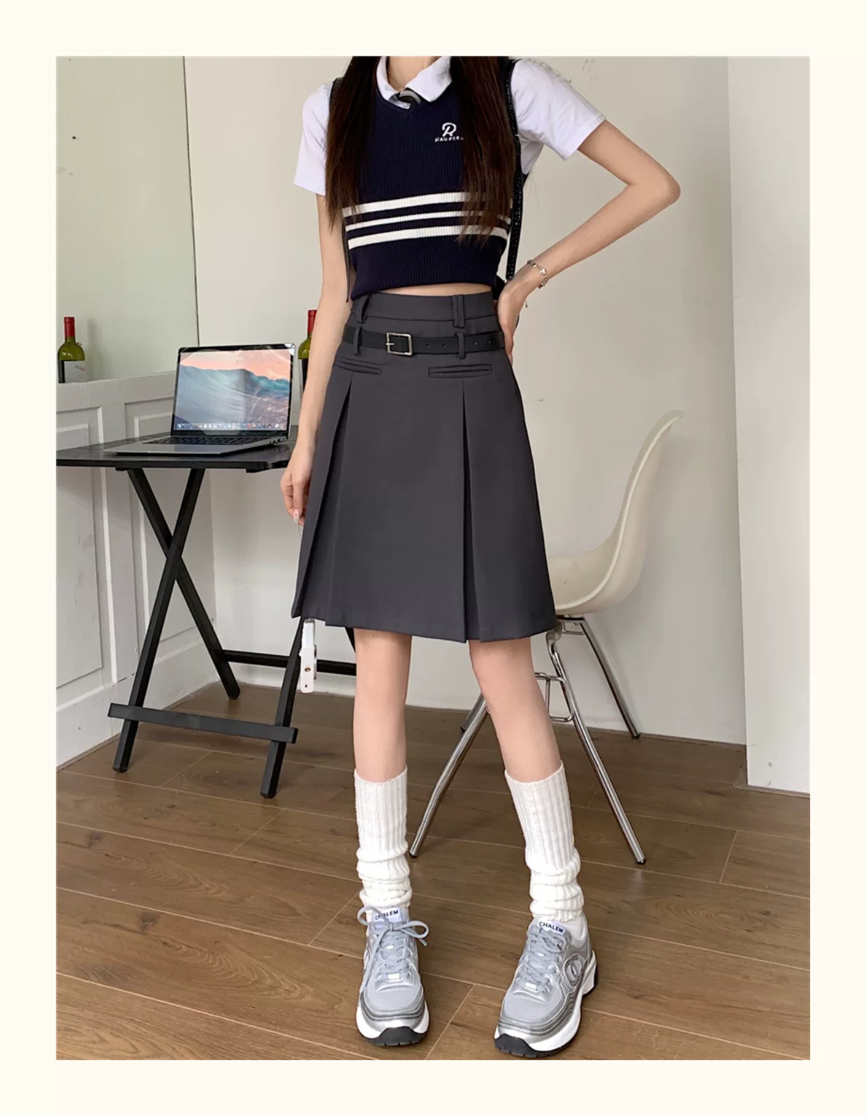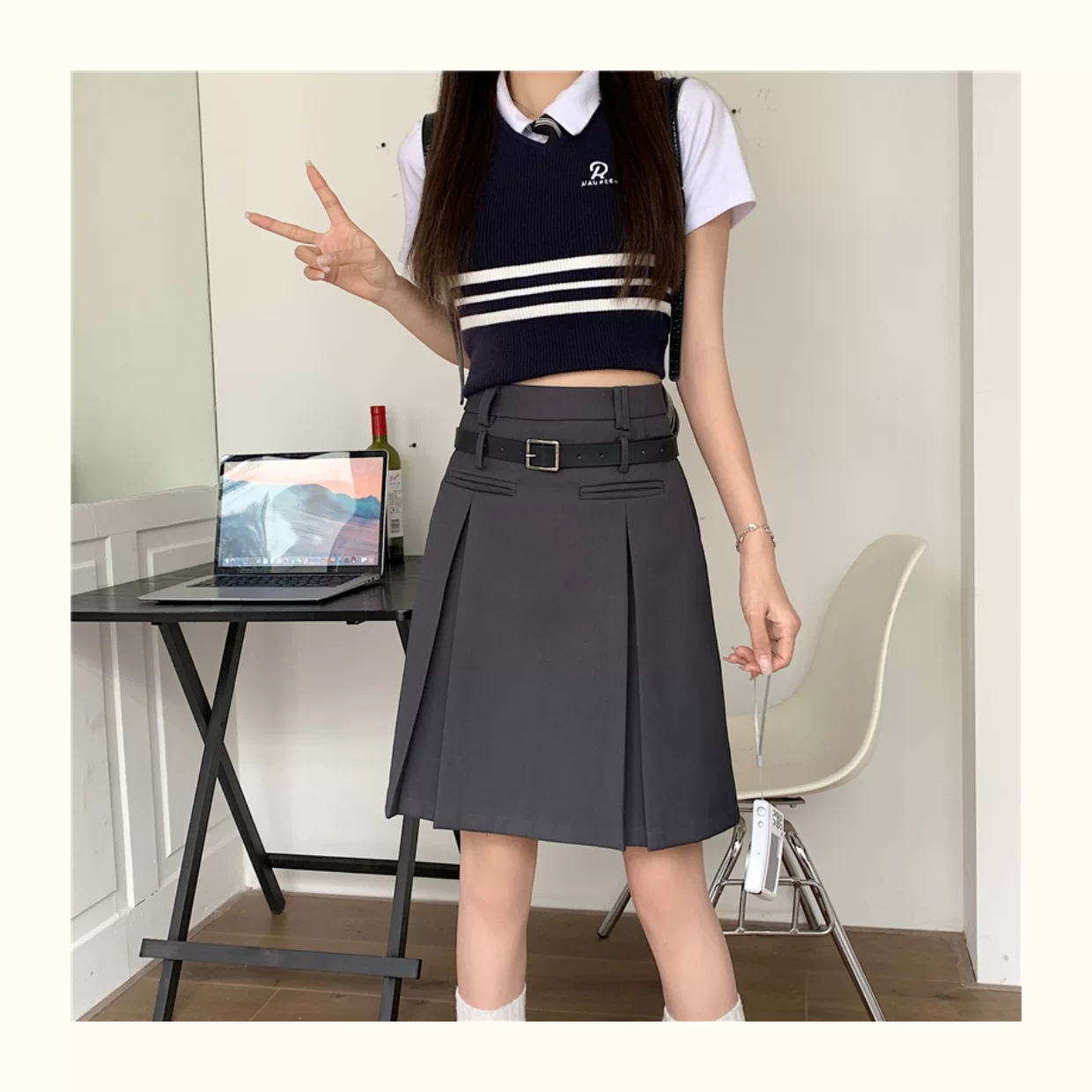 - Váy xếp ly màu xám dành cho nữ, dài vừa phải, mùa hè, lưng cao, váy chữ A thon gọn, cỡ lớn, che tay và bụng, váy midi, quần váy.