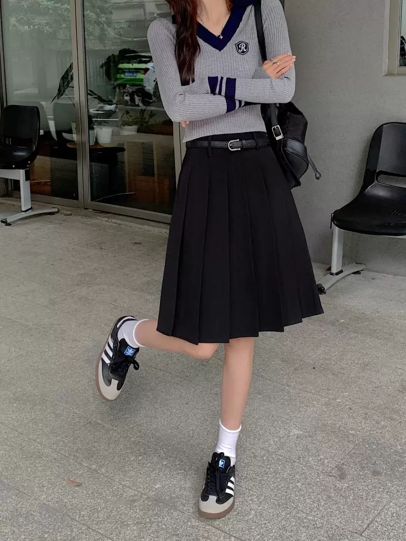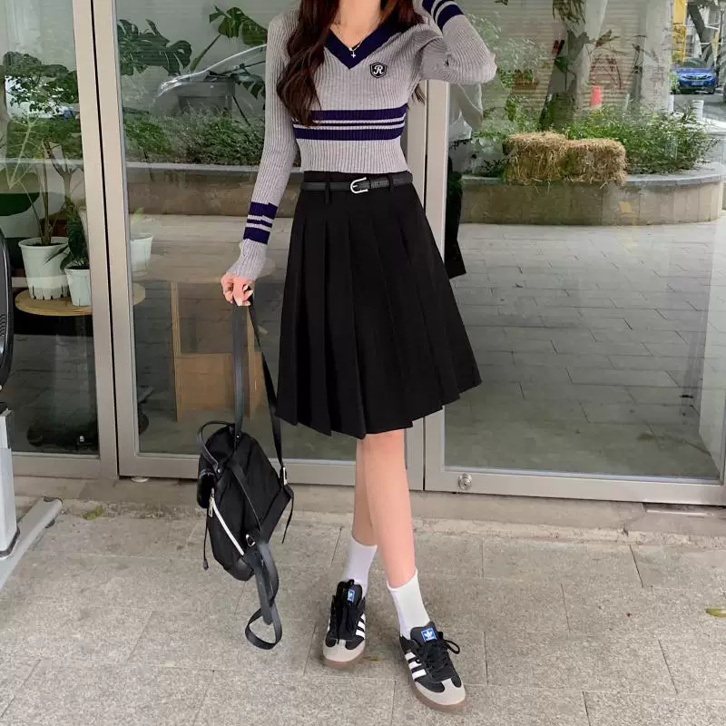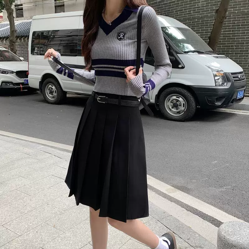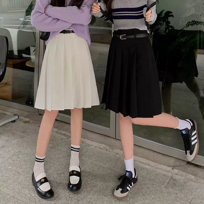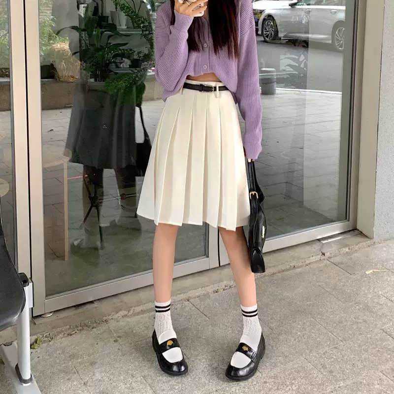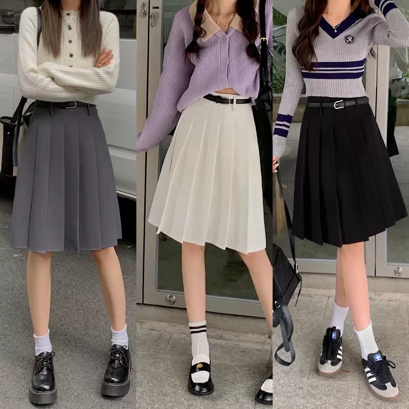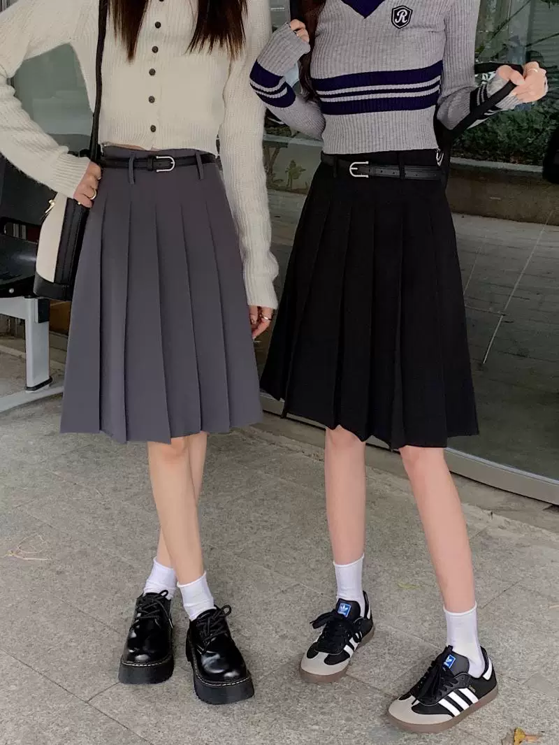 - Váy xếp ly màu xám dành cho nữ, mùa xuân hè, dài vừa phải, cỡ lớn, lưng cao, tôn dáng, váy chữ A phồng, váy kiểu preppy.