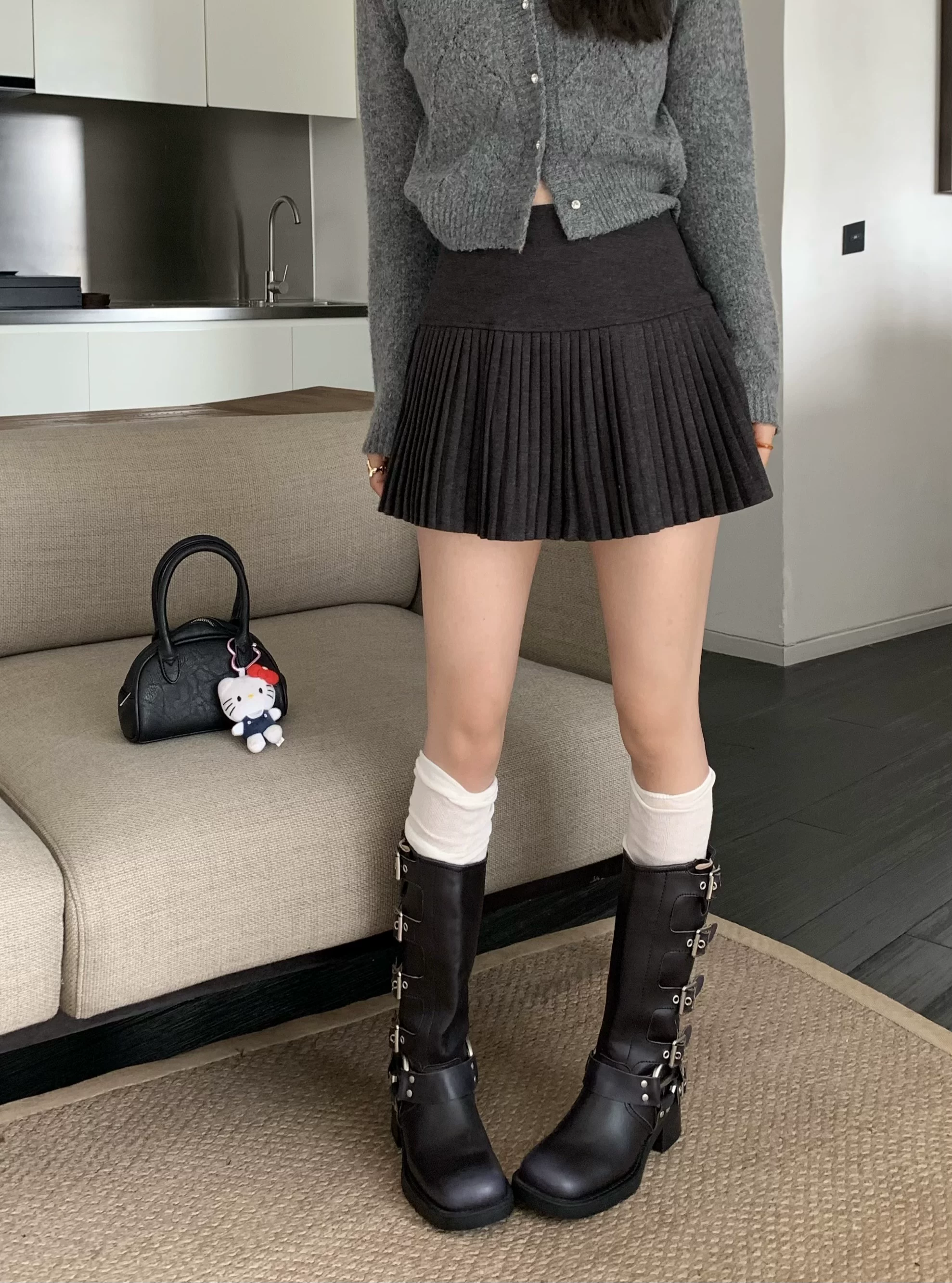 Váy xếp ly màu xám dày cho mùa thu đông, cỡ lớn, che hông, dáng chữ A, váy ngắn chống lộ, váy len cỡ nhỏ, cạp cao.