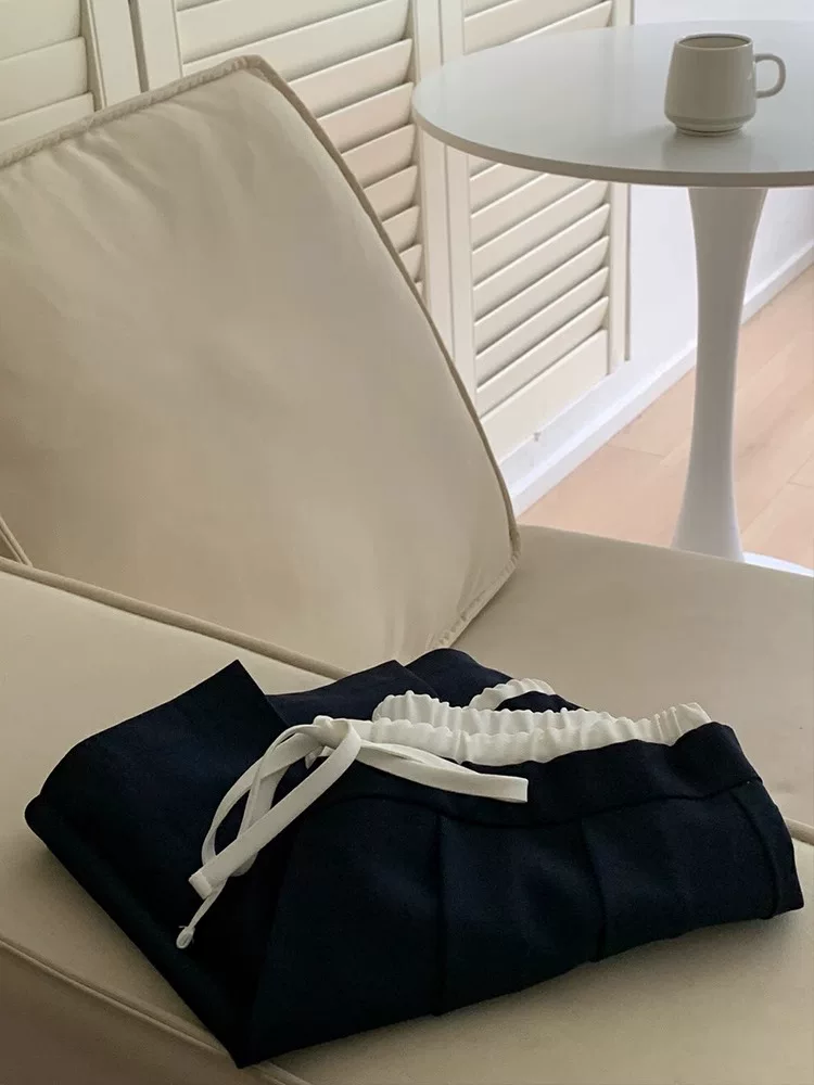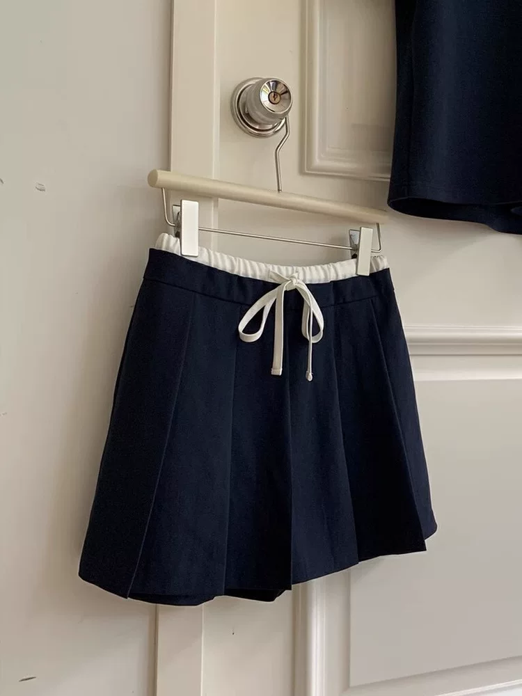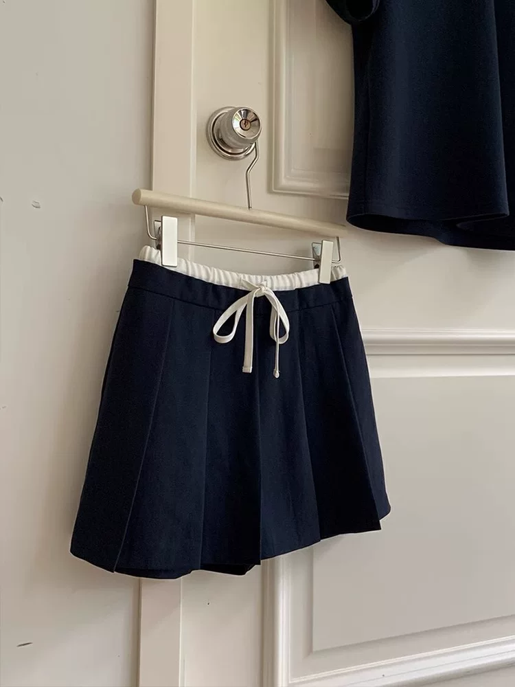 Váy xếp ly màu xanh hải quân dành cho nữ, phong cách Hàn Quốc, cỡ lớn, váy ngắn lưng thun có dây rút, váy chữ A cạp cao, chống lộ.
