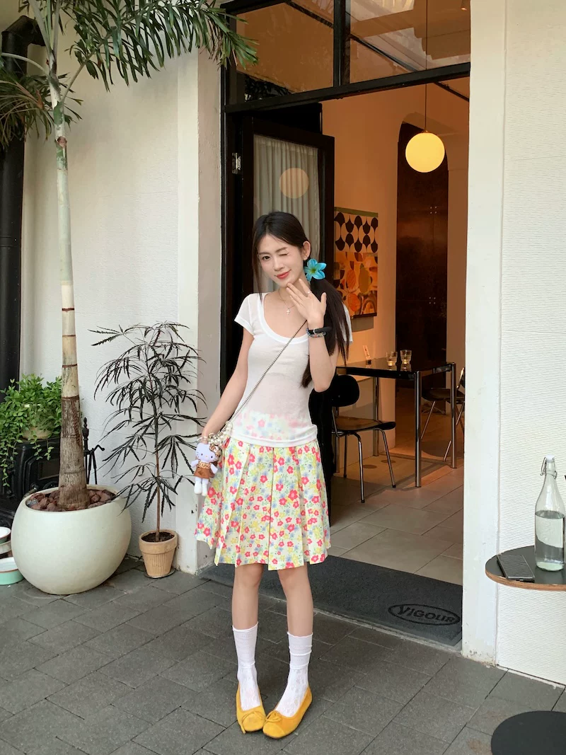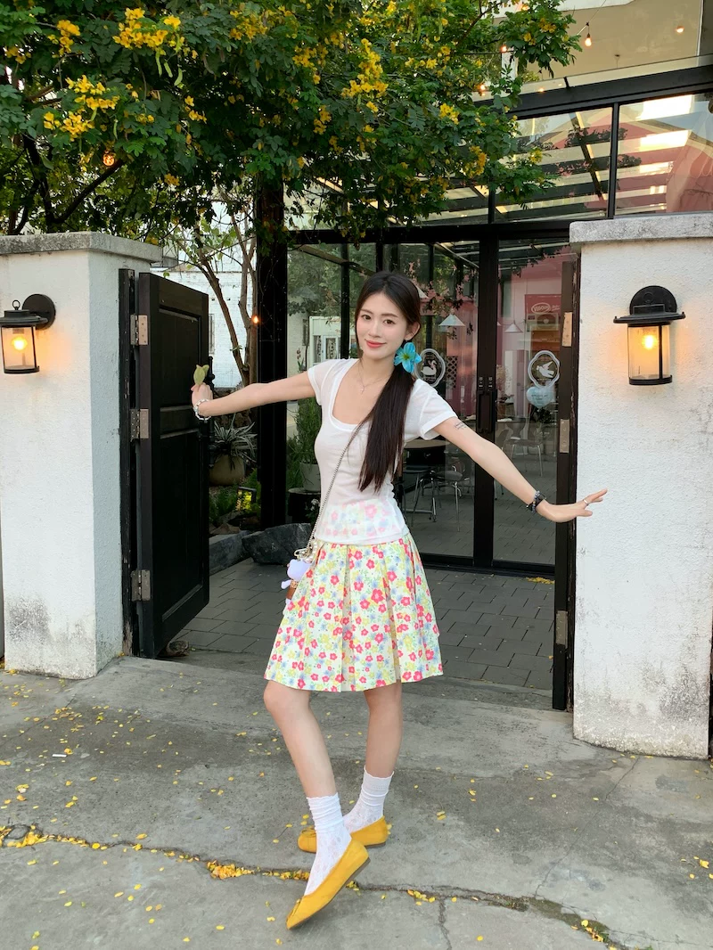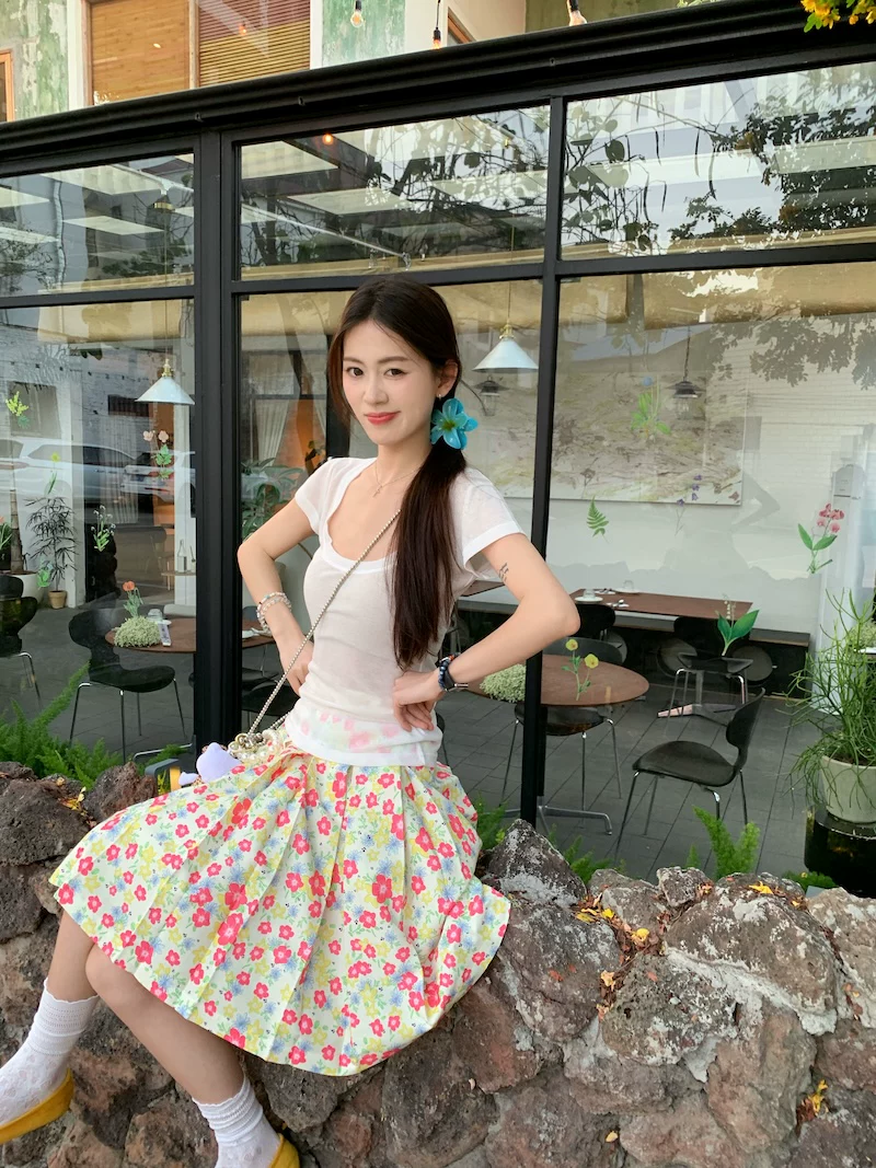 Váy xếp ly phong cách hoa tươi mát, váy nữ dáng dài trung bình, cạp cao, tôn dáng, size lớn, mùa hè, kiểu dáng chữ A