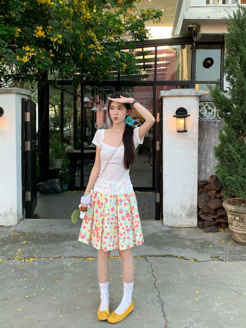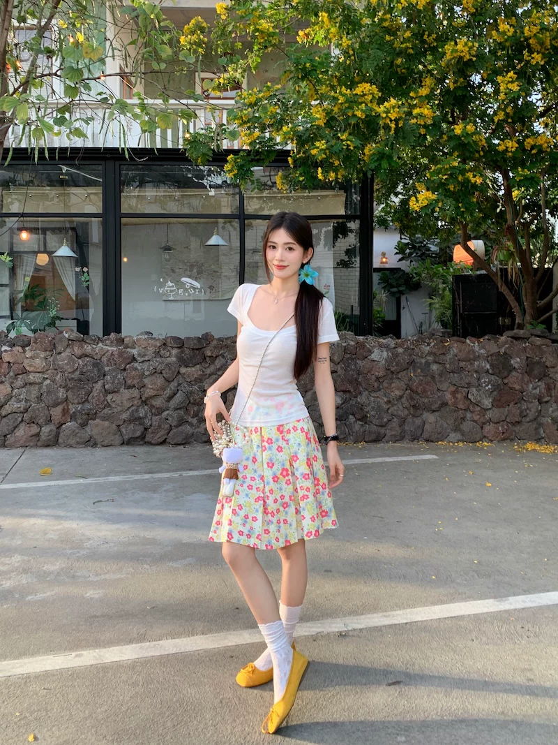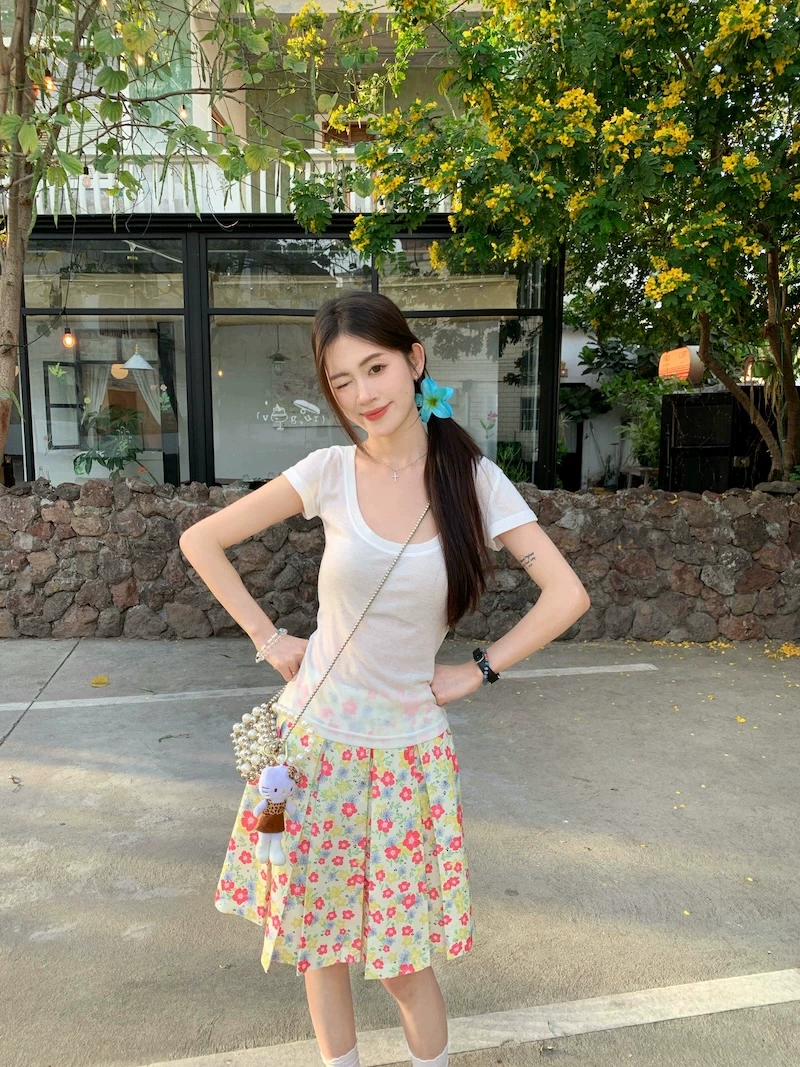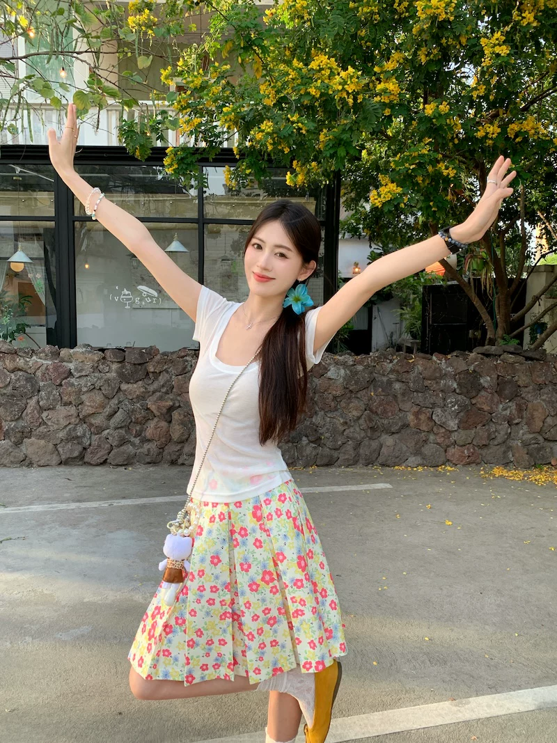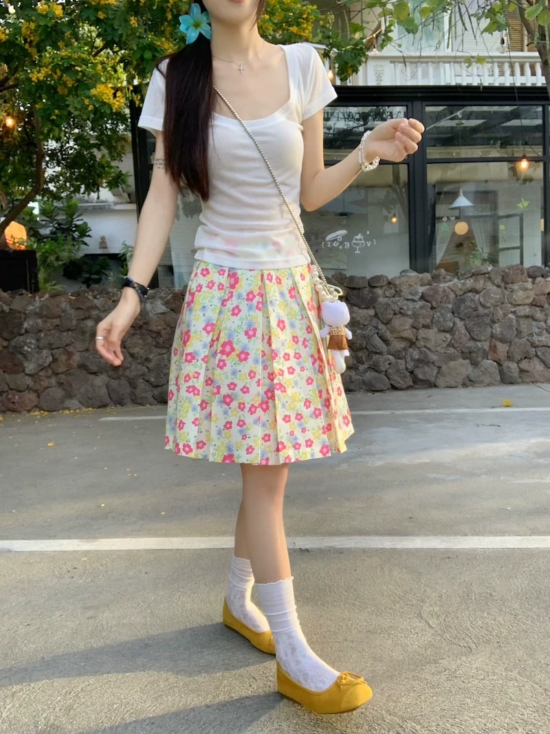- Váy xếp ly phong cách hoa tươi mát, váy nữ dáng dài trung bình, cạp cao, tôn dáng, size lớn, mùa hè, kiểu dáng chữ A