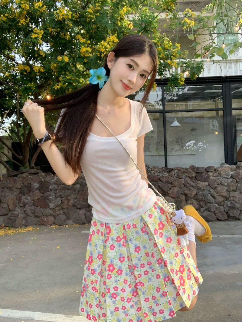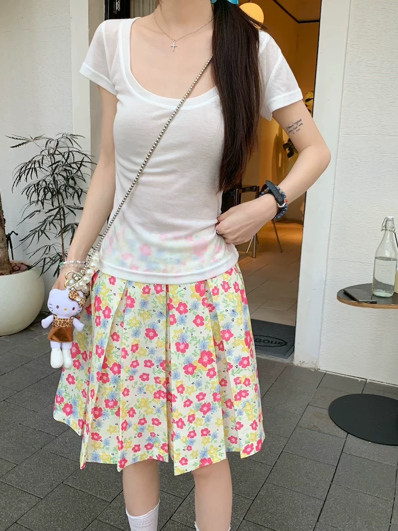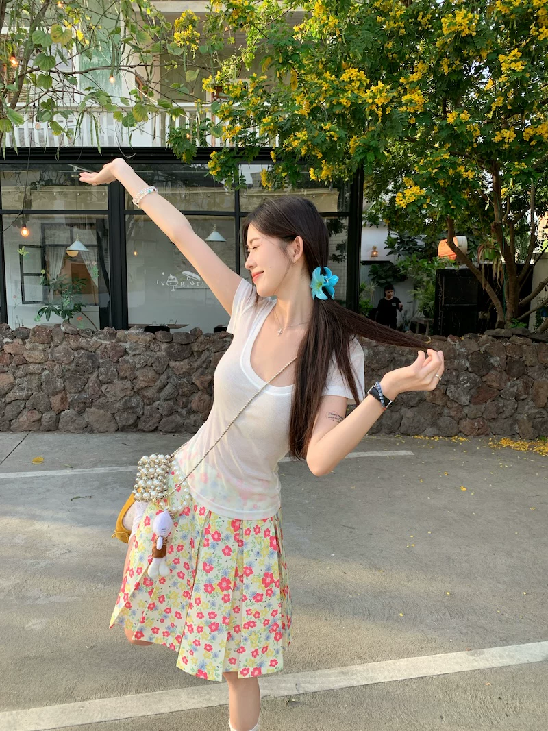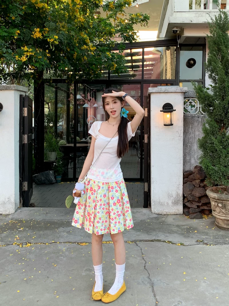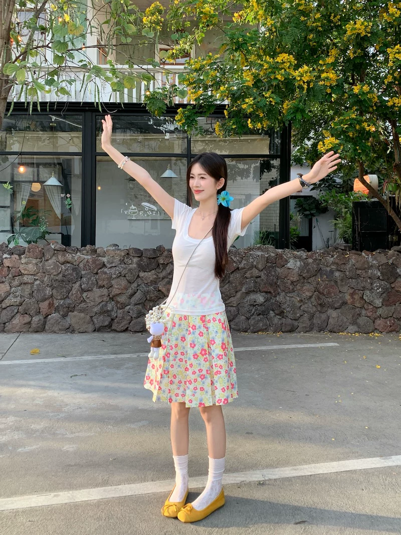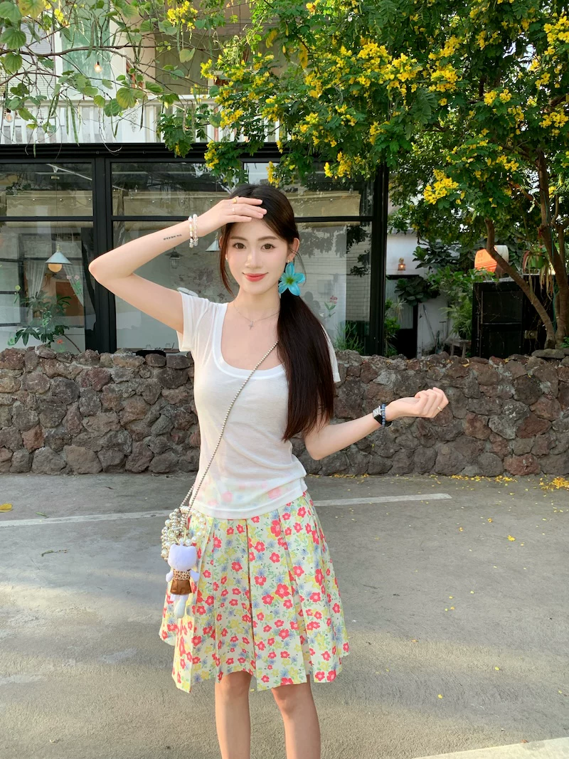 - Váy xếp ly phong cách hoa tươi mát, váy nữ dáng dài trung bình, cạp cao, tôn dáng, size lớn, mùa hè, kiểu dáng chữ A