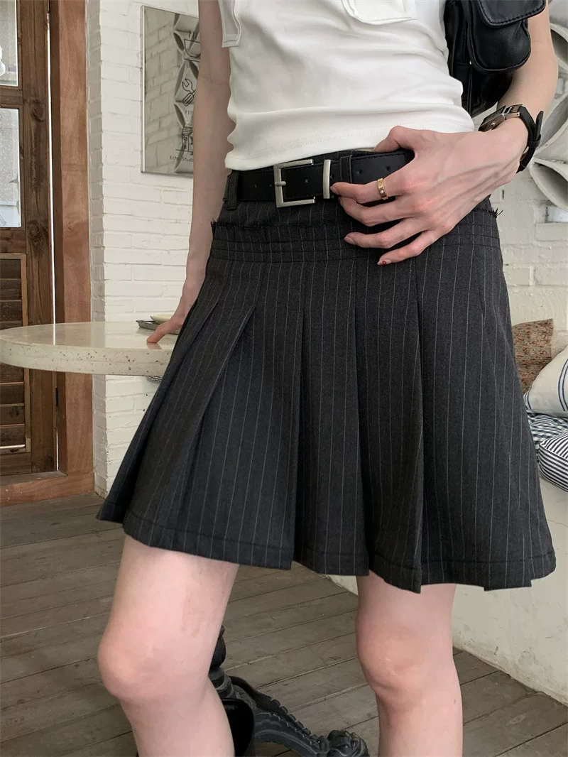 Váy xếp ly sọc xám cỡ lớn dành cho nữ, váy ngắn kiểu học sinh lưng cao mùa hè, váy chữ A chống lộ.
