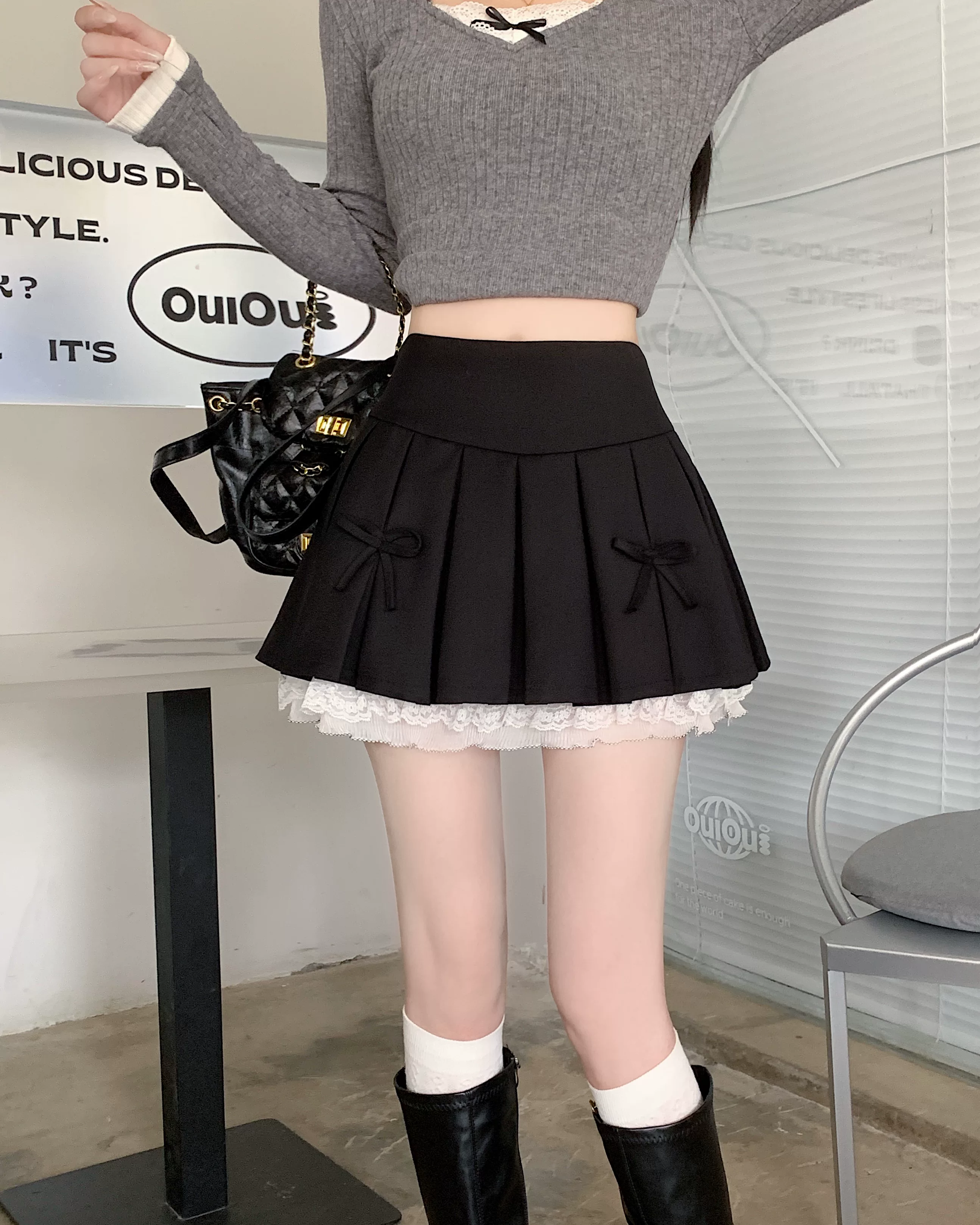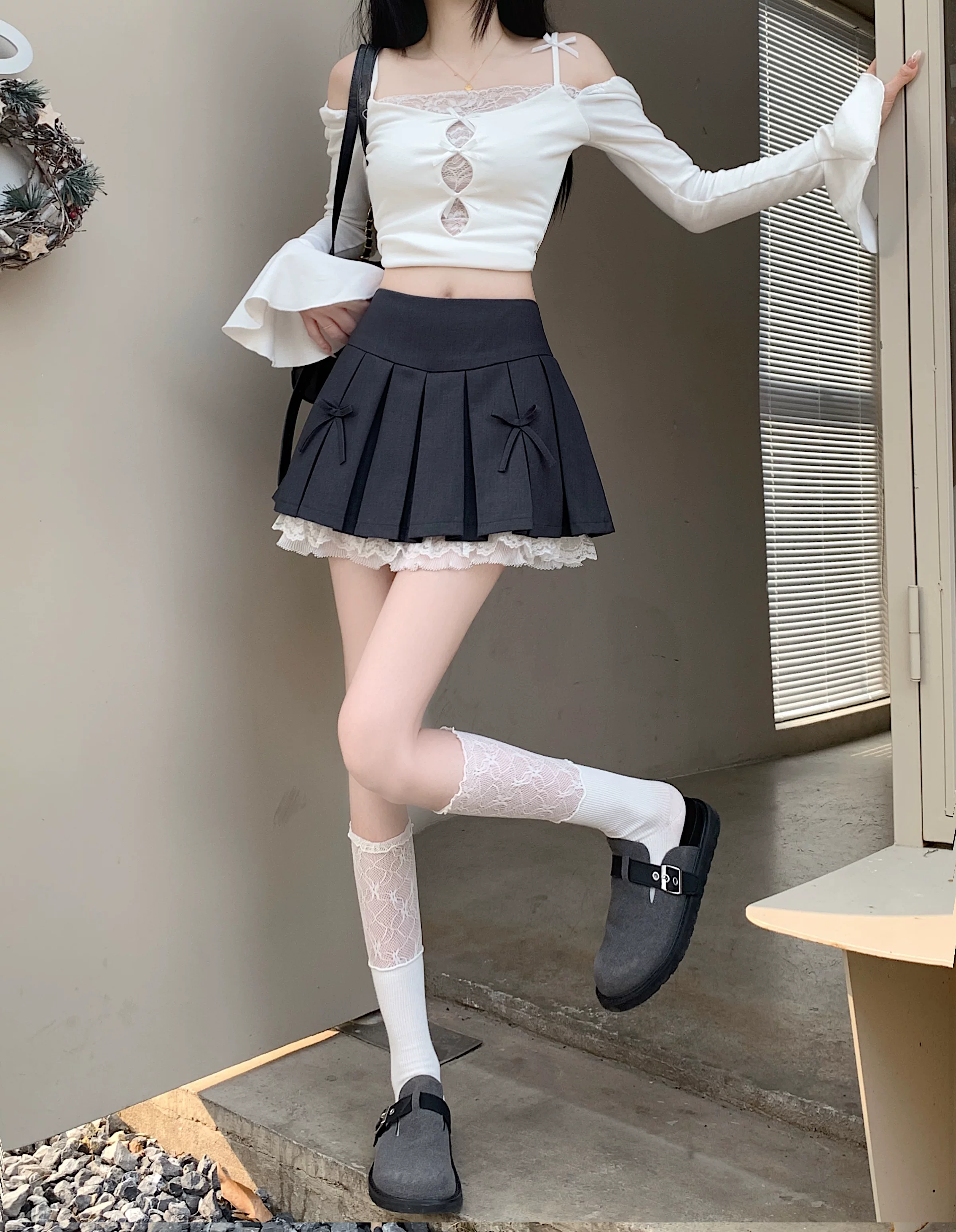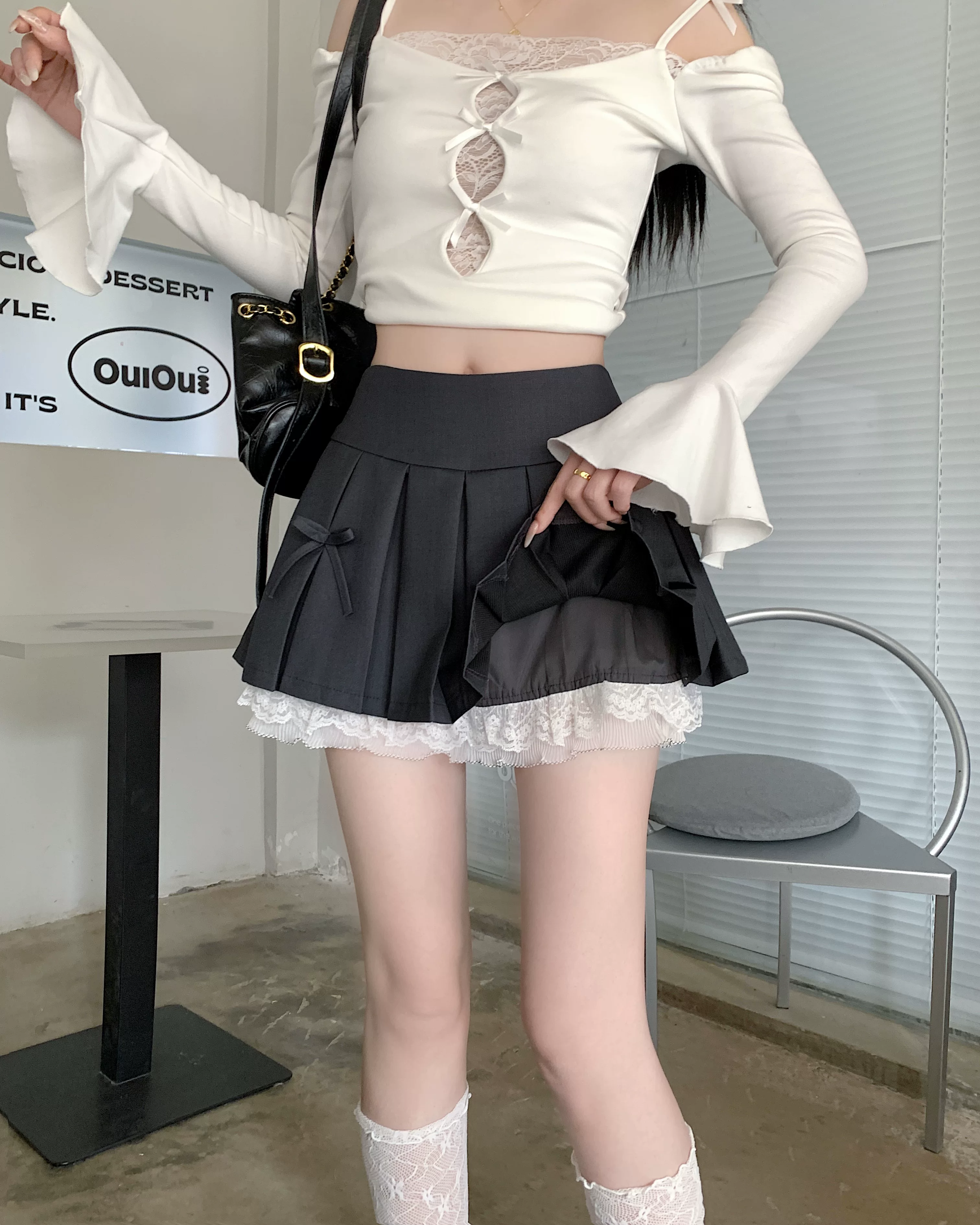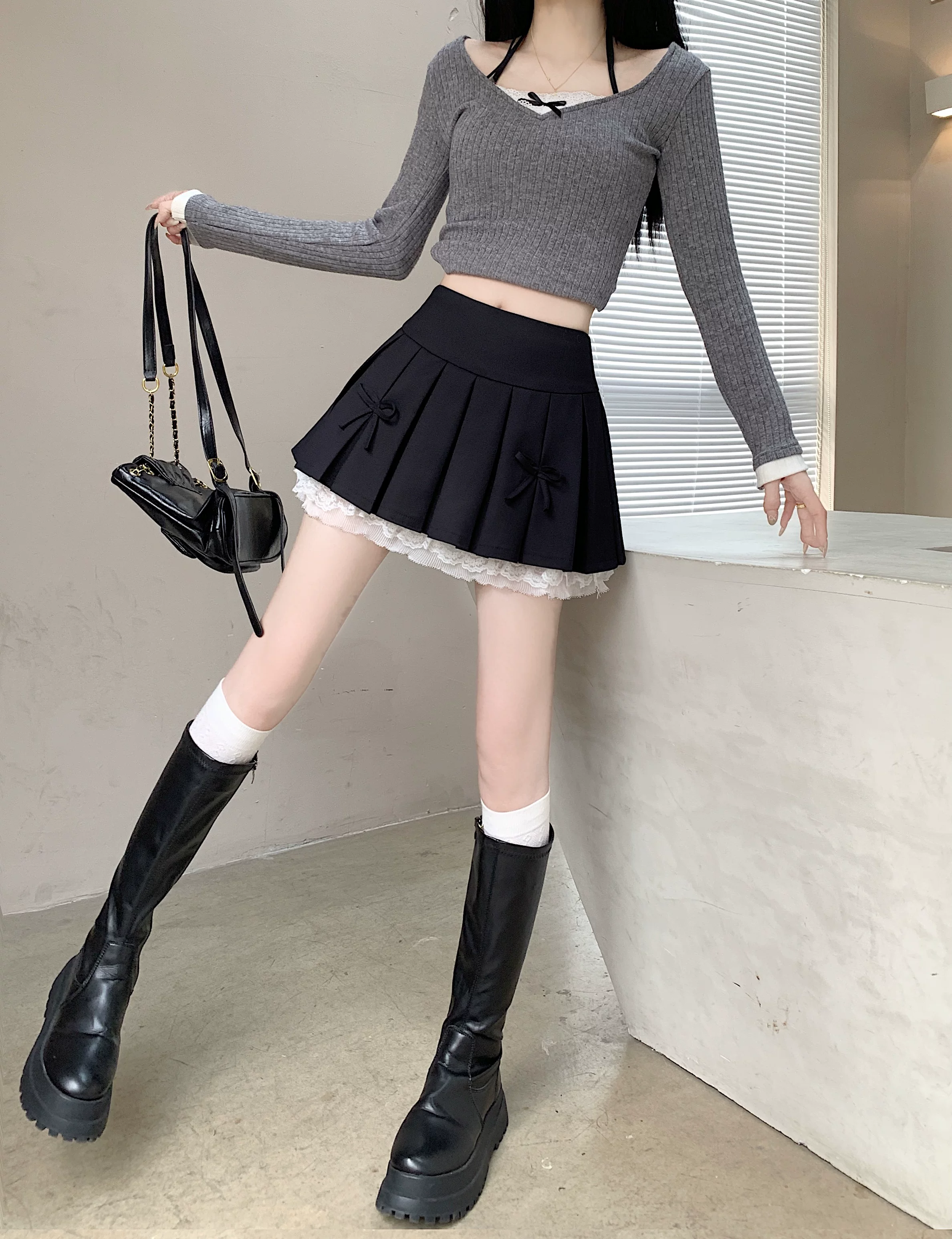 - Váy xòe phối ren cỡ lớn dành cho nữ, thiết kế mùa hè, váy xếp ly nơ màu xám, váy ngắn chữ A lưng cao.
