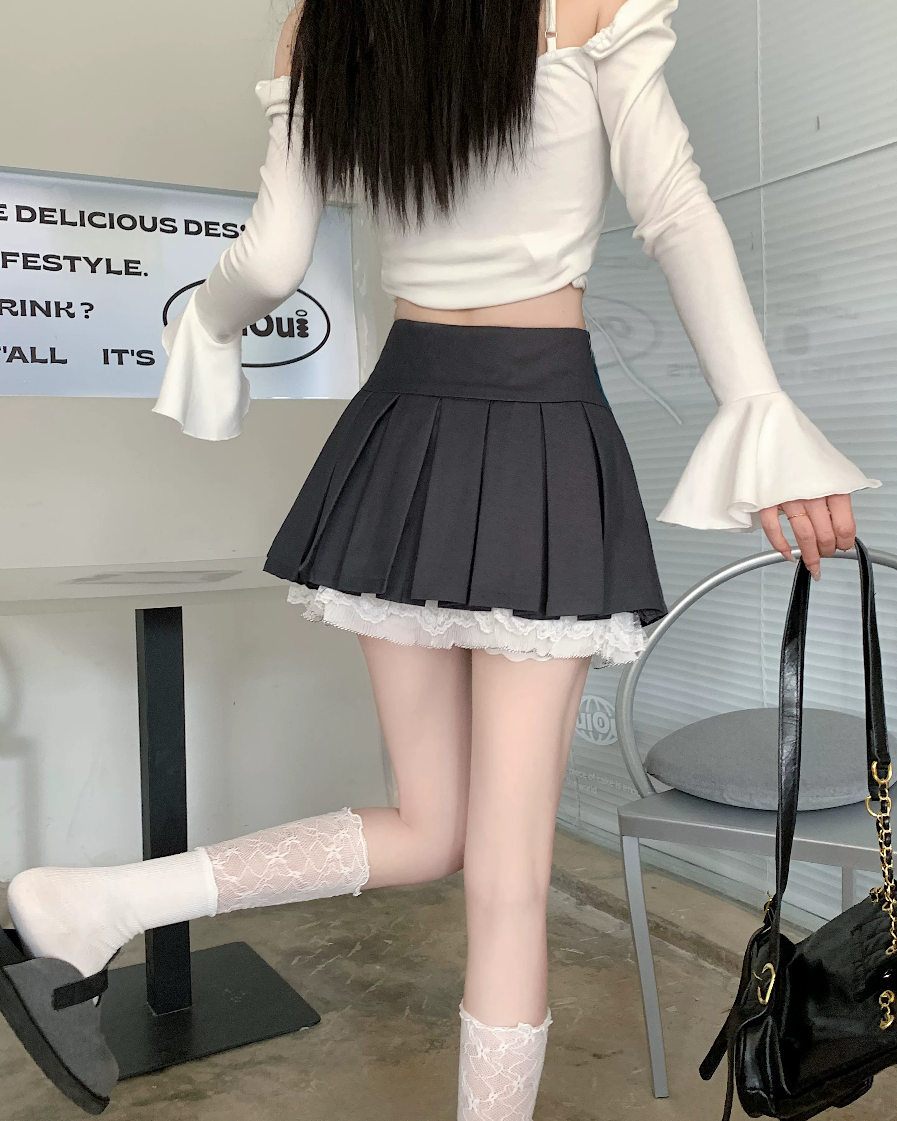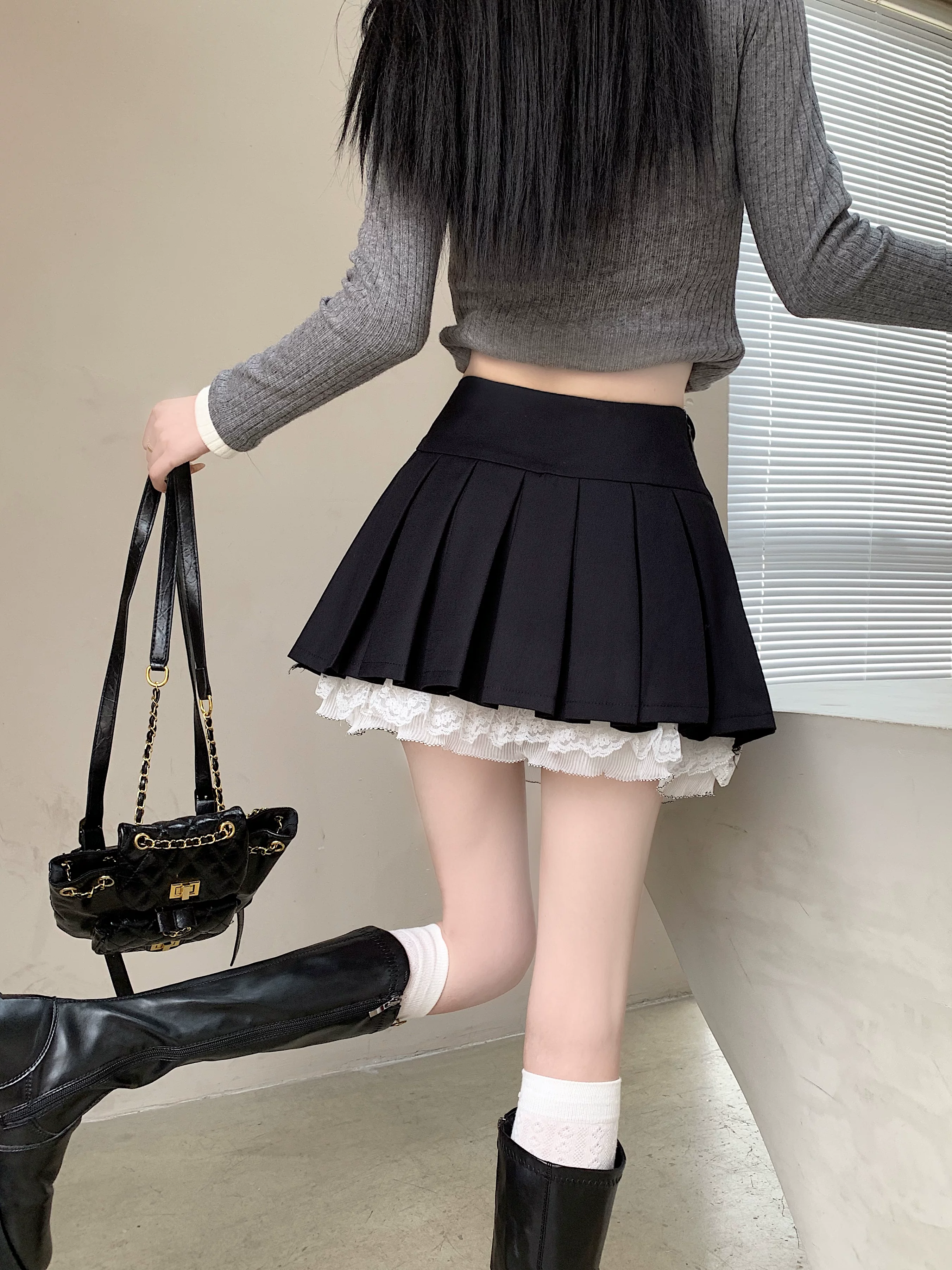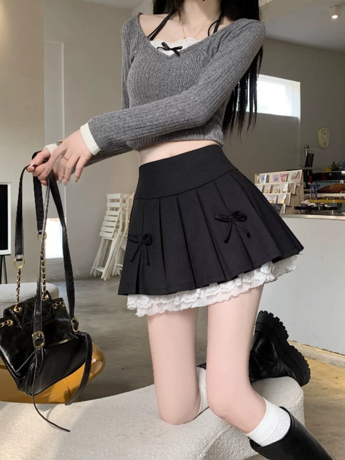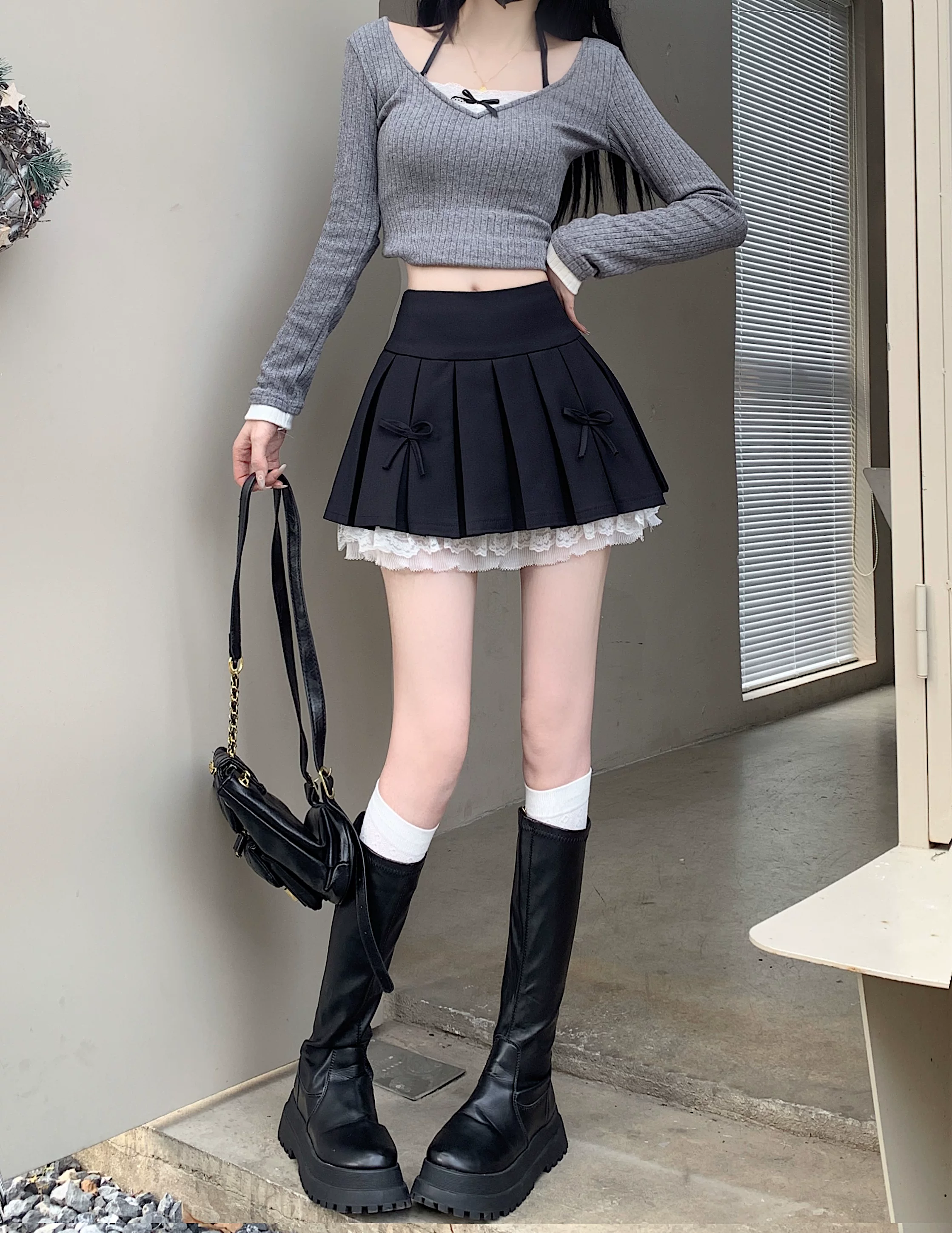 - Váy xòe phối ren cỡ lớn dành cho nữ, thiết kế mùa hè, váy xếp ly nơ màu xám, váy ngắn chữ A lưng cao.