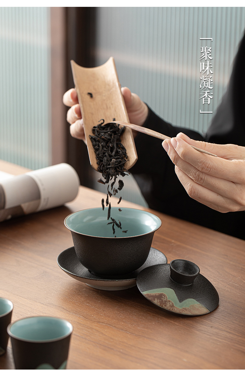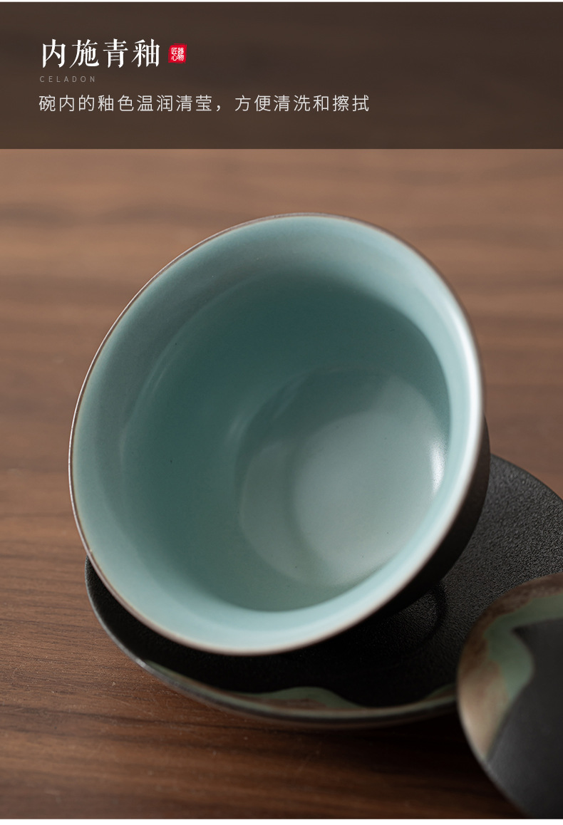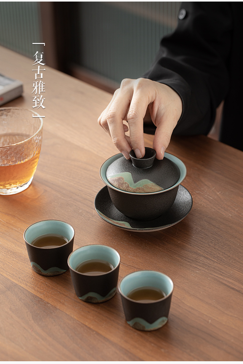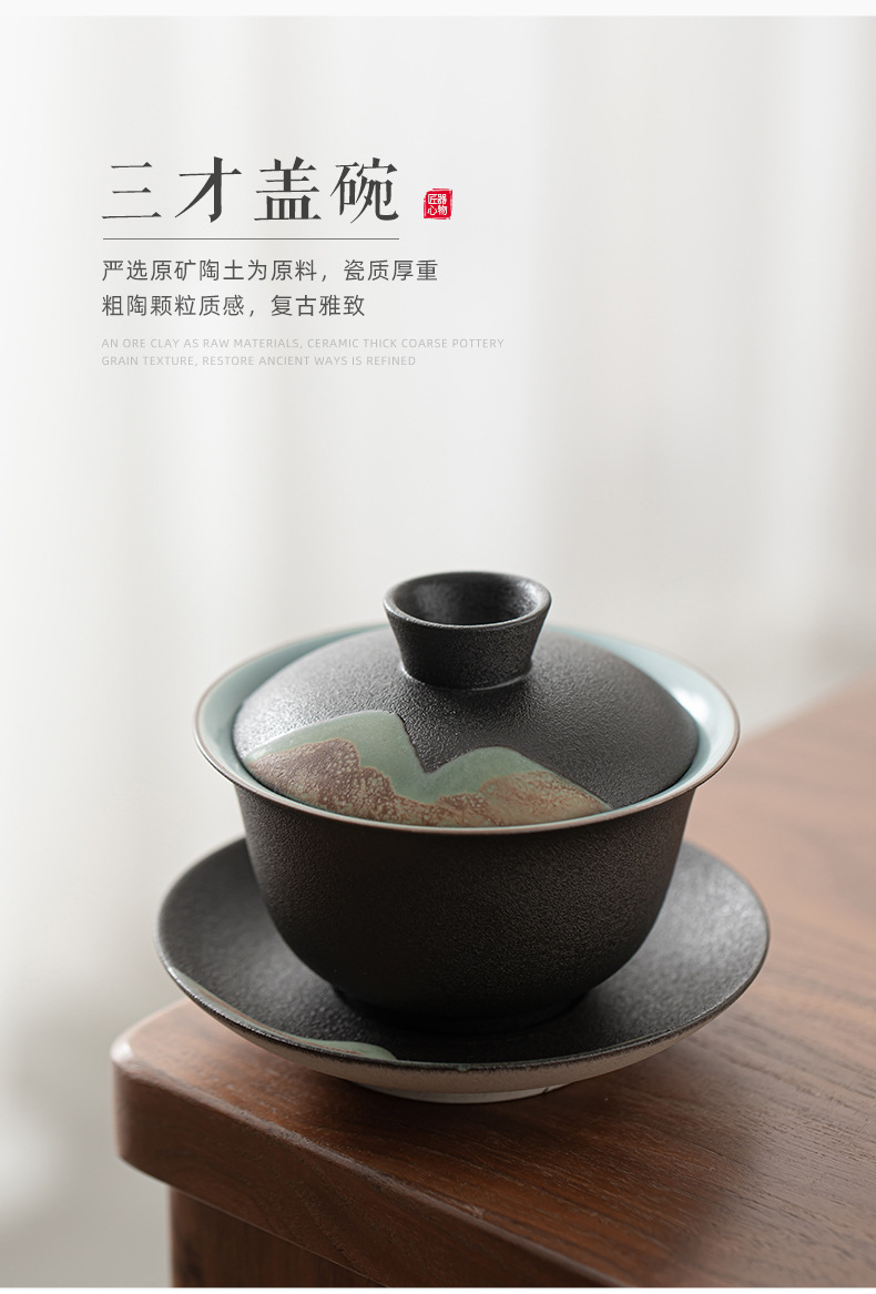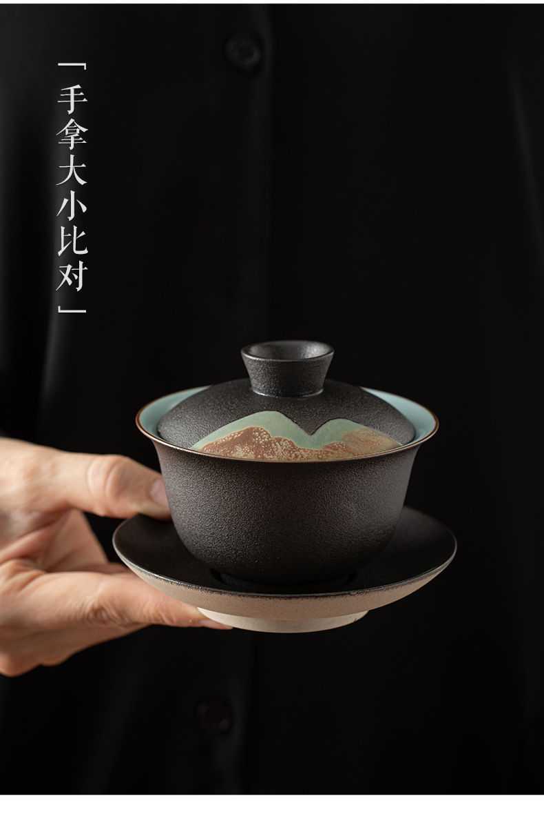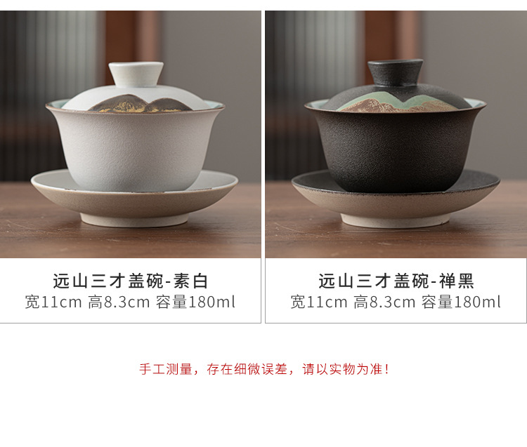 Vẽ tay núi xa Sancai có nắp bát gốm sứ Kung Fu bộ trà chén chén trà chén gốm thô dụng cụ pha trà cầm tay gia dụng